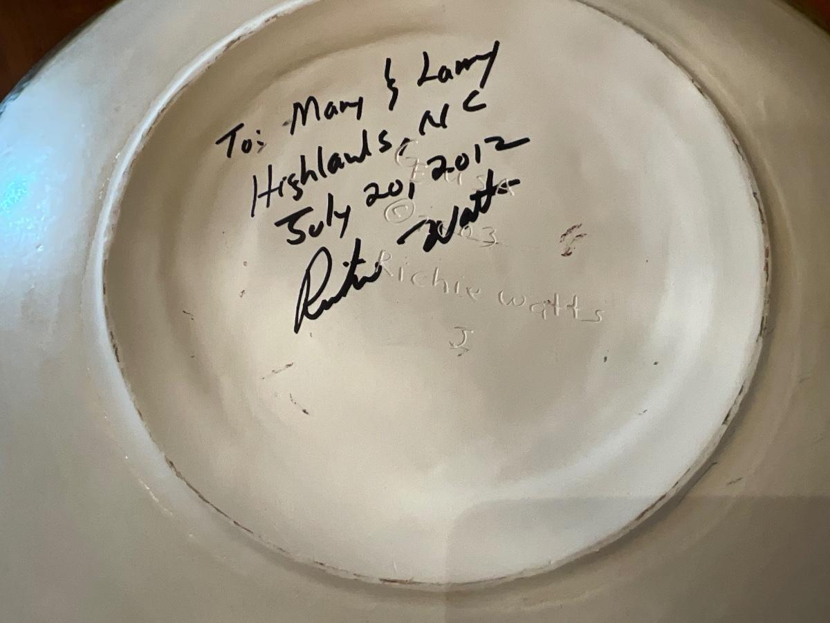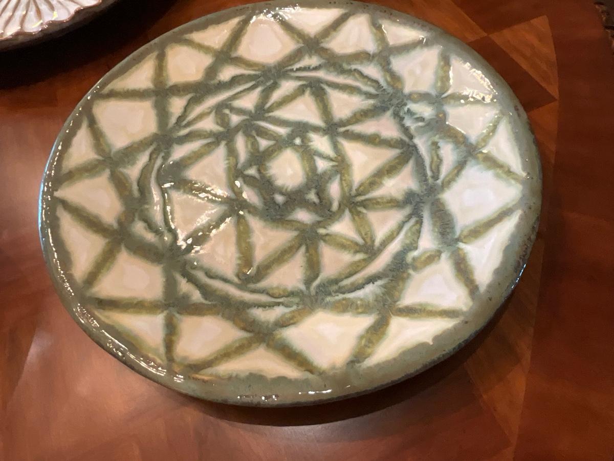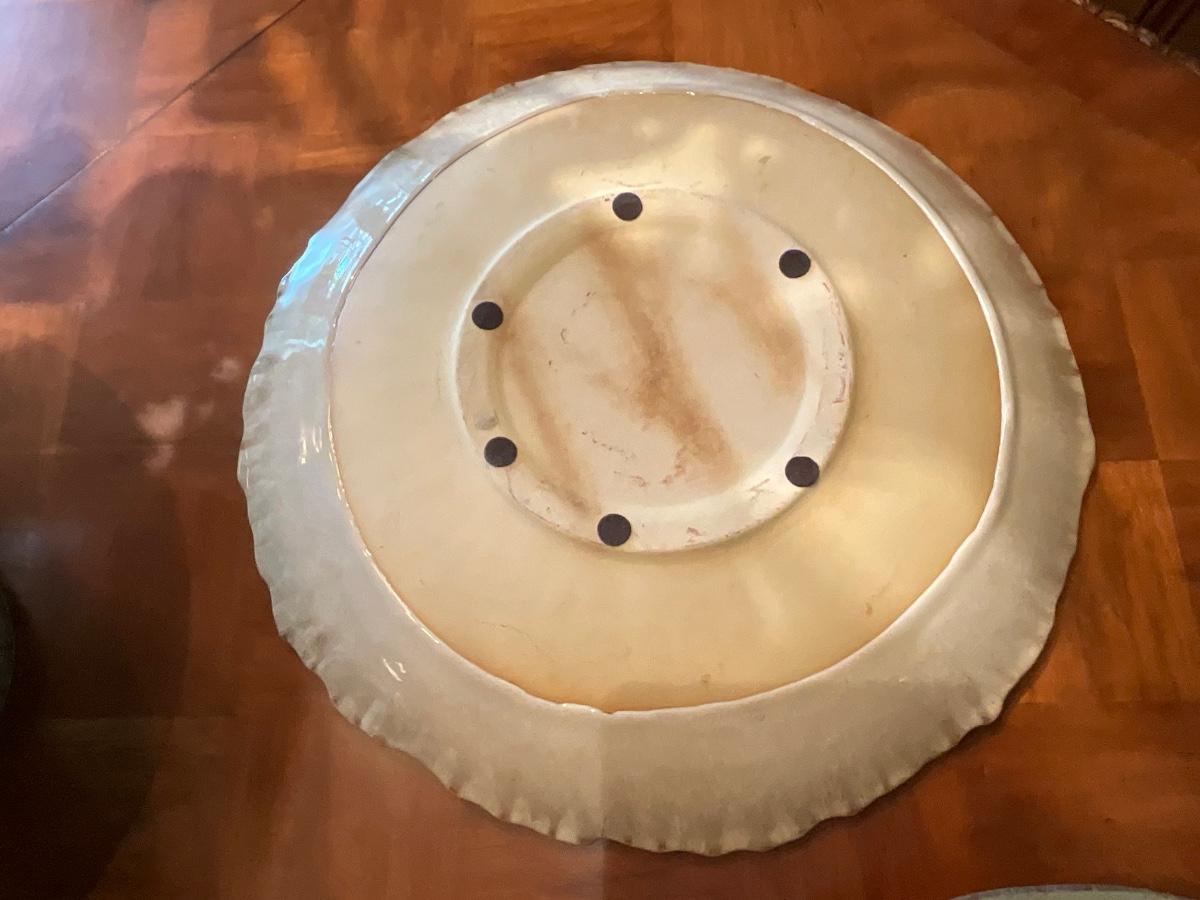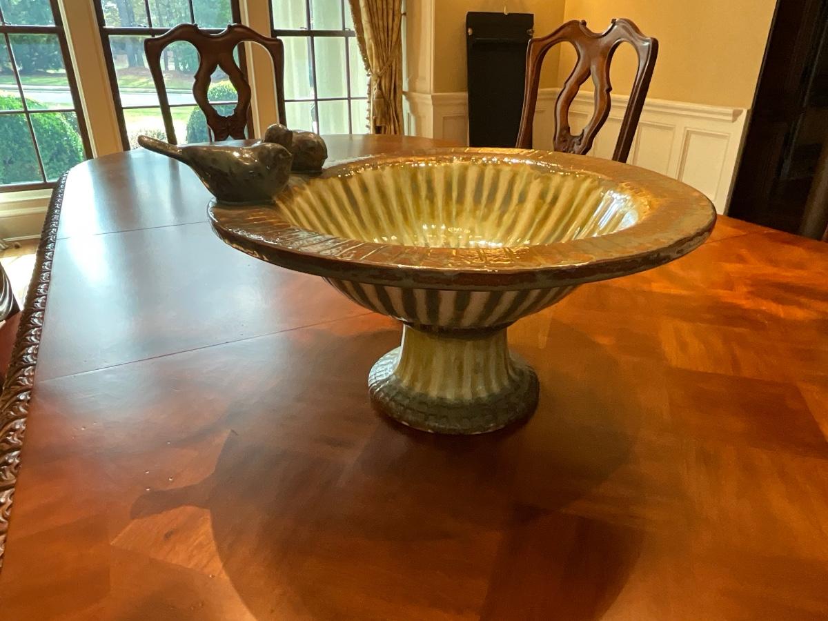 Green Decorative Plate 17”R and 2” T, Bird bowl 8” T and 16” R and Tan & Coffee color plate is 18”R and 2.5” T