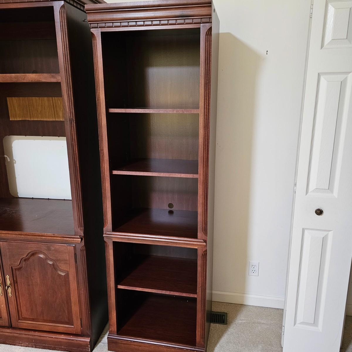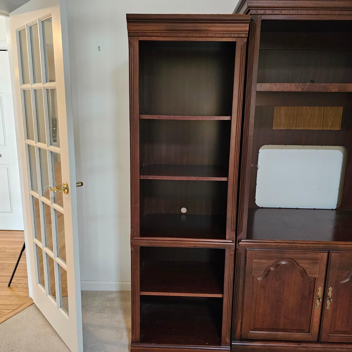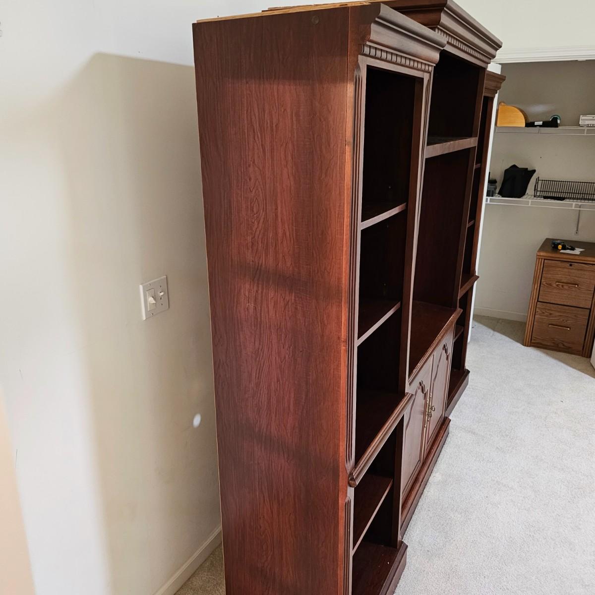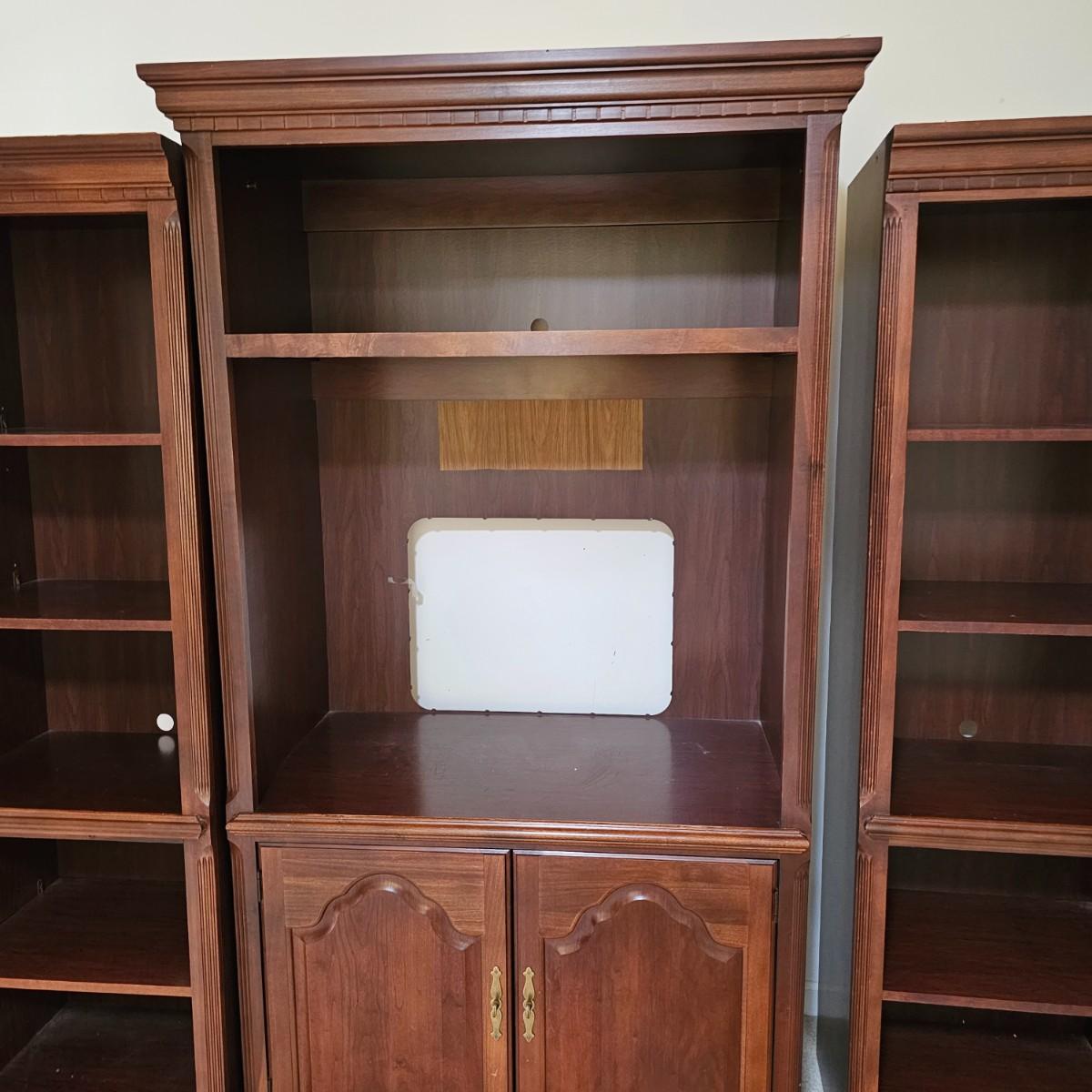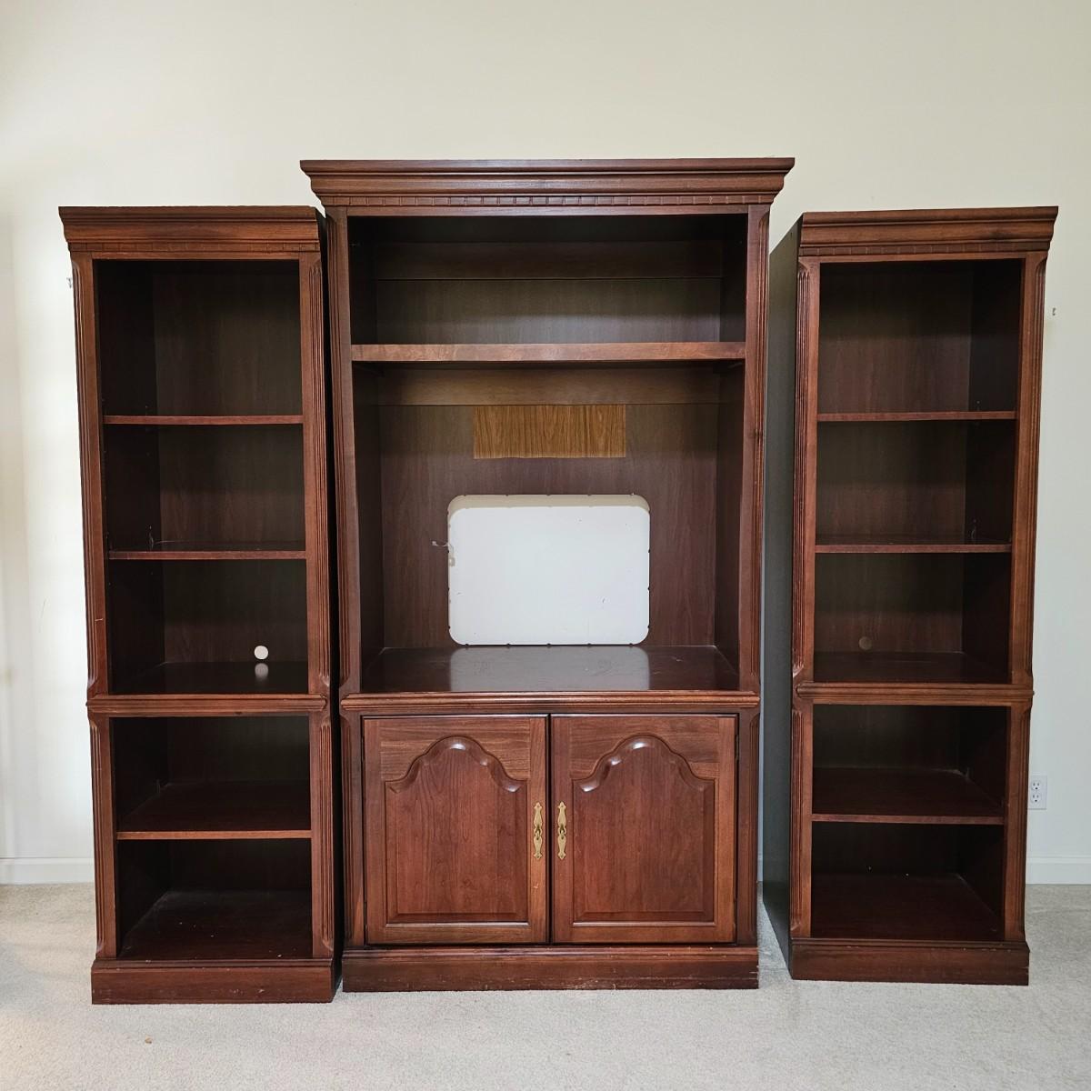 A three piece entertainment center/storage unit. Center unit is 44.5" x 23.5" x 79"H, would hold a 45" diagonal TV. Cutout in back and top for cables, power. Two door/four shelf storage below. Side units are 23" x 19" x 75"H, have five shelves each. Some small blemishes on pieces, see photos for details. Please note, you must take all three pieces. Local pickup only. Winning bidder must bring assistance to help move and load this item due to its weight and/or size.