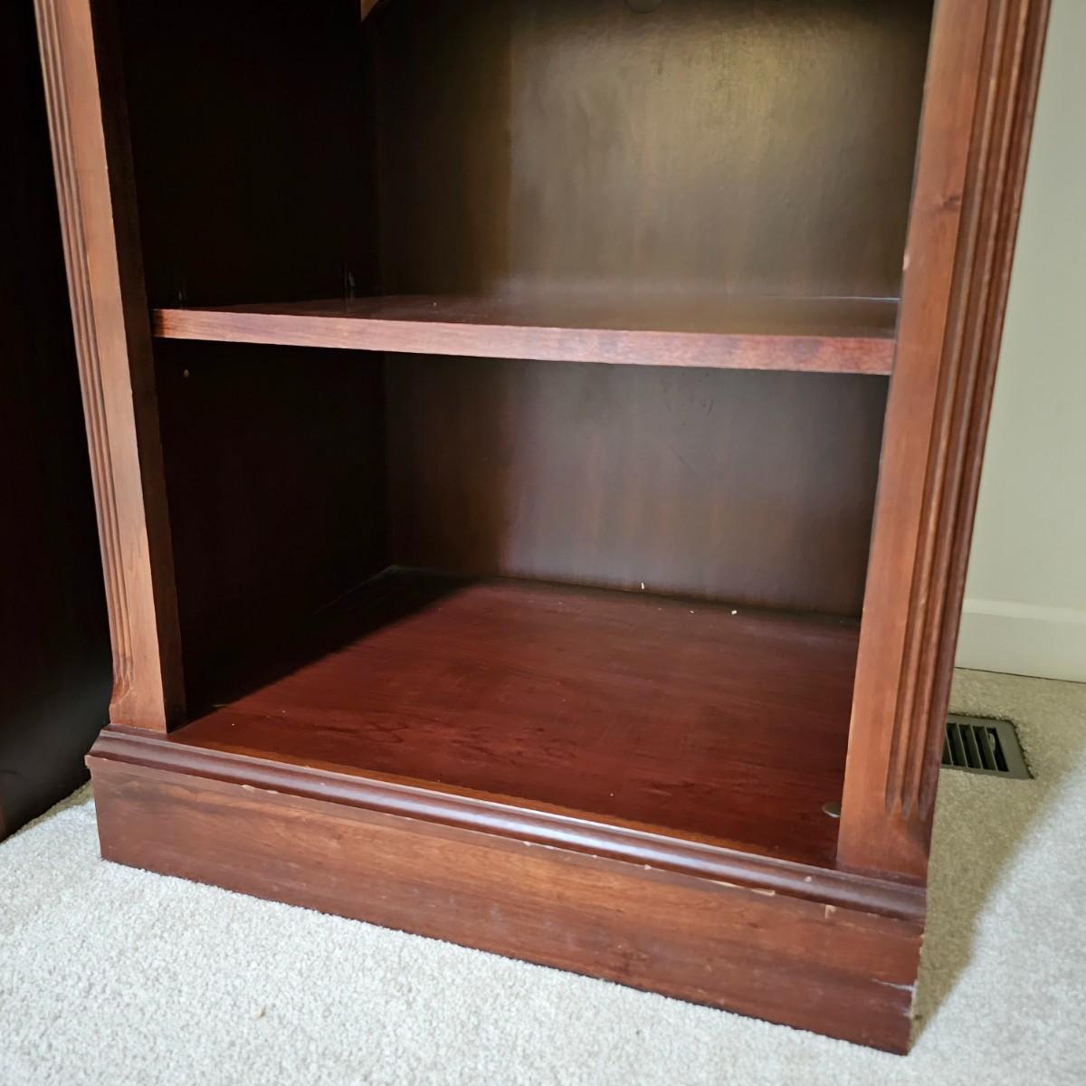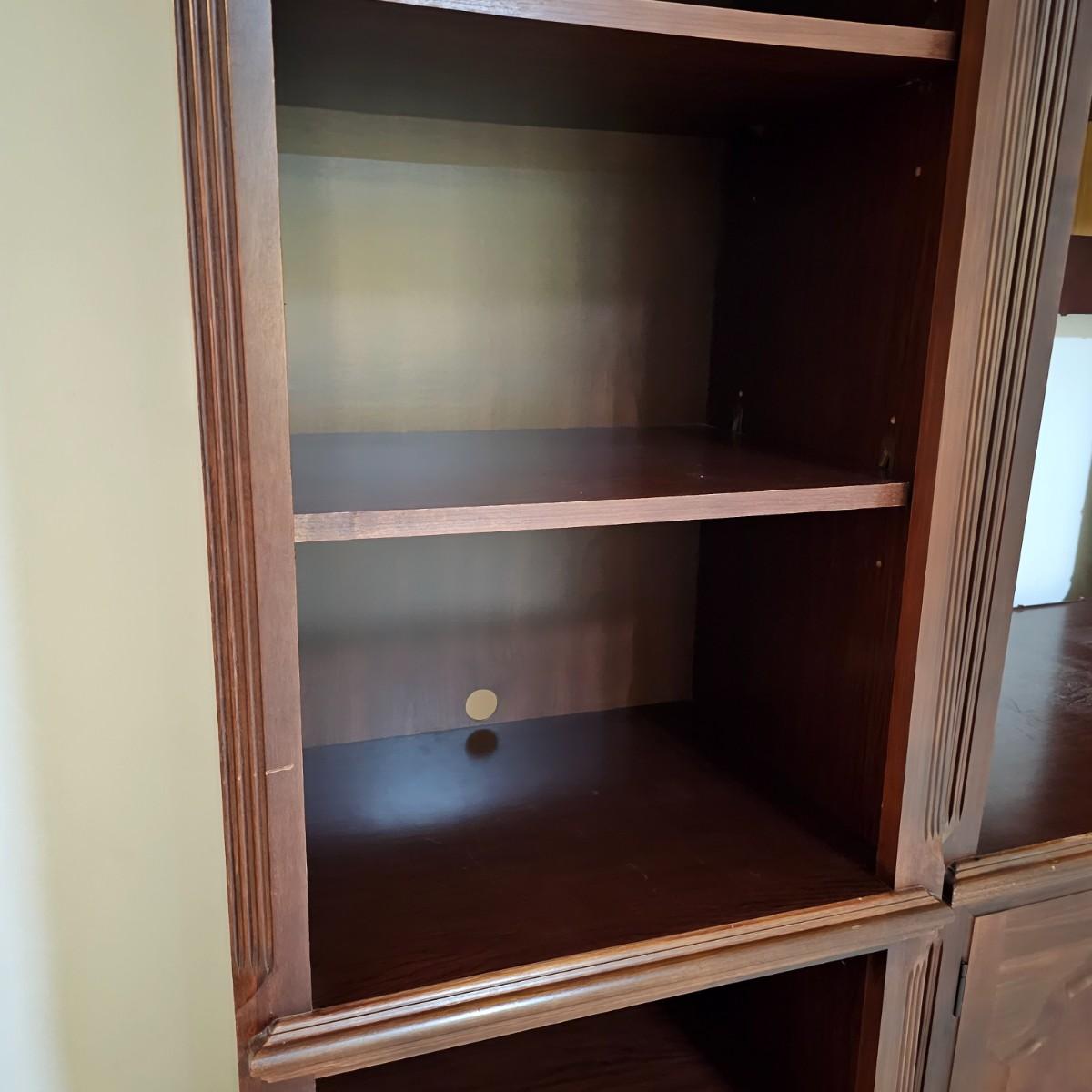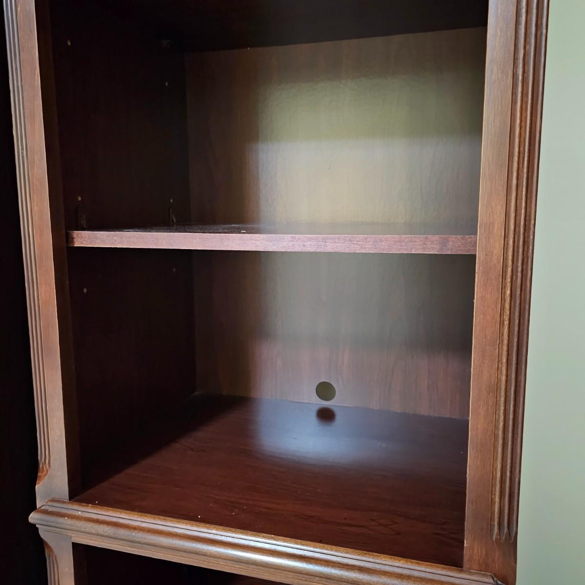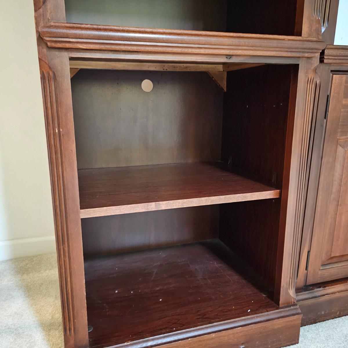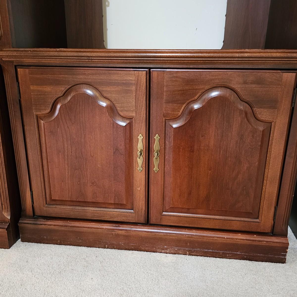A three piece entertainment center/storage unit. Center unit is 44.5" x 23.5" x 79"H, would hold a 45" diagonal TV. Cutout in back and top for cables, power. Two door/four shelf storage below. Side units are 23" x 19" x 75"H, have five shelves each. Some small blemishes on pieces, see photos for details. Please note, you must take all three pieces. Local pickup only. Winning bidder must bring assistance to help move and load this item due to its weight and/or size.