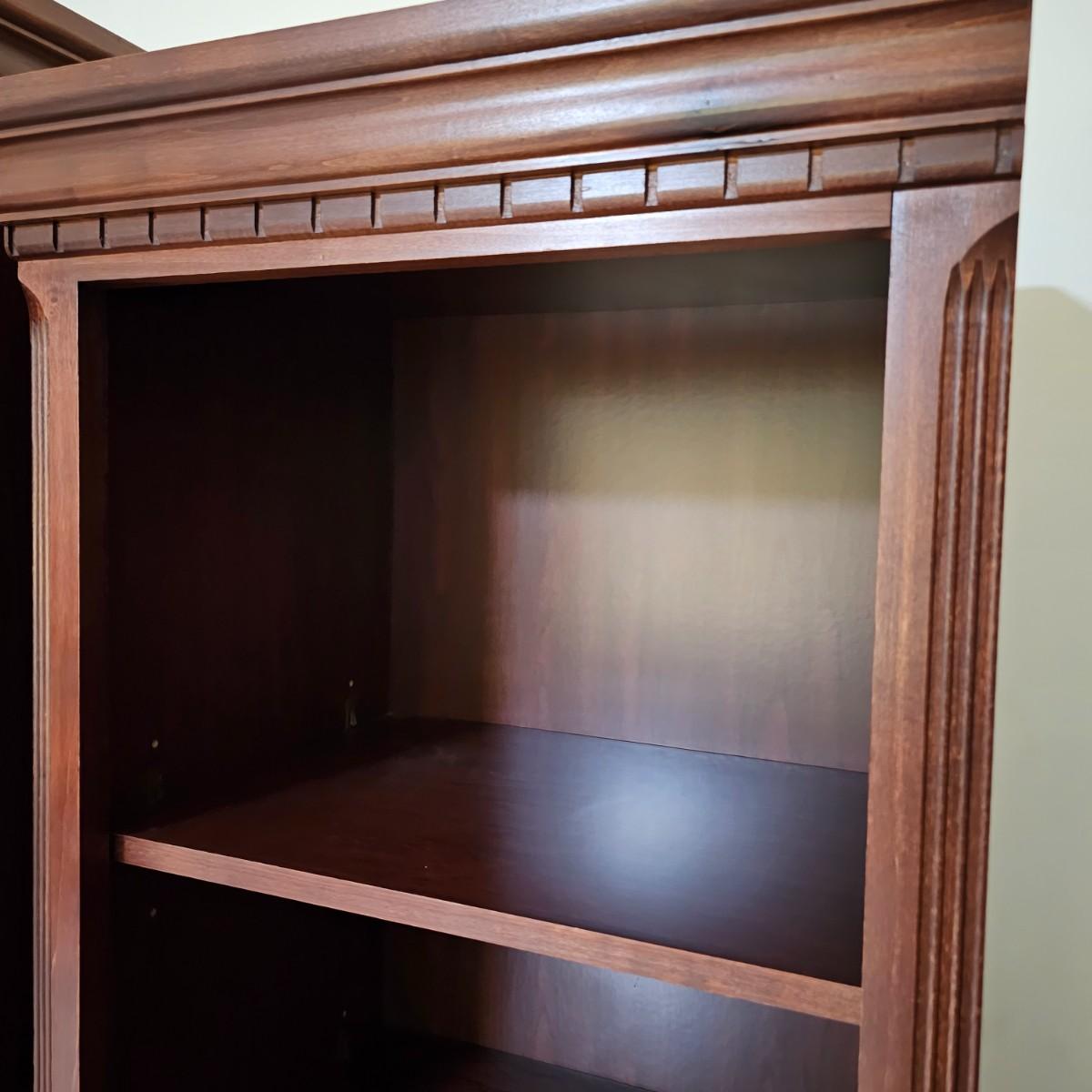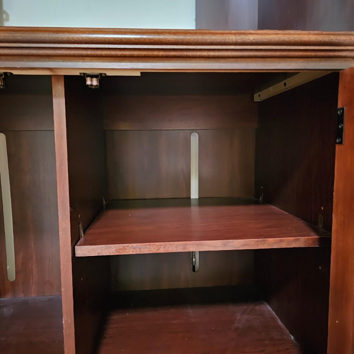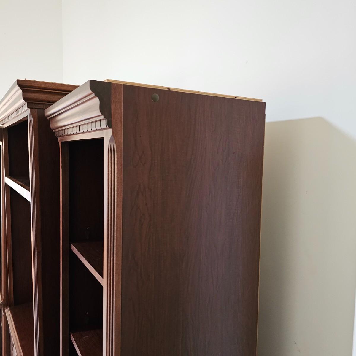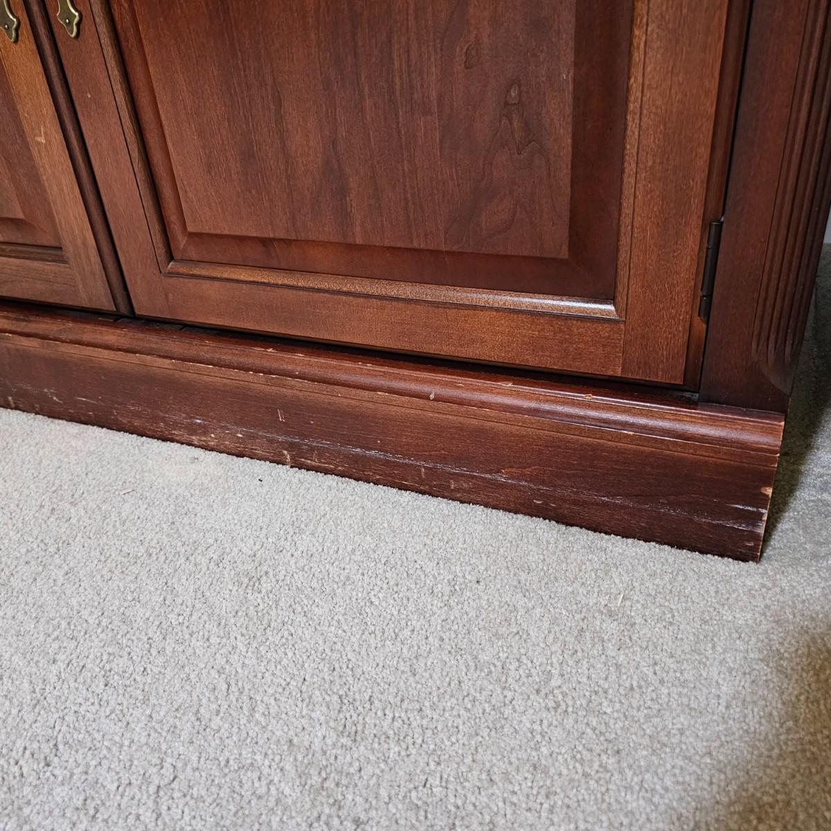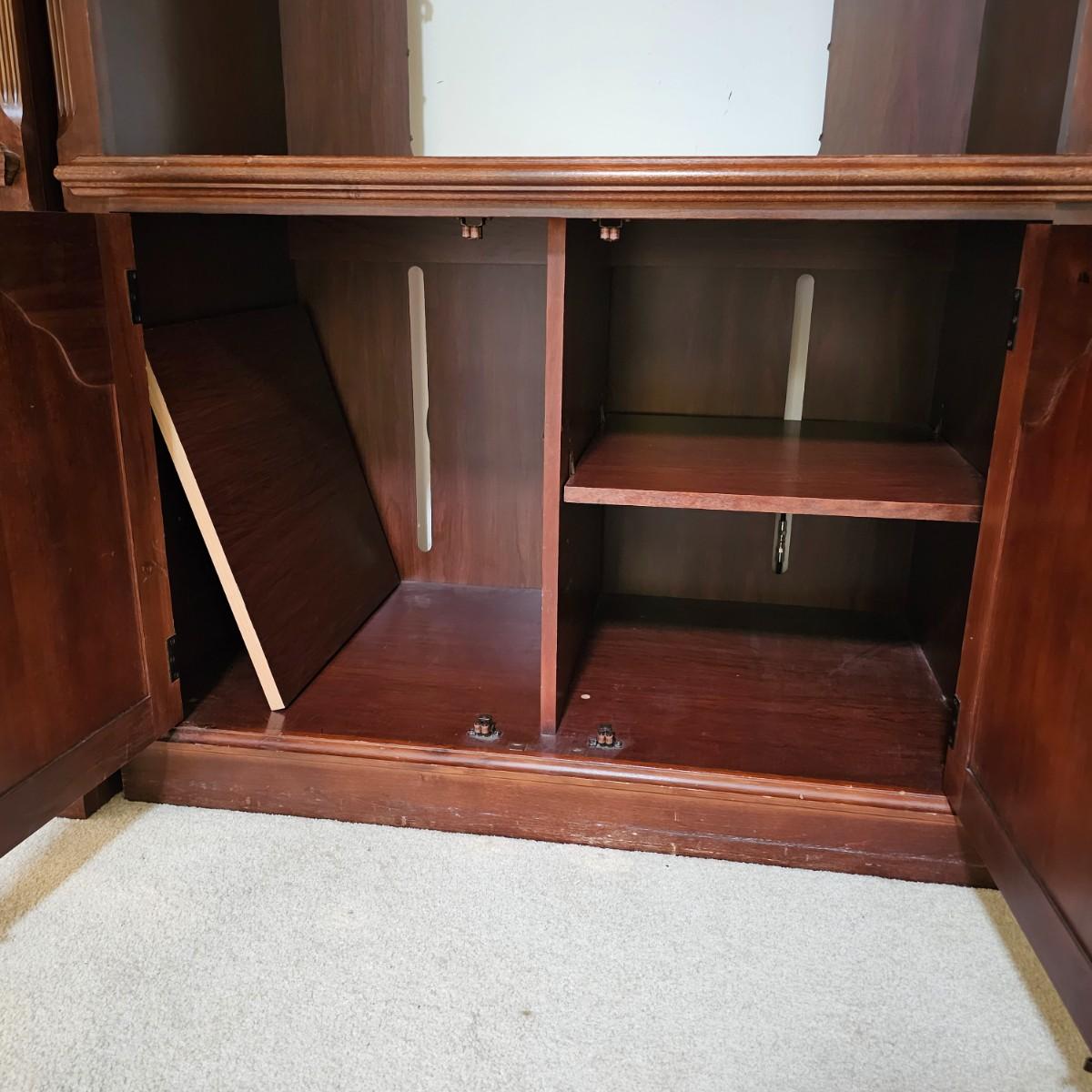 A three piece entertainment center/storage unit. Center unit is 44.5" x 23.5" x 79"H, would hold a 45" diagonal TV. Cutout in back and top for cables, power. Two door/four shelf storage below. Side units are 23" x 19" x 75"H, have five shelves each. Some small blemishes on pieces, see photos for details. Please note, you must take all three pieces. Local pickup only. Winning bidder must bring assistance to help move and load this item due to its weight and/or size.