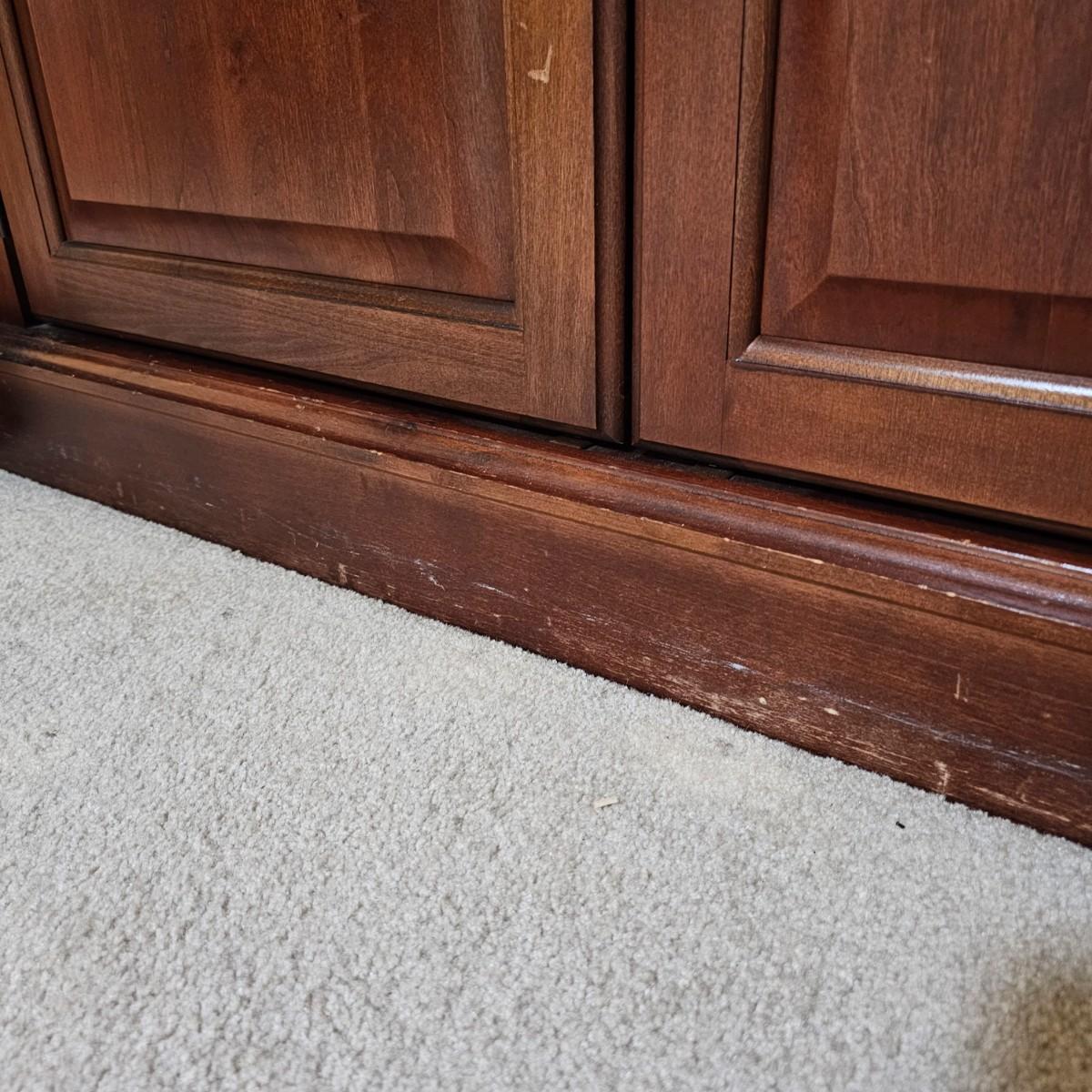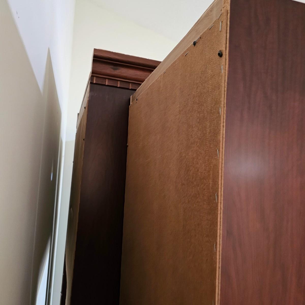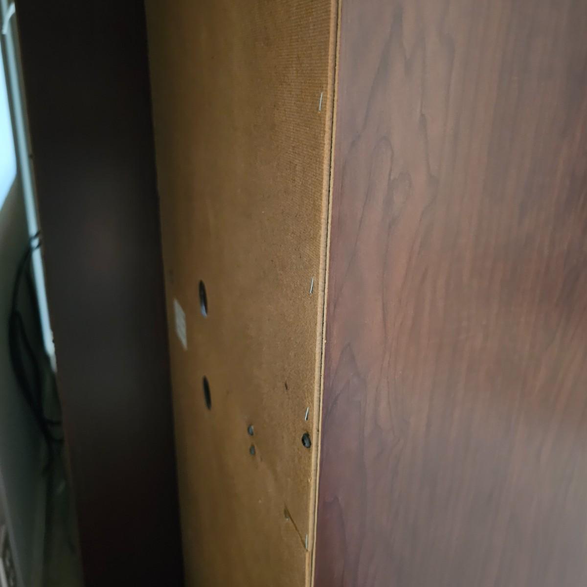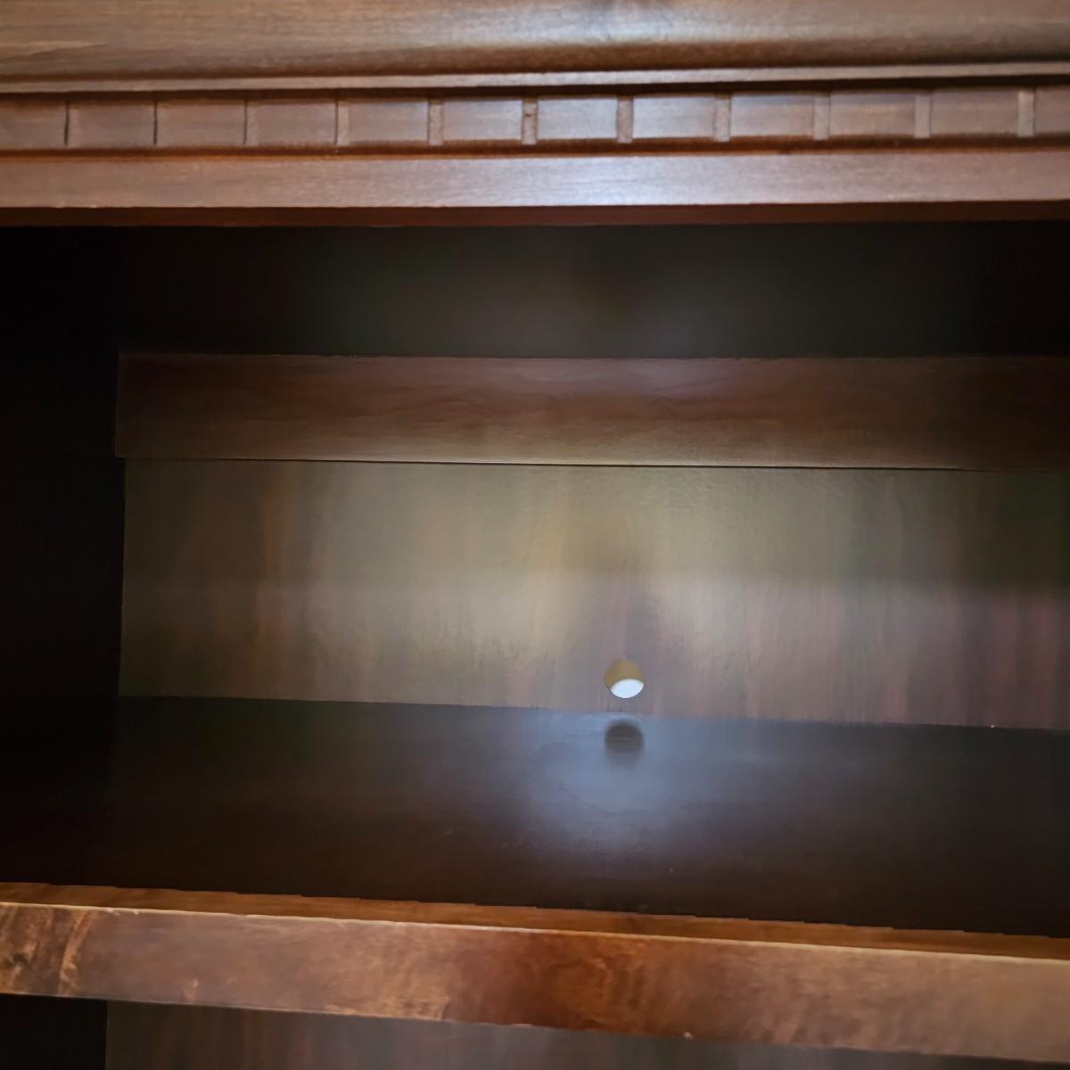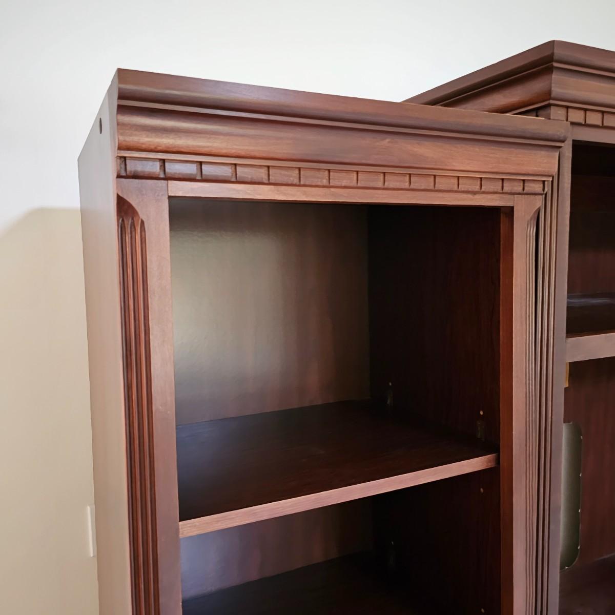A three piece entertainment center/storage unit. Center unit is 44.5" x 23.5" x 79"H, would hold a 45" diagonal TV. Cutout in back and top for cables, power. Two door/four shelf storage below. Side units are 23" x 19" x 75"H, have five shelves each. Some small blemishes on pieces, see photos for details. Please note, you must take all three pieces. Local pickup only. Winning bidder must bring assistance to help move and load this item due to its weight and/or size.