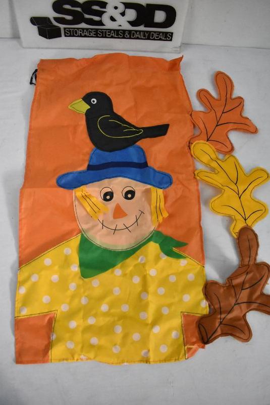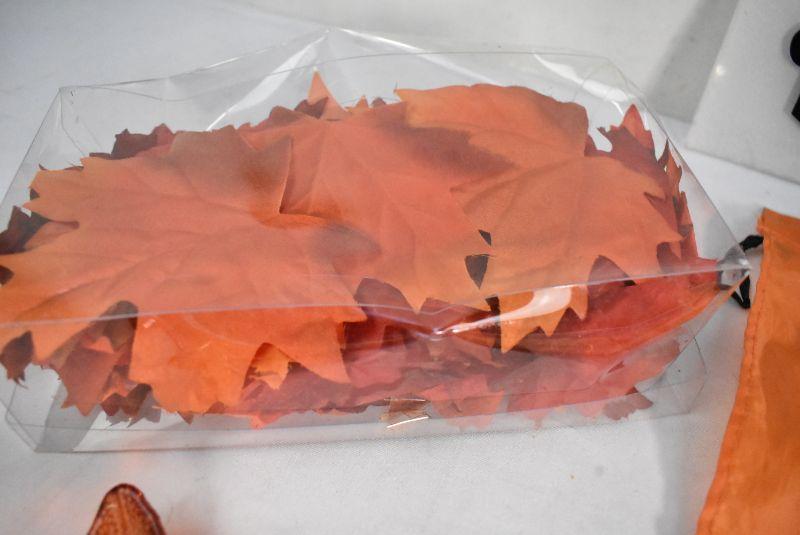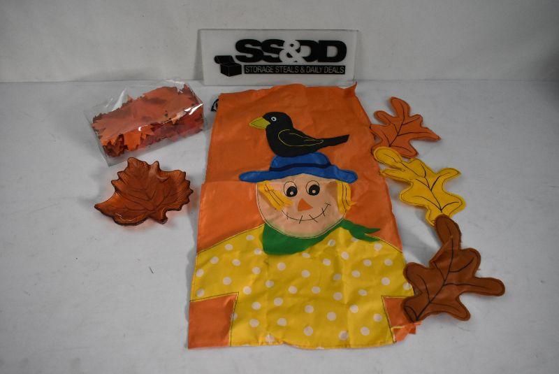 3 Piece Fall Decor: Fake Leaves, Leaf Glass Tray, Scarecrow Flag