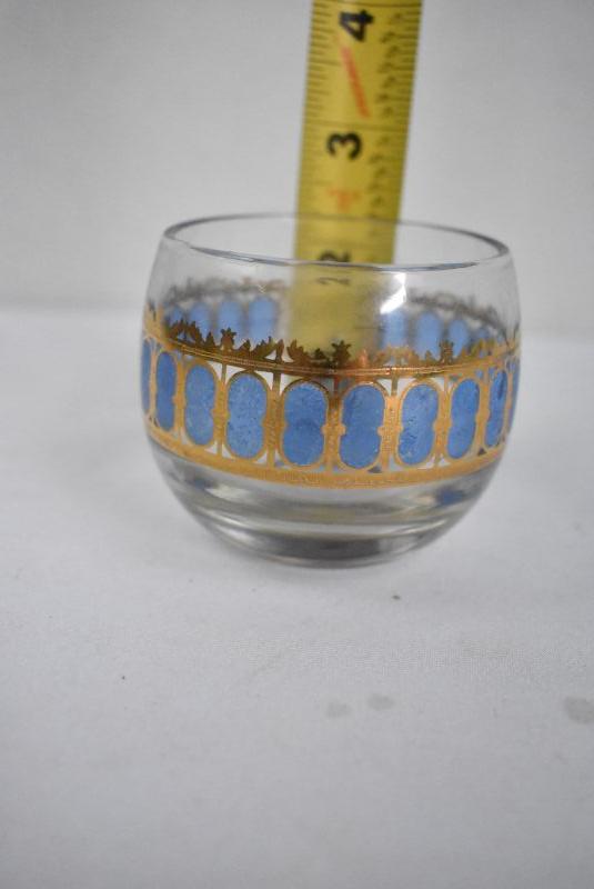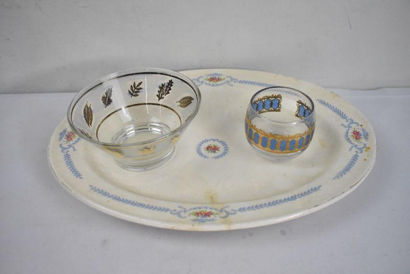 3 Piece: Floral Platter, Chipped, Bowl with Leaves, Cup with Blue & Gold Design