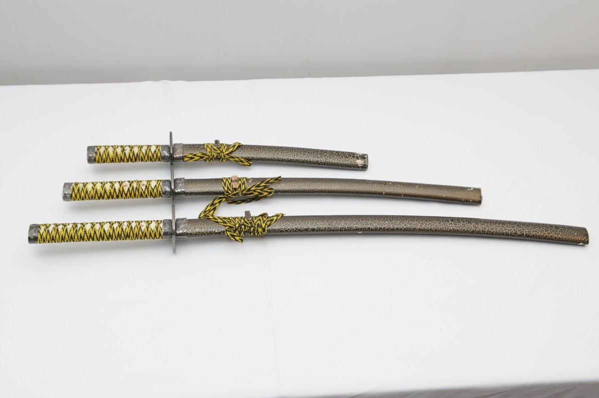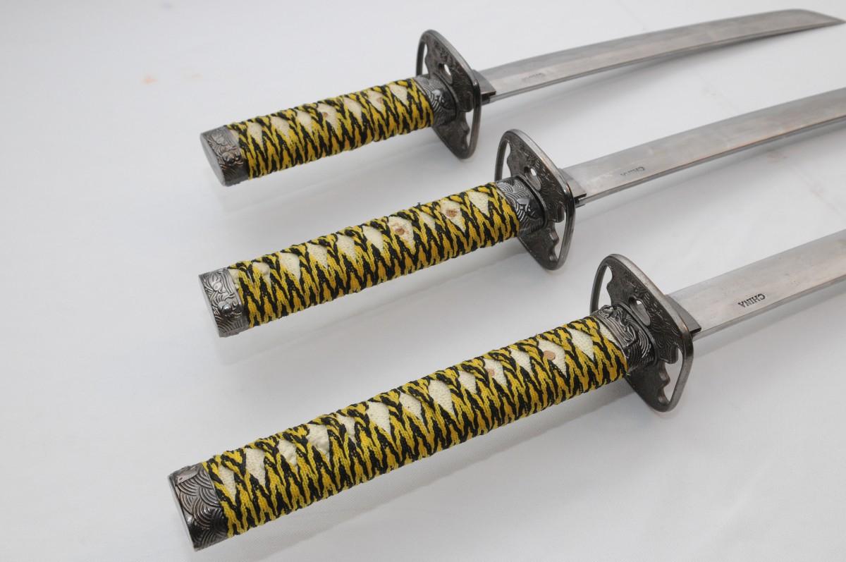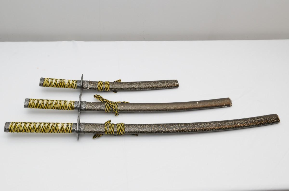 3 Katana Swords from China - Hinen-Maki Style (Handle wrapping style) black & gold Sizes are: 91 1/2 cm x 3 cm, 69 cm x 3 cm, 45 cm x 3 cm