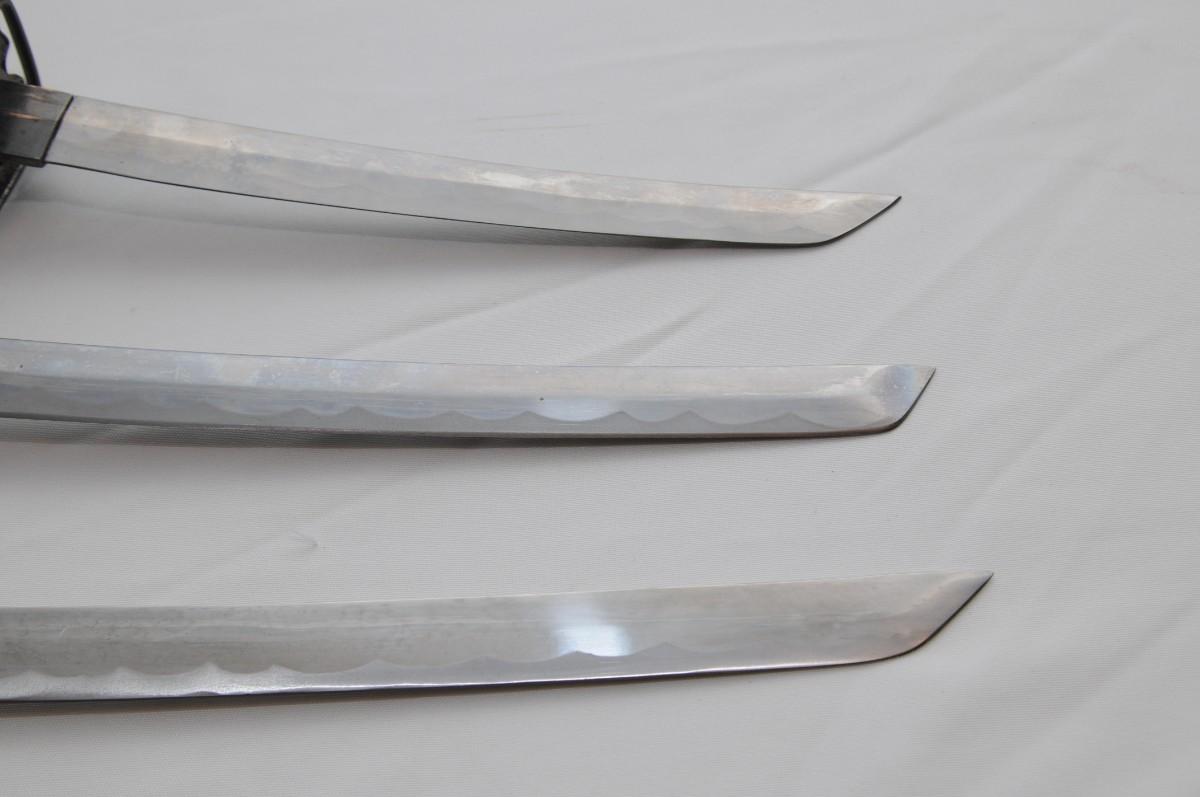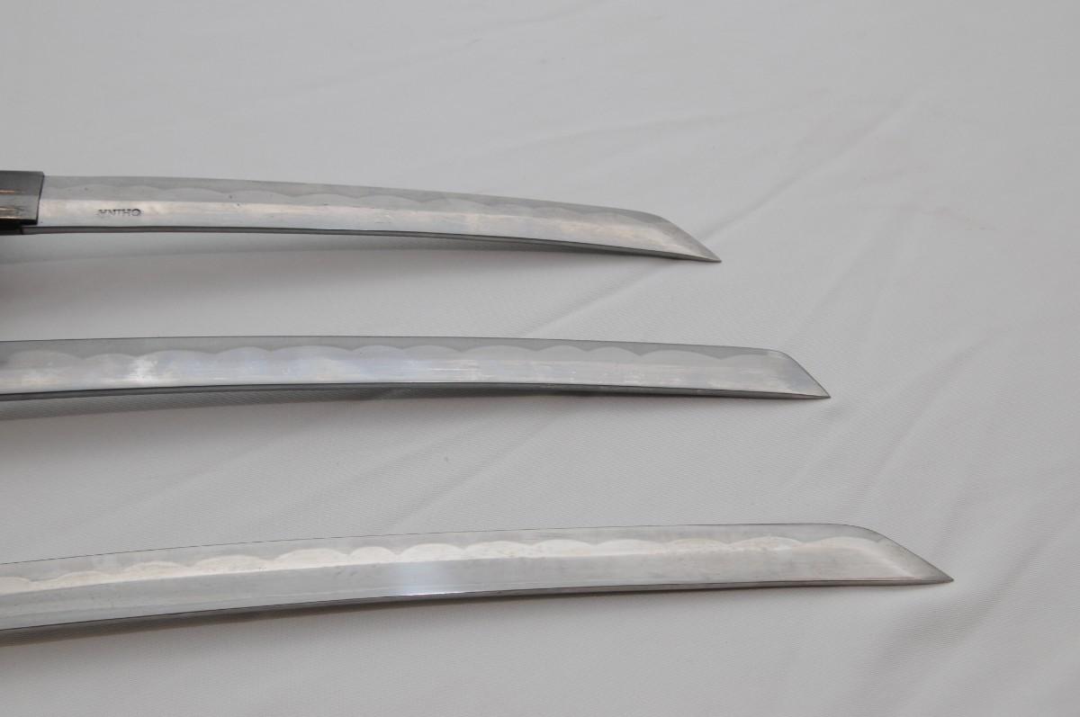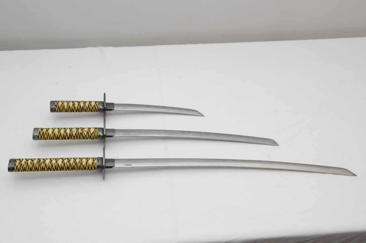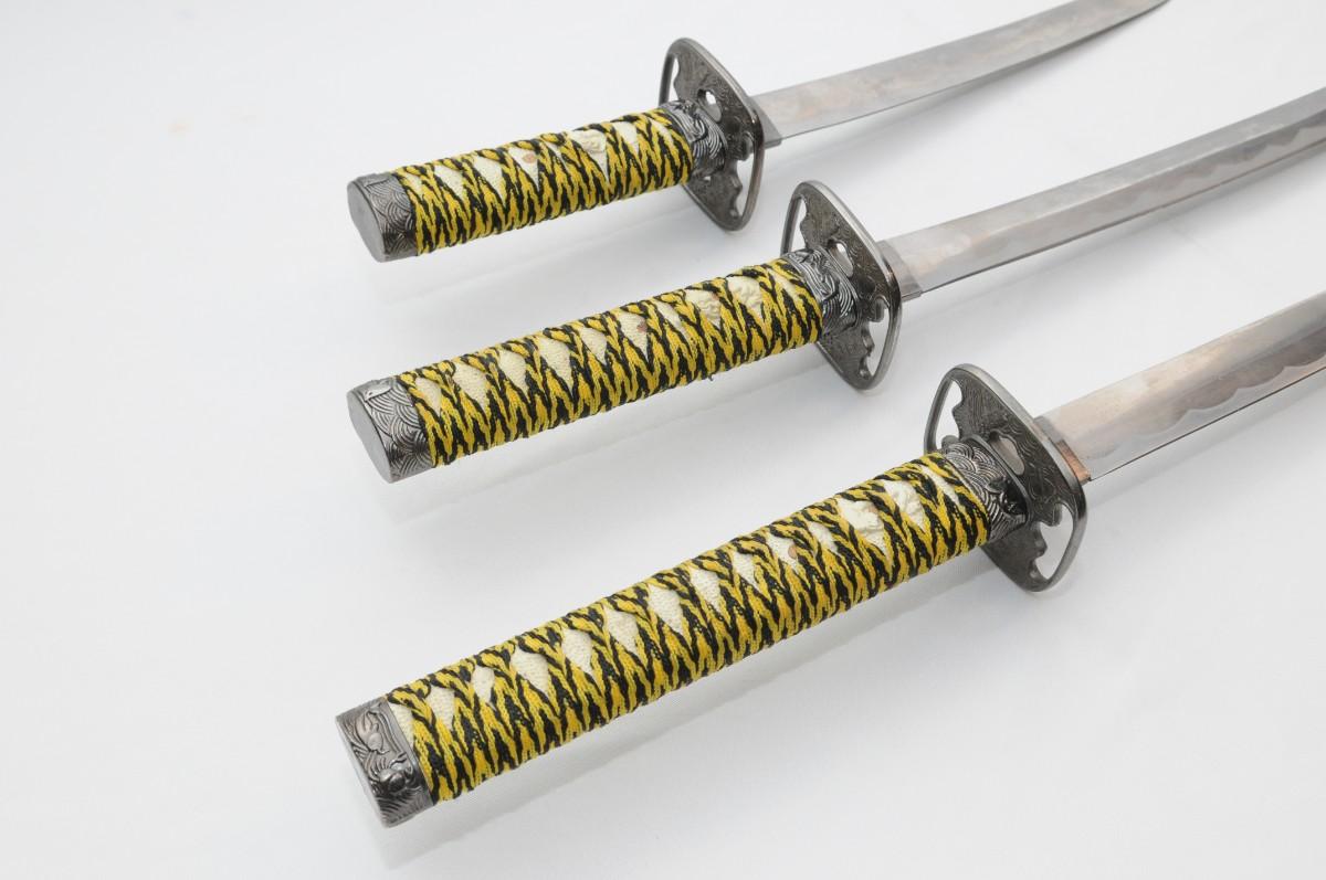 3 Katana Swords from China - Hinen-Maki Style (Handle wrapping style) black & gold Sizes are: 91 1/2 cm x 3 cm, 69 cm x 3 cm, 45 cm x 3 cm