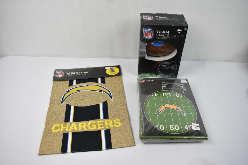 3 Piece NFL Chargers: Decorative Team Flag, Team Pride Light, & Table Topper - New
