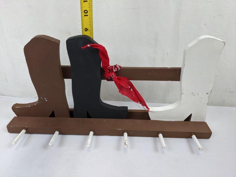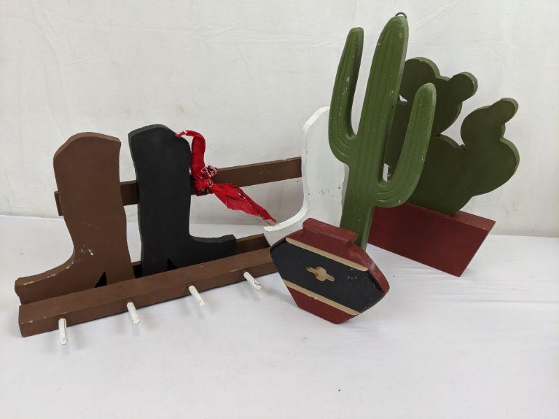 3 Piece Painted Wooden Western Decor - 2 Cacti & Cowboy Boots Hanger