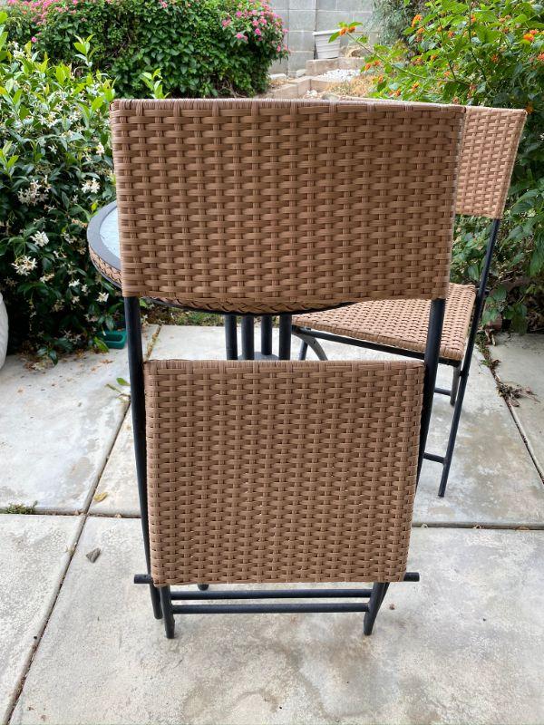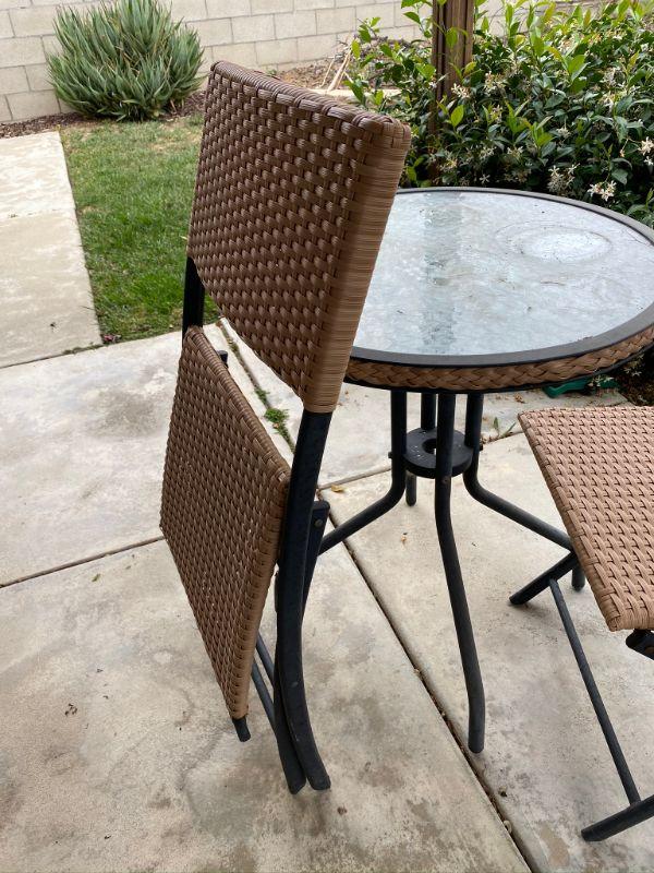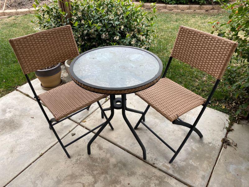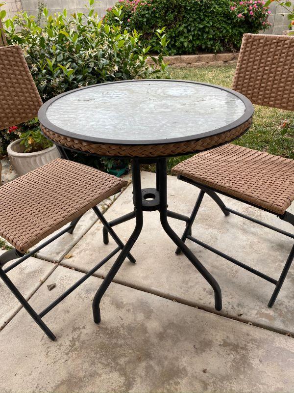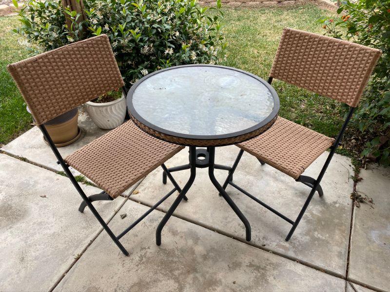 Cute patio bistro seat. Round glass top table with 2 folding chairs. Backs and seats are woven plastic like material. Good Condition.