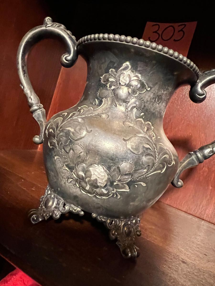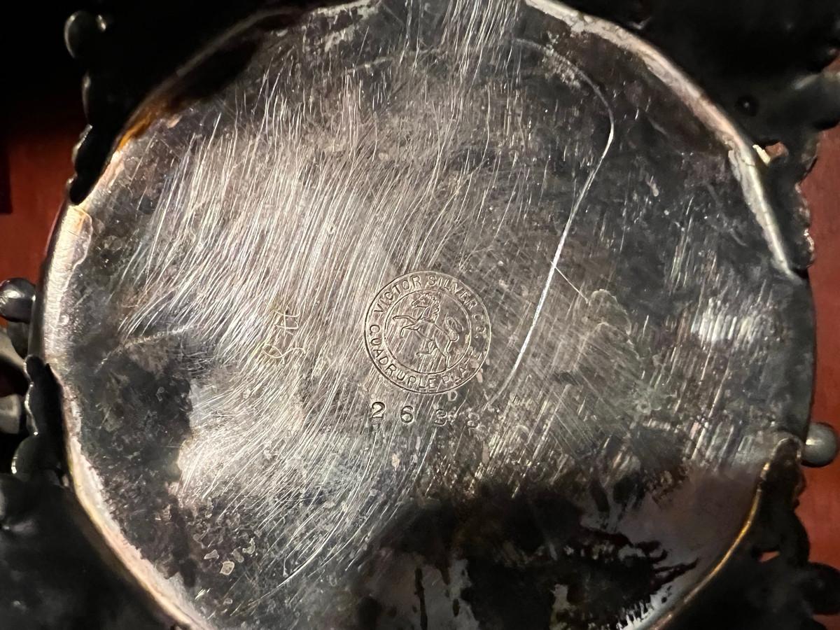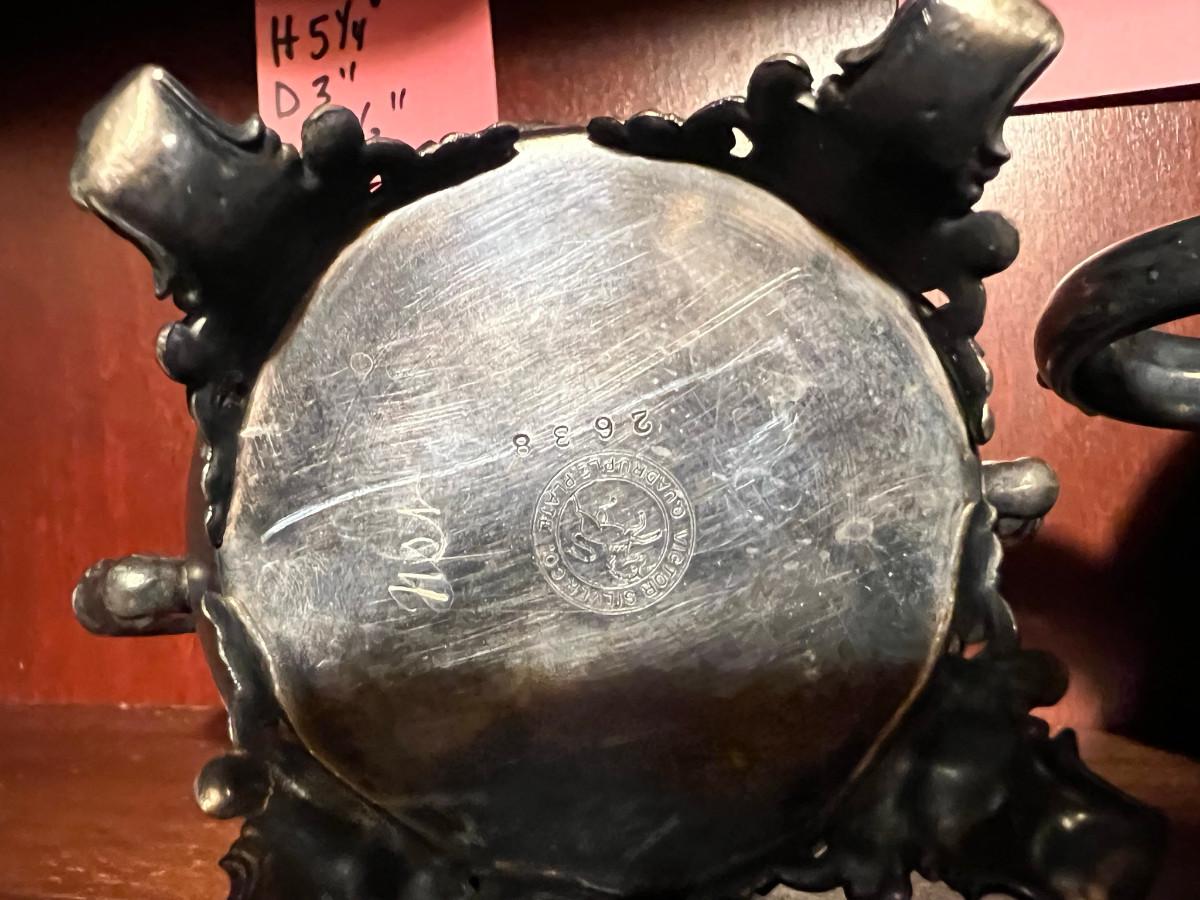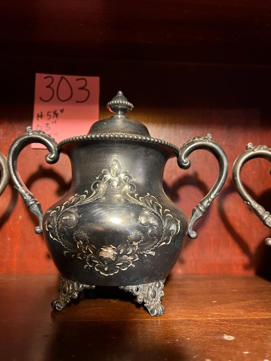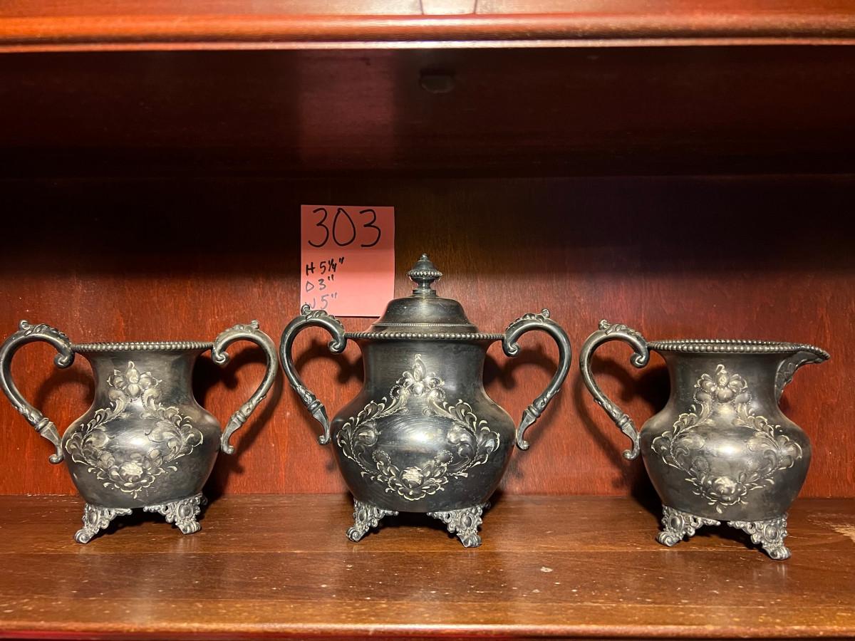 Victor Silver Co. Quadruple plated 1 piece with lid 7" x 5" x 7", creamer 5 1/4" x 3" x 5", Sugar 5 1/4" x 3" x 6.5" as is
