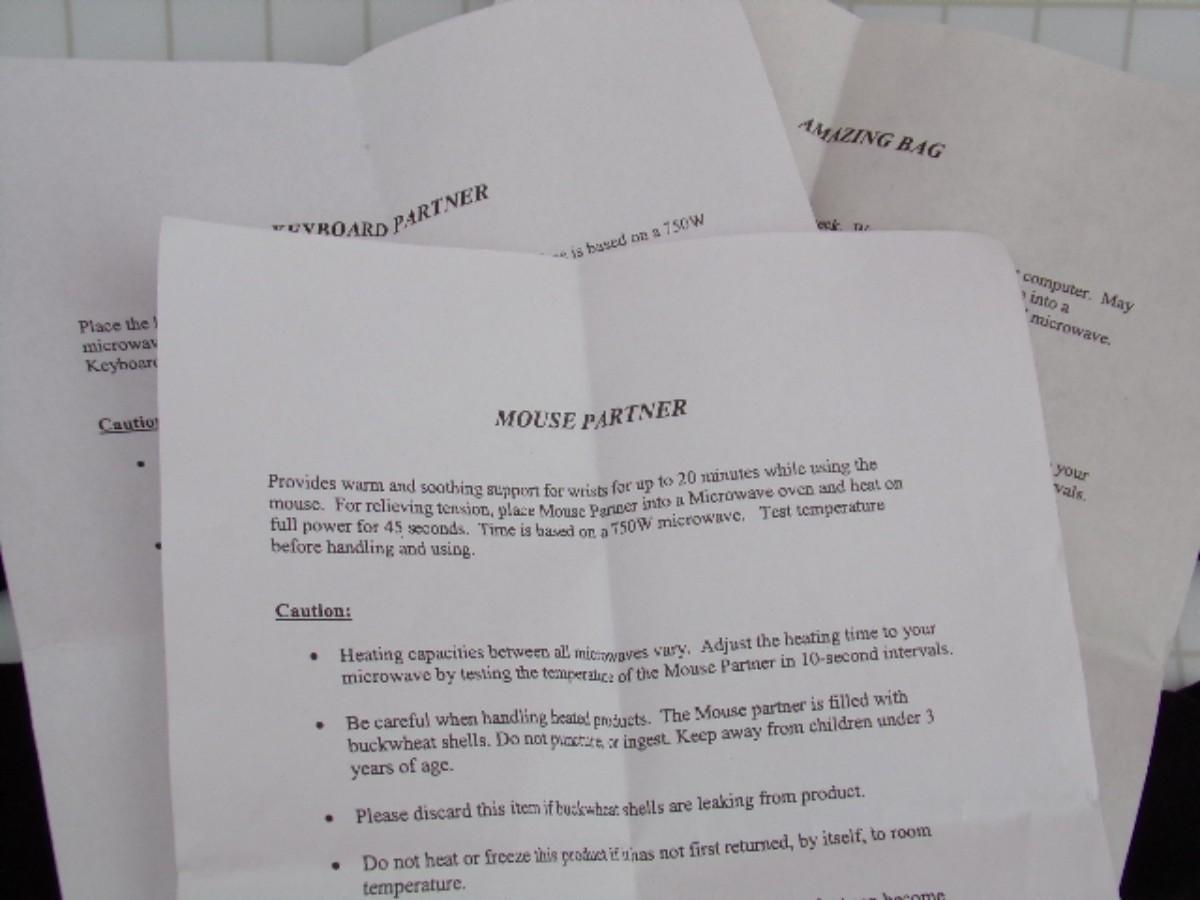 Three piece set, Mouse Partner, Keyboard Partner, Amazing Bag. Look NEW IN BOX/unused. Warm briefly in the microwave. Use for joint relief when using computer OR for neck pain. Has 3 instruction sheets for 3 items.