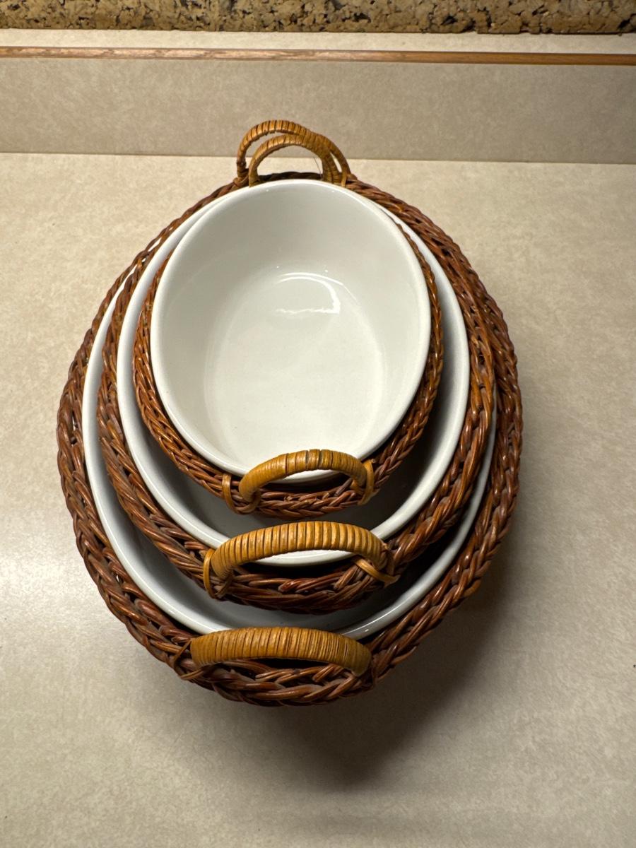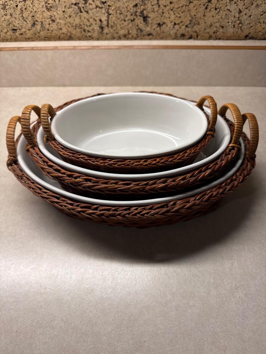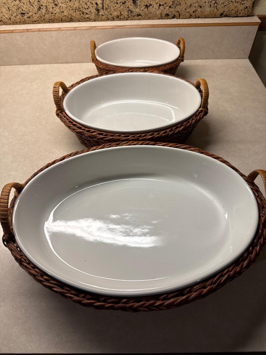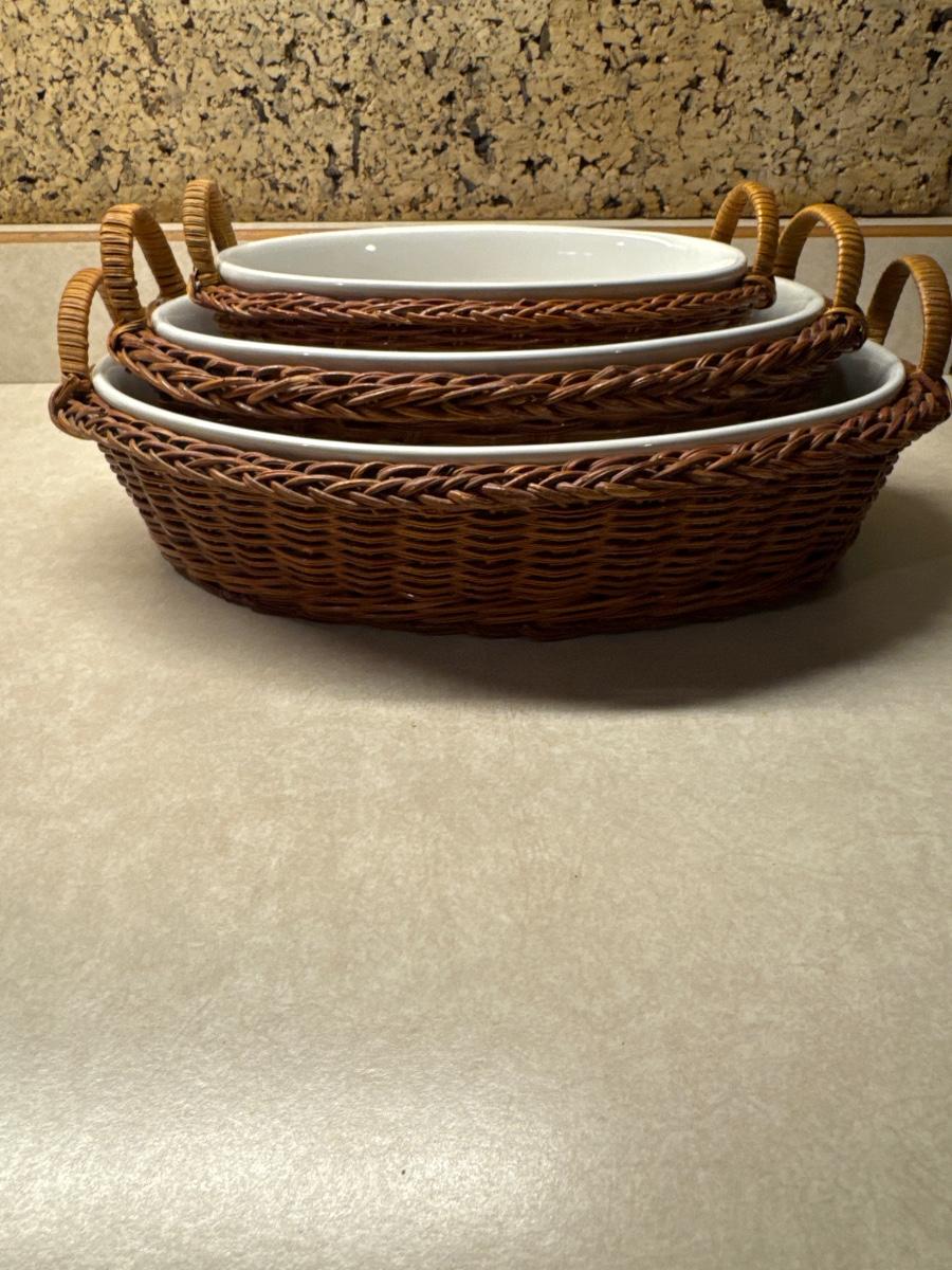 The image shows a 3-piece set of nesting oval white ceramic baking dishes with wicker baskets