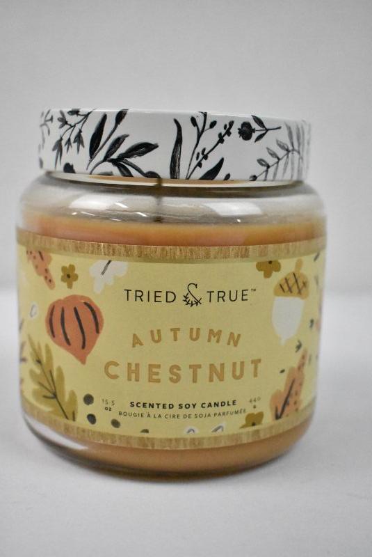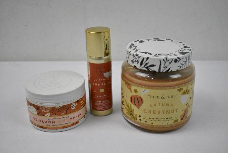 3 Piece Tried & True Autumn: Heirloom Pumpkin 4.1oz Candle, 1.5 oz Room Spray, and Autumn Chestnut 15.5 oz Candle - New