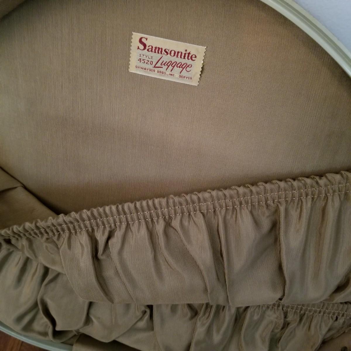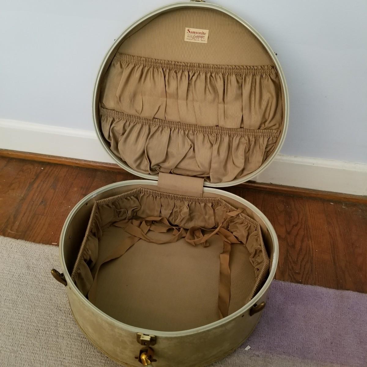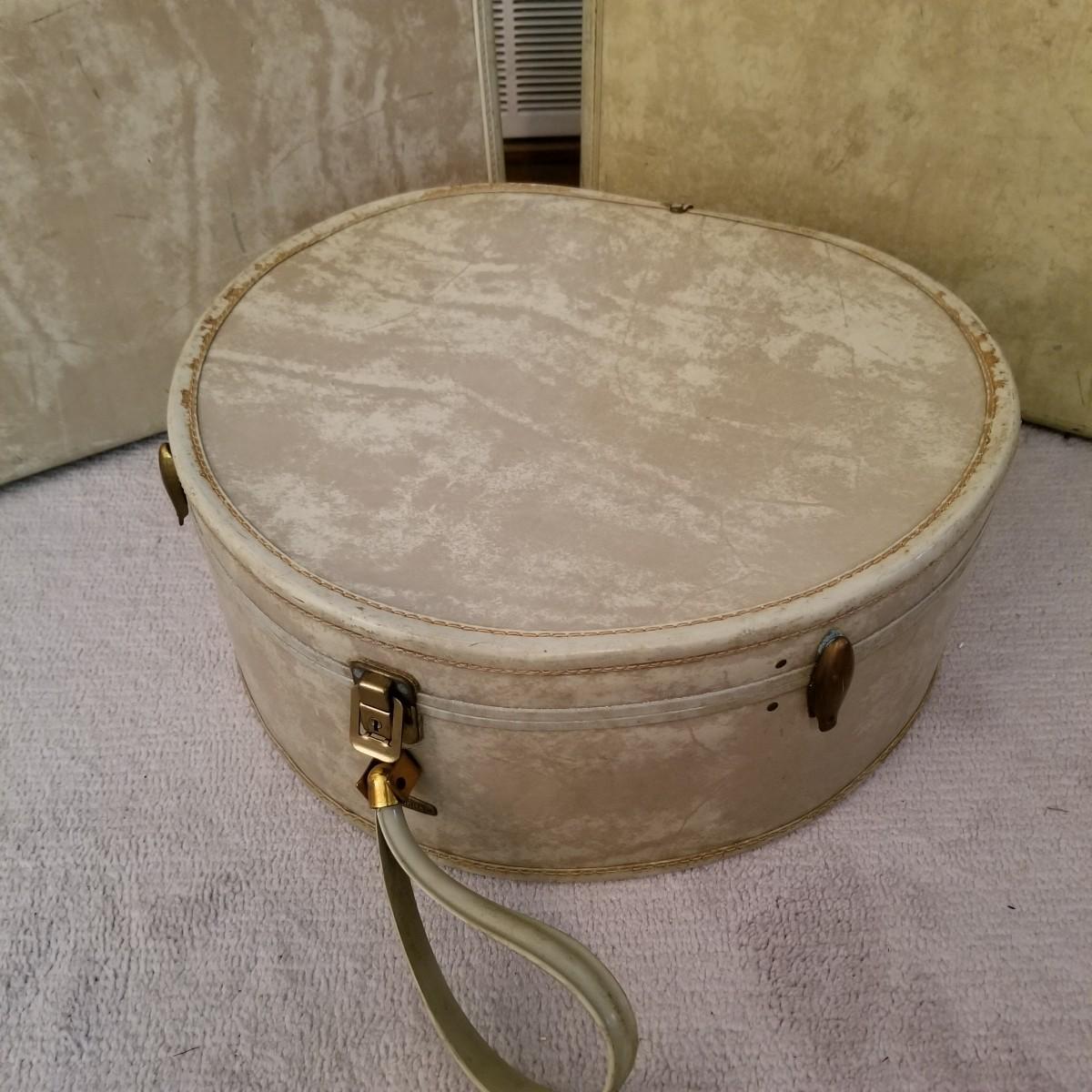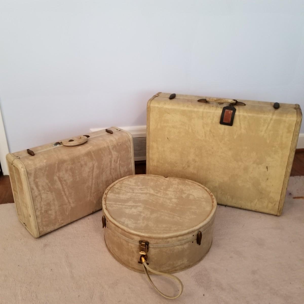 A vintage three piece matching set of Samsonite luggage. One large and one small suitcase, plus a hat box style handled case (style 4520). Pieces are well worn, and hardware shows some patina. Largest suitcase is 26" x 20" x 9". See photos for detail. Shipping available.