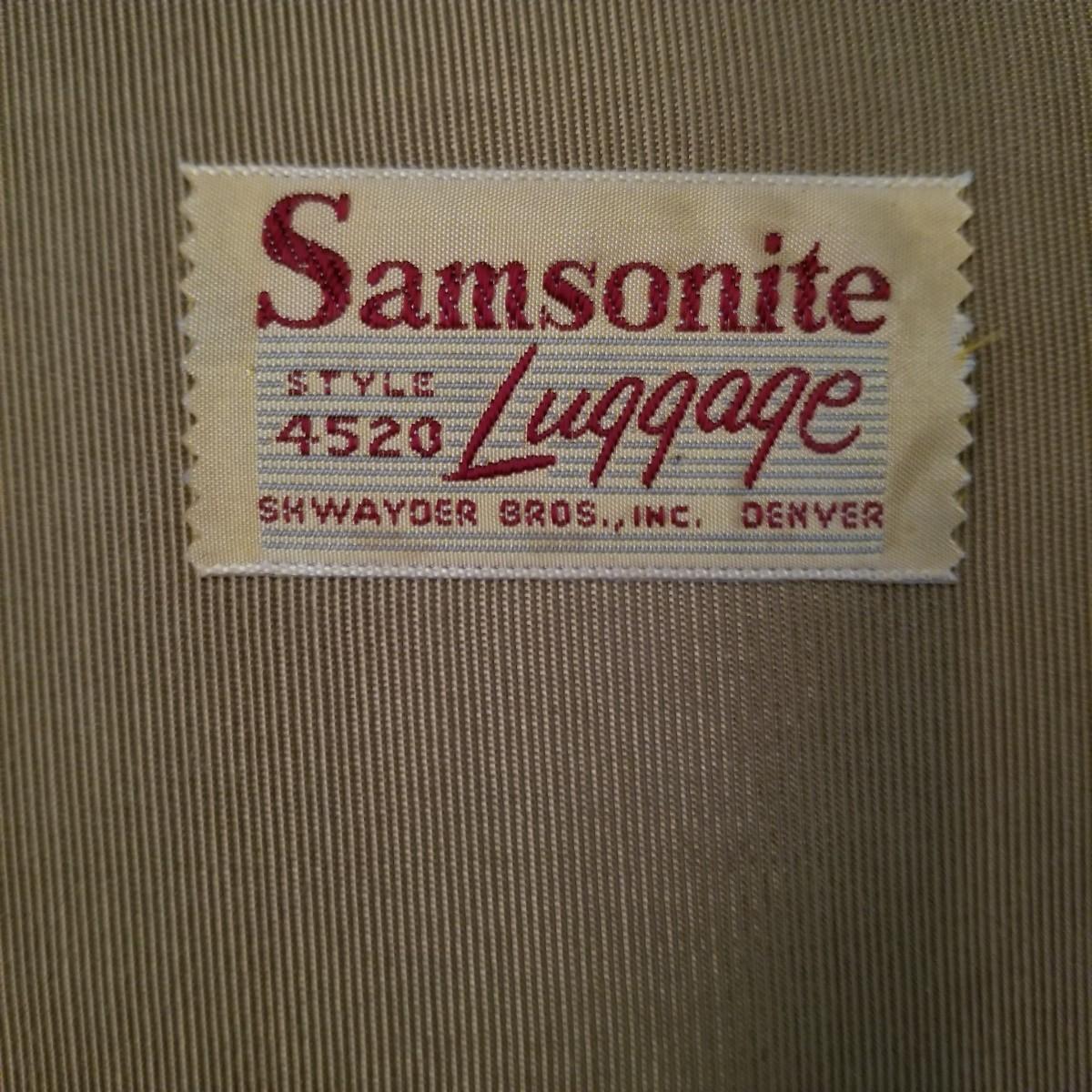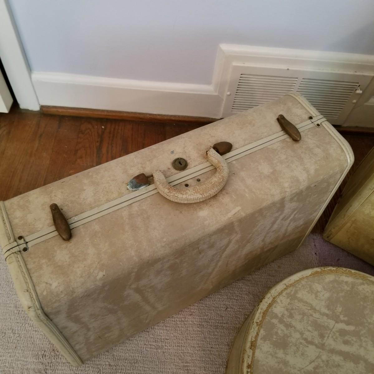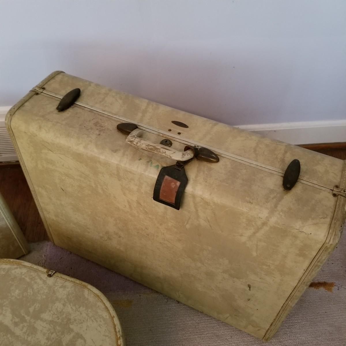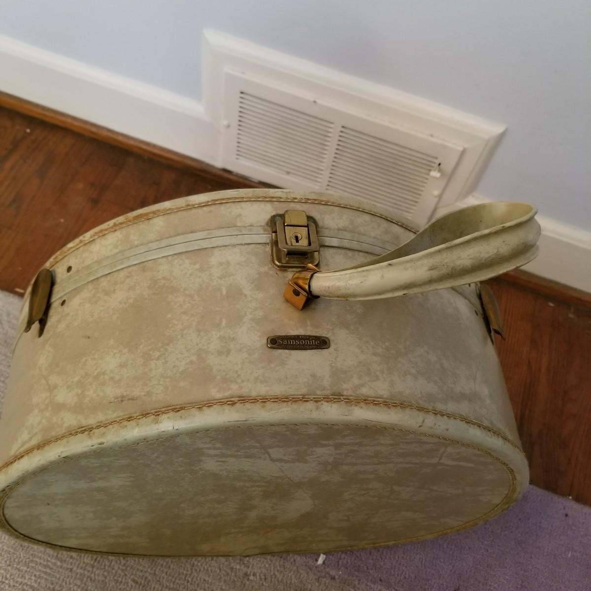 A vintage three piece matching set of Samsonite luggage. One large and one small suitcase, plus a hat box style handled case (style 4520). Pieces are well worn, and hardware shows some patina. Largest suitcase is 26" x 20" x 9". See photos for detail. Shipping available.