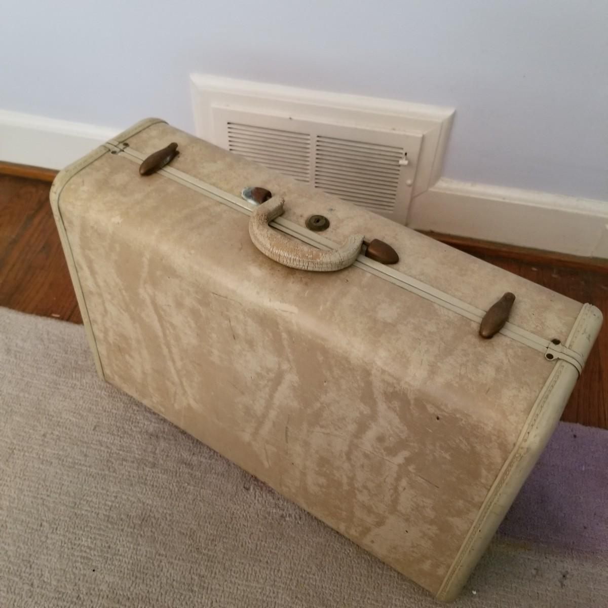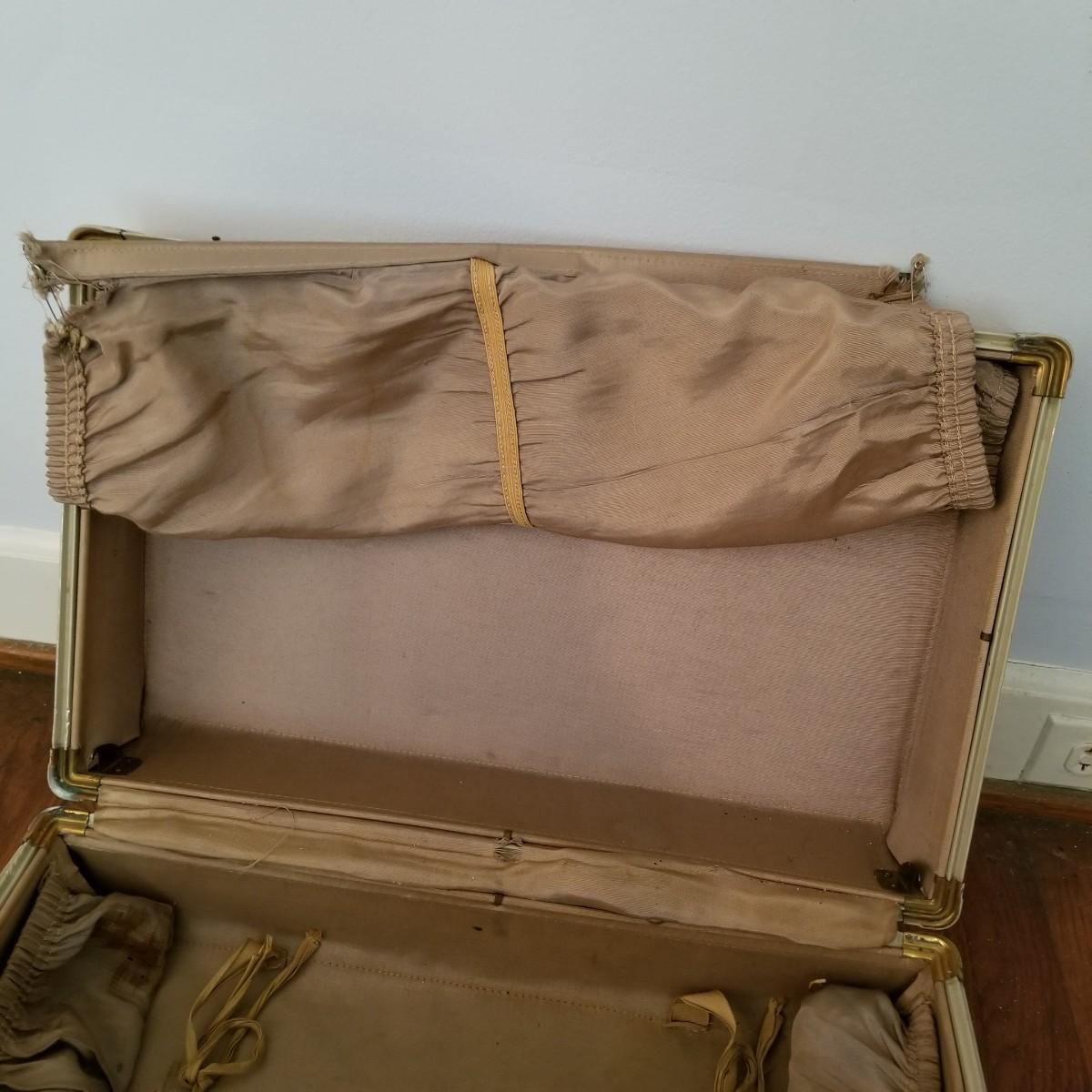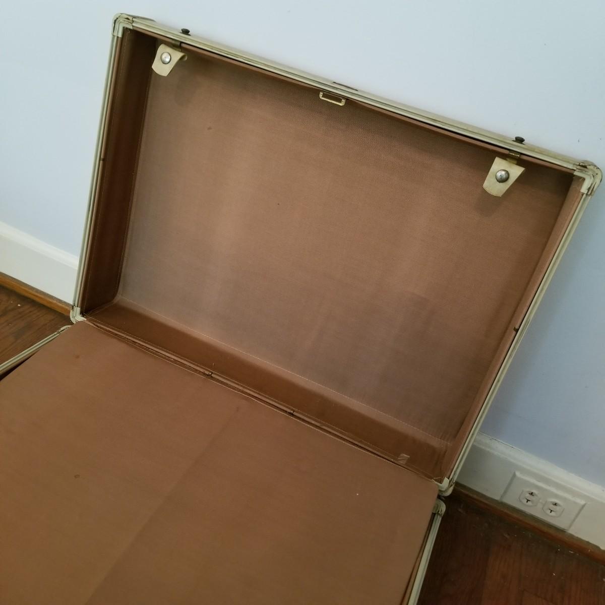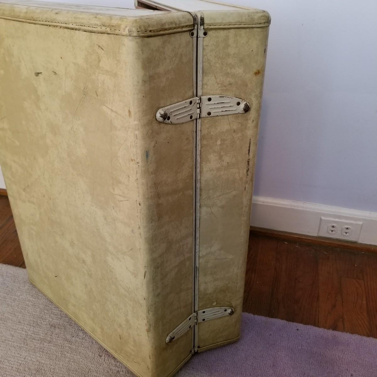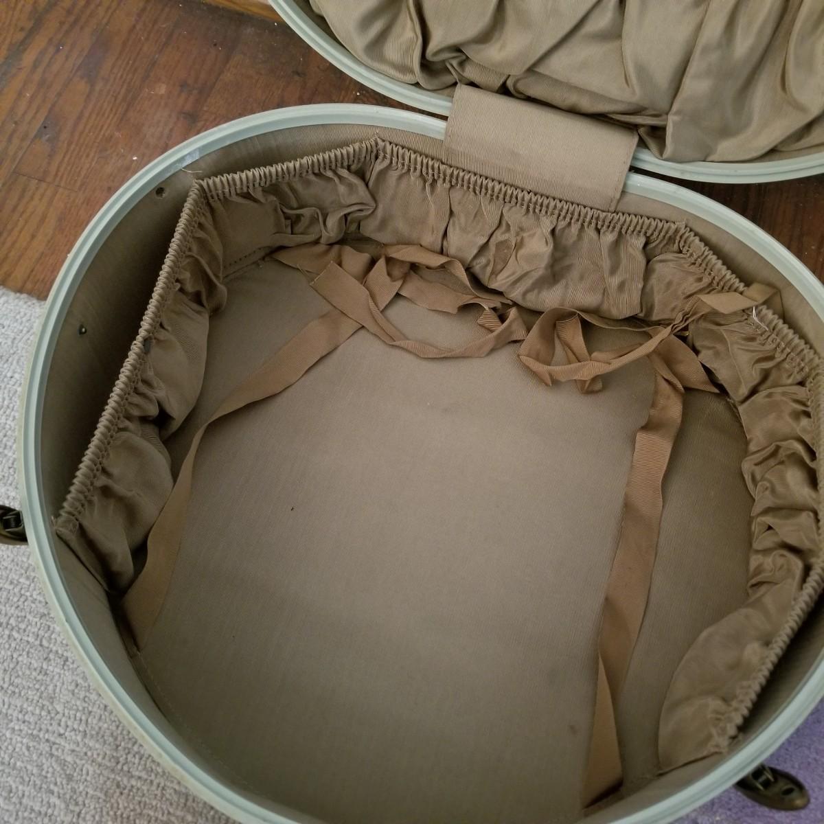 A vintage three piece matching set of Samsonite luggage. One large and one small suitcase, plus a hat box style handled case (style 4520). Pieces are well worn, and hardware shows some patina. Largest suitcase is 26" x 20" x 9". See photos for detail. Shipping available.