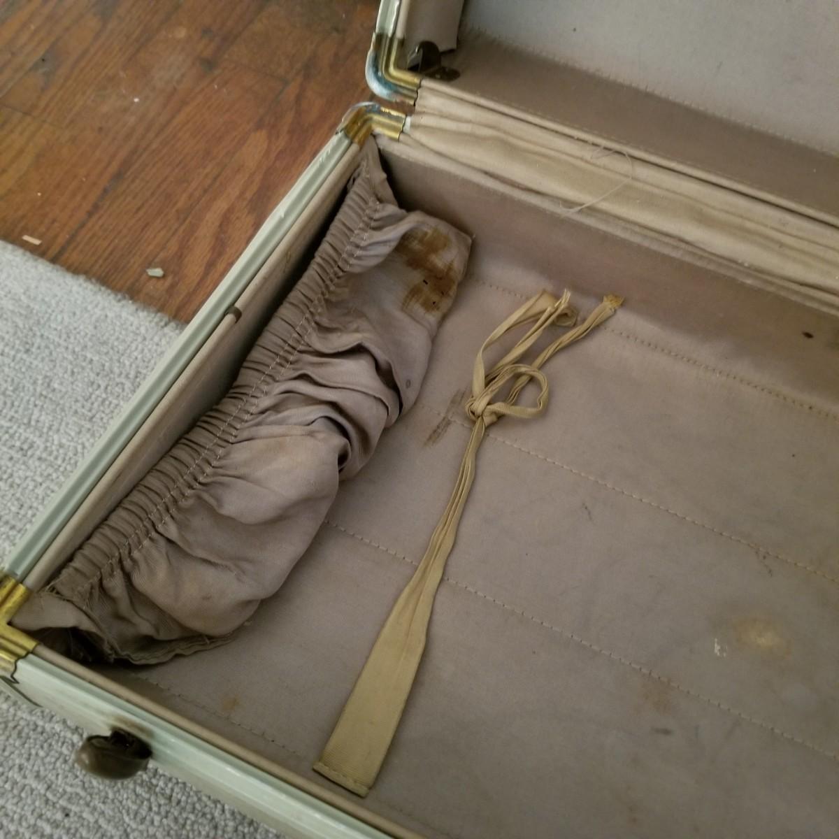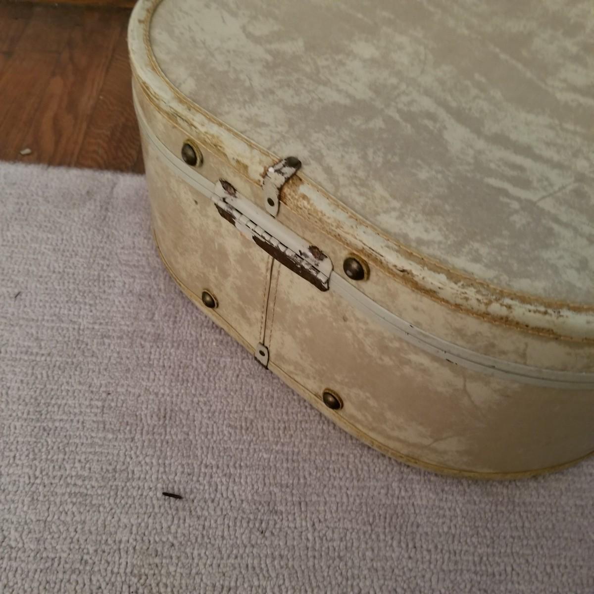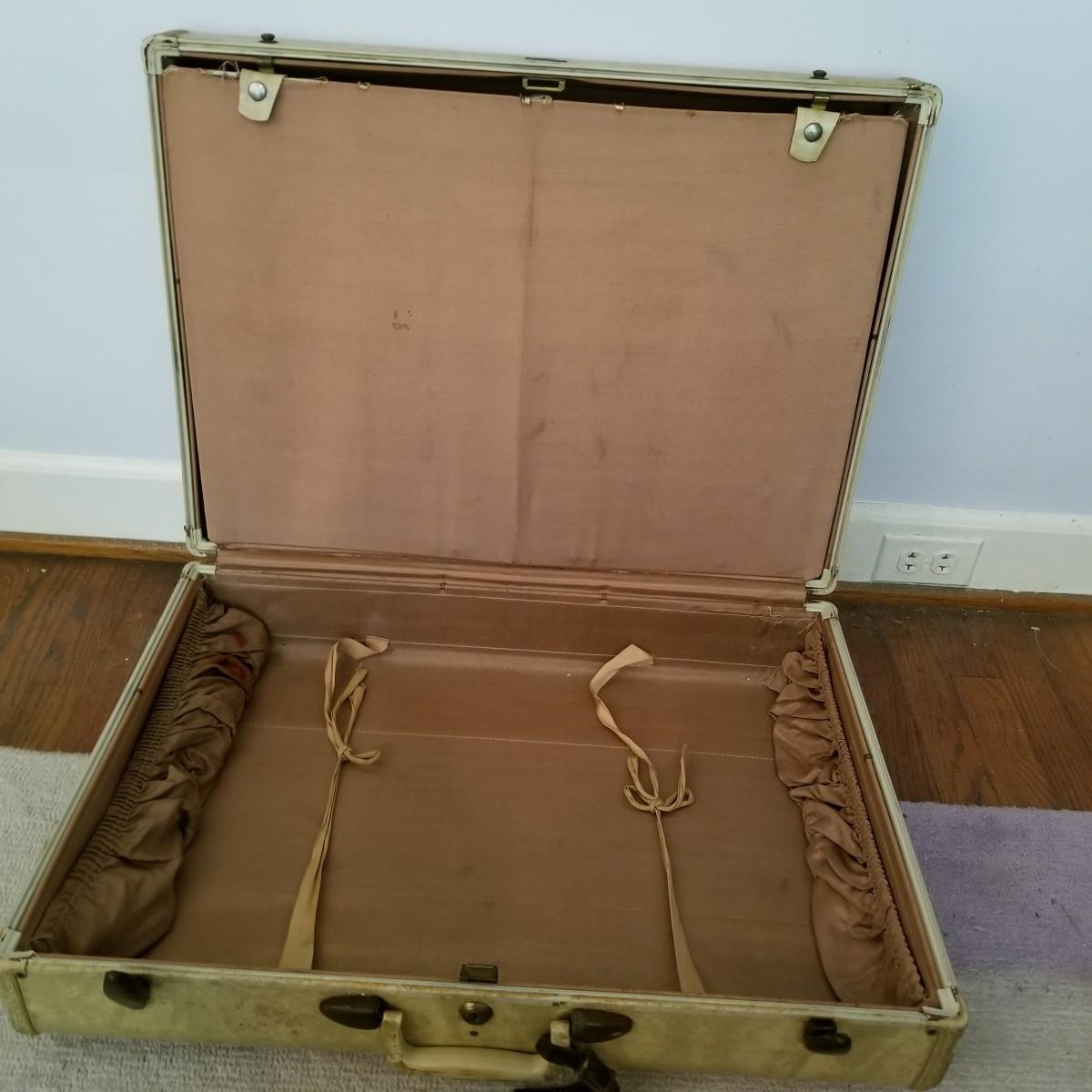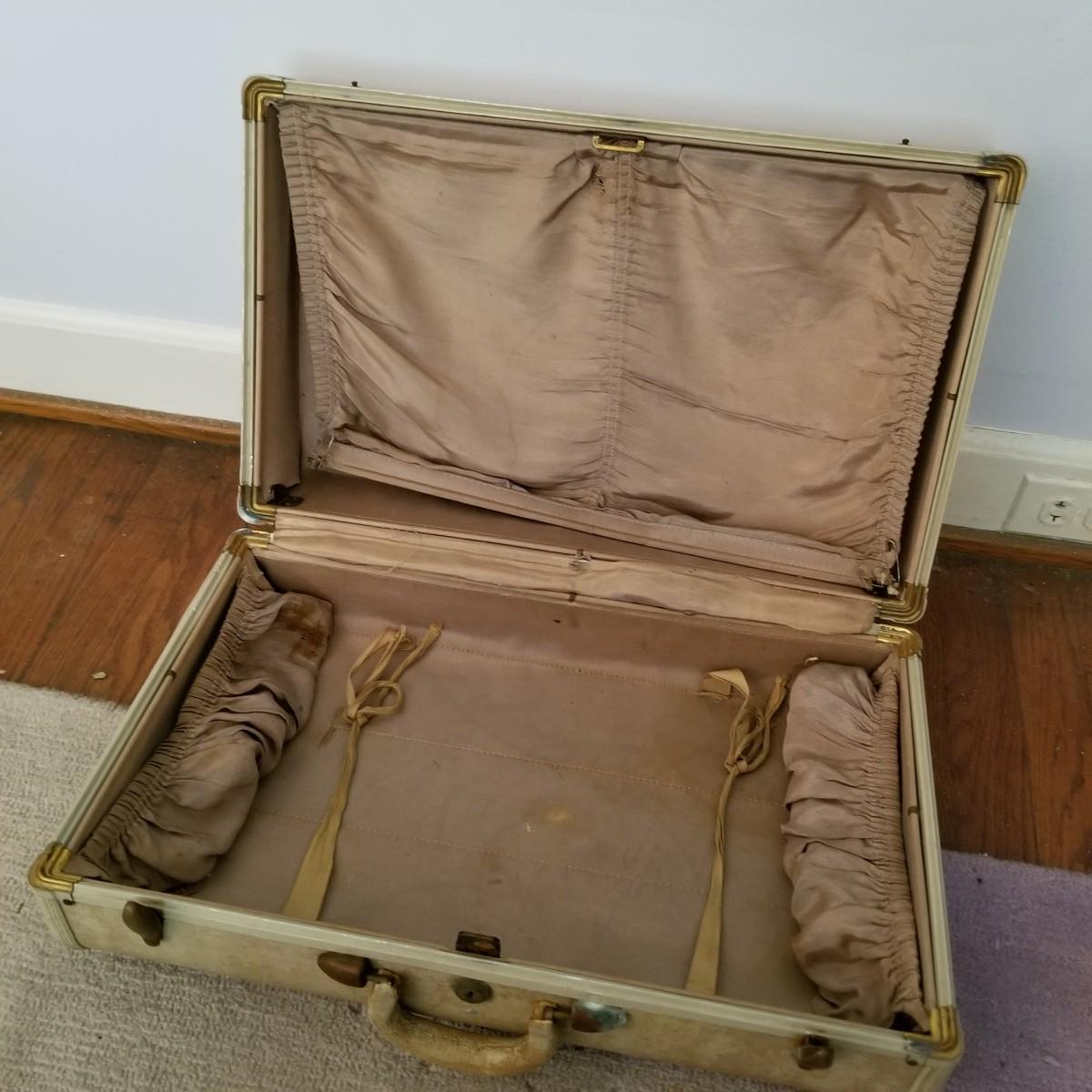 A vintage three piece matching set of Samsonite luggage. One large and one small suitcase, plus a hat box style handled case (style 4520). Pieces are well worn, and hardware shows some patina. Largest suitcase is 26" x 20" x 9". See photos for detail. Shipping available.