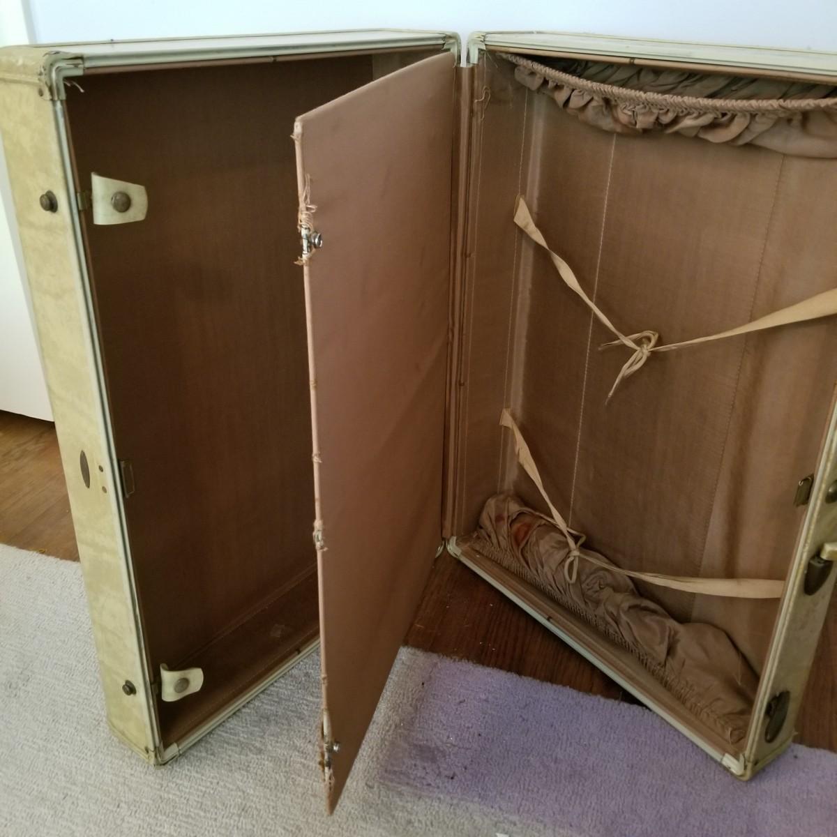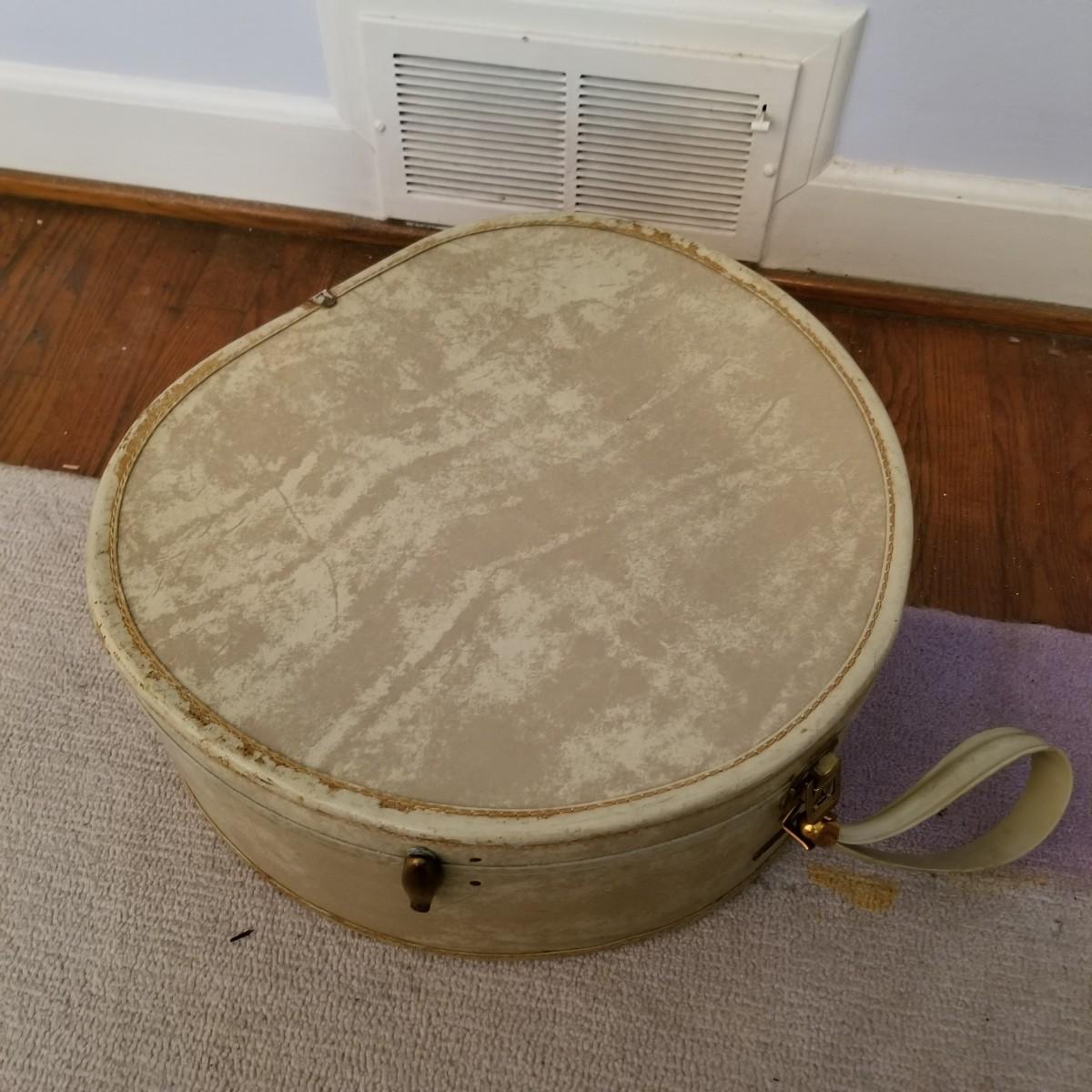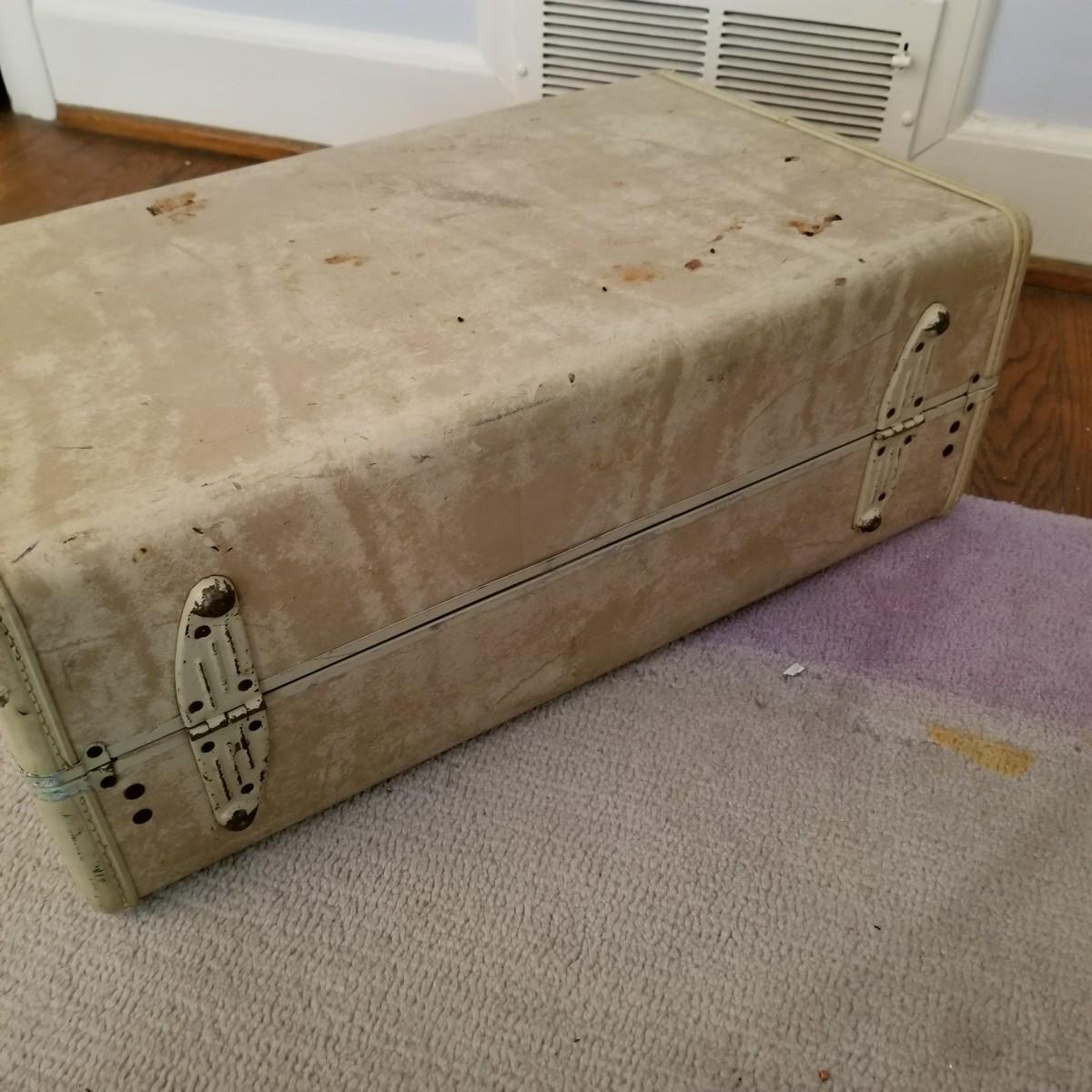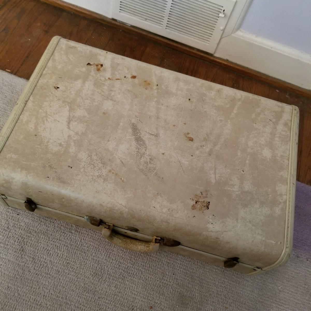 A vintage three piece matching set of Samsonite luggage. One large and one small suitcase, plus a hat box style handled case (style 4520). Pieces are well worn, and hardware shows some patina. Largest suitcase is 26" x 20" x 9". See photos for detail. Shipping available.