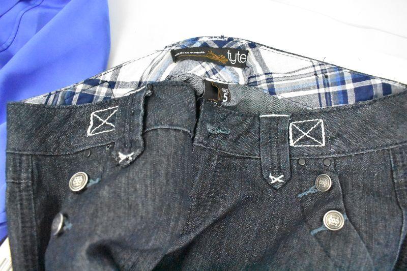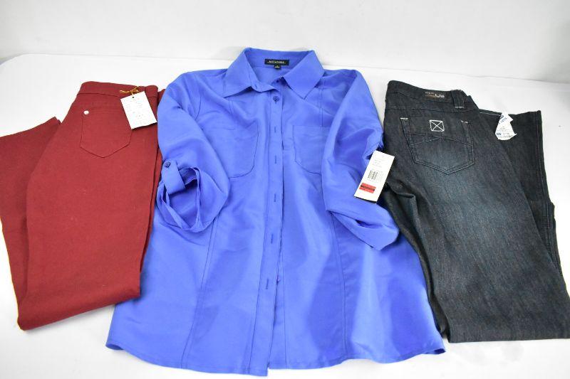 3 Piece Women's Clothing: Maroon Pants 30, Blue Shirt Small, Jeans Size 5 - New