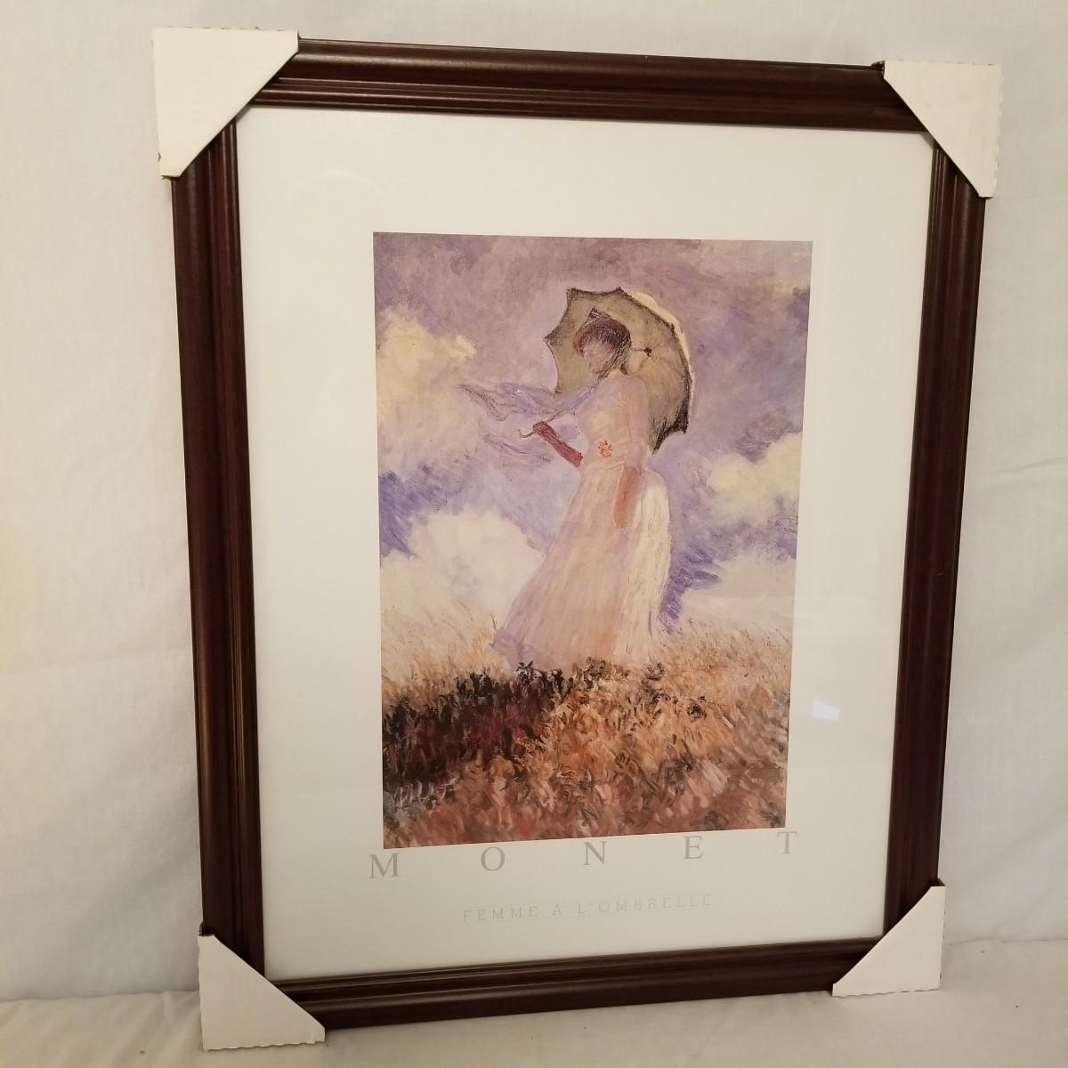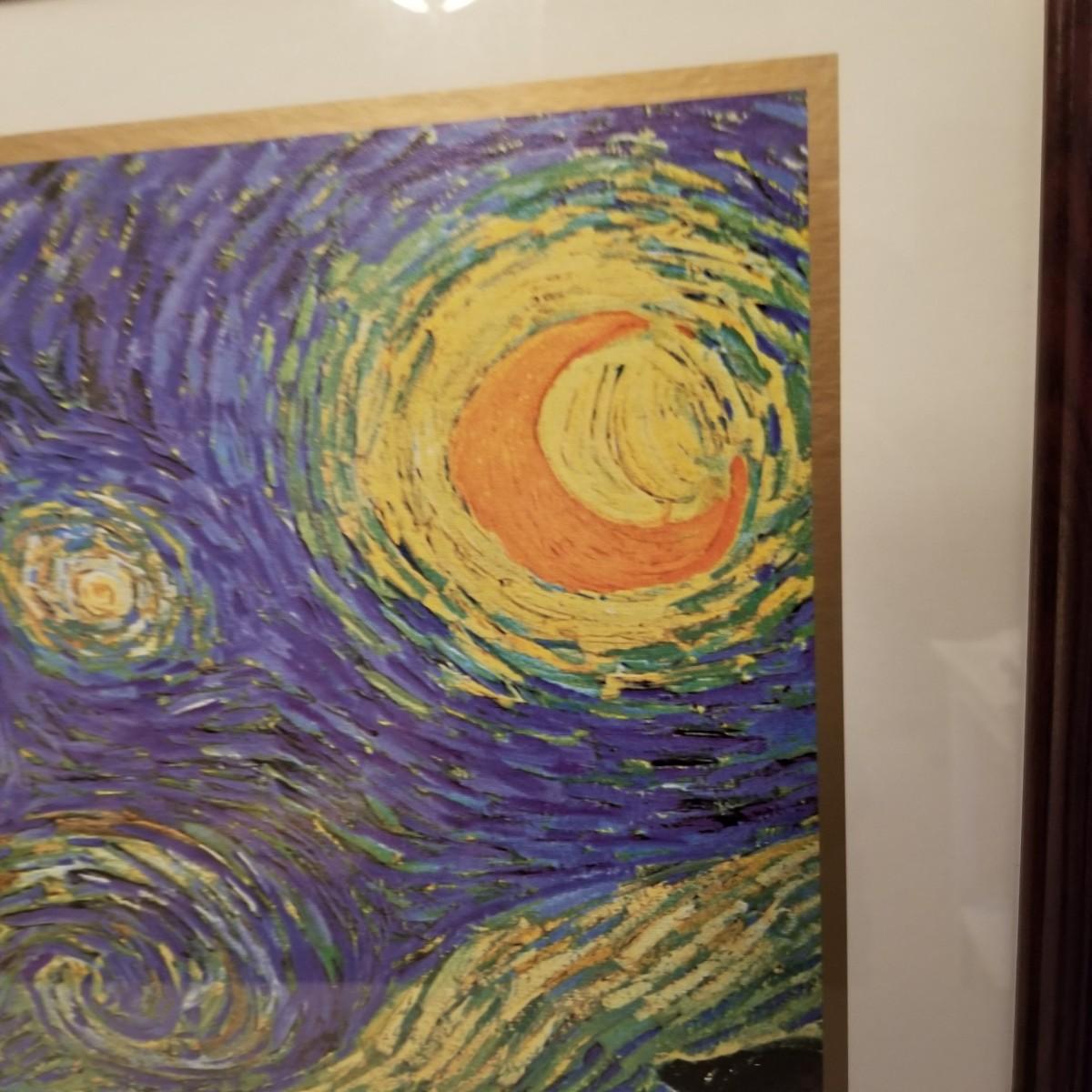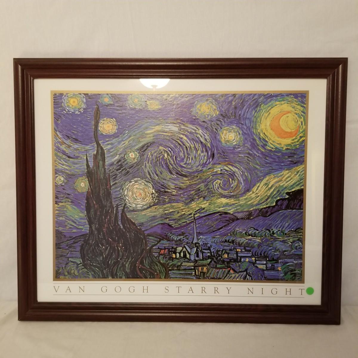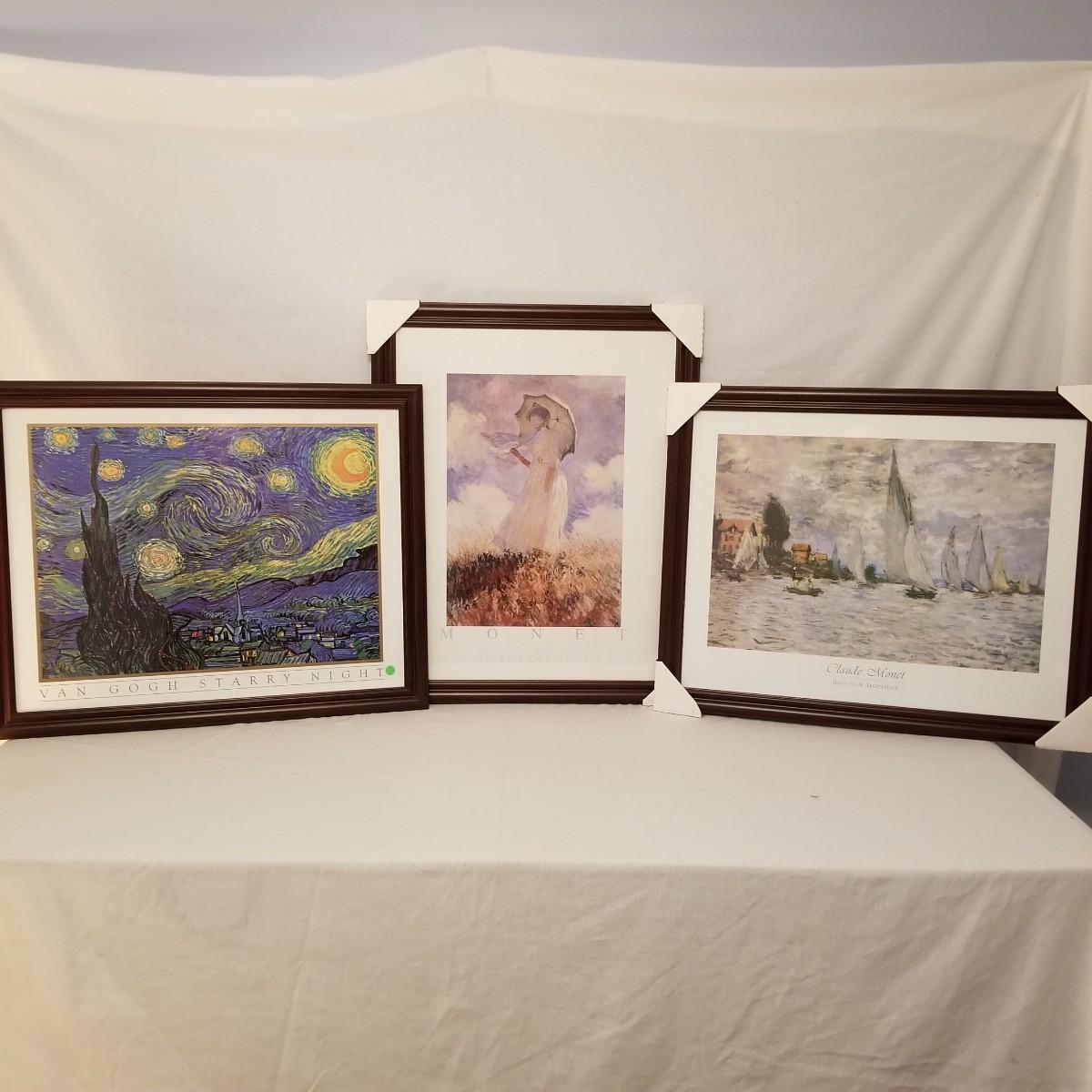 Three commercial framed pictures from the old masters, all under glass. Two Monet offerings and the unmistakable 'Starry Night ' by Van Gogh. All items in good to new condition, see photos for details. 25.5"x31.5" each. Shipping available. Shipping Art can be costly please call UPS store at 828-252-6930 for quote.