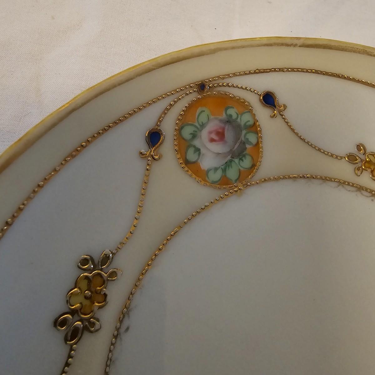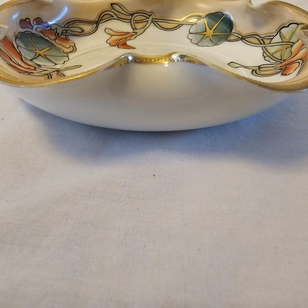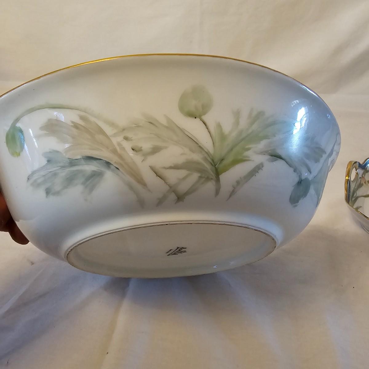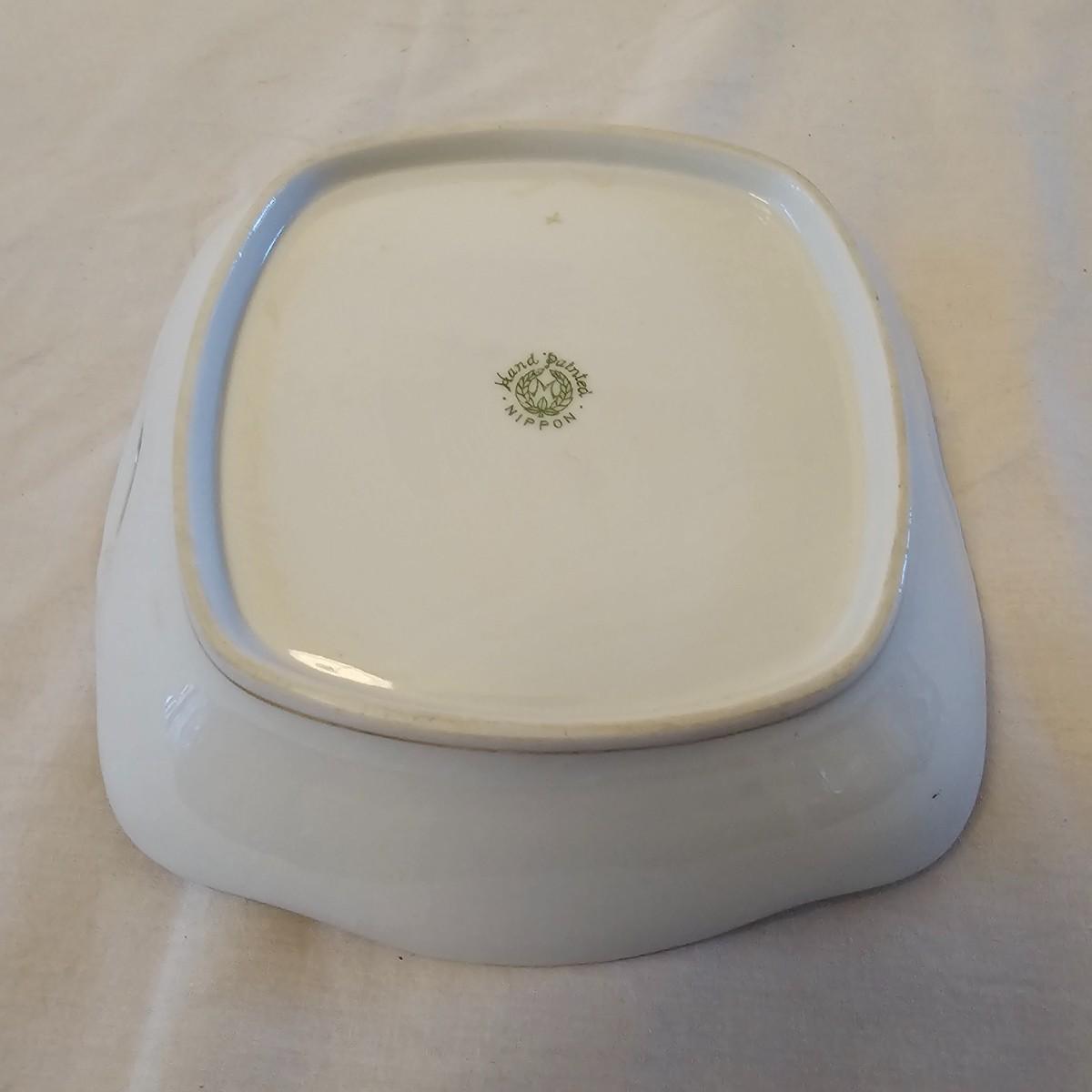 Four unique flower themed bowls that appear to be porcelain. The large round piece with flowers, leaves and pods, is Rosenthal from Bavaria and measures 10.5" D x 2.5"H. The handled squarish bowl has flowers and leaves running across the surface and decorated rim. The gold accents on flowers and leaves are raised as are they on the darker edges. This measures 7" x 7" x 2"H. The flute edged piece wraps around the inside edges of the bowl. The gold rim has tiny raised gold dots inside and out. This measures 7"D x 1"H. The smallest round item has raised gold dots that swirl around the pattern with a 6"D. Three smaller bowls stamped 'Hand painted-Nippon' on the bottoms. See photos for details. Shipping available.