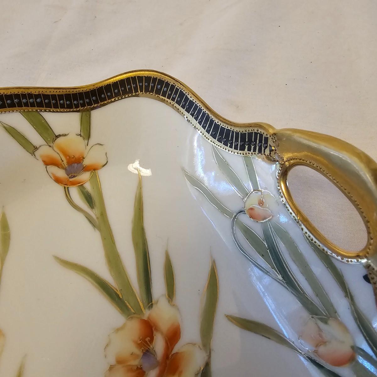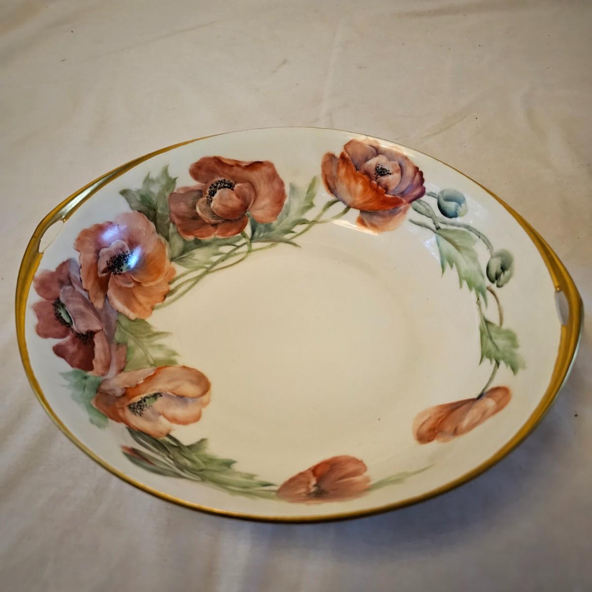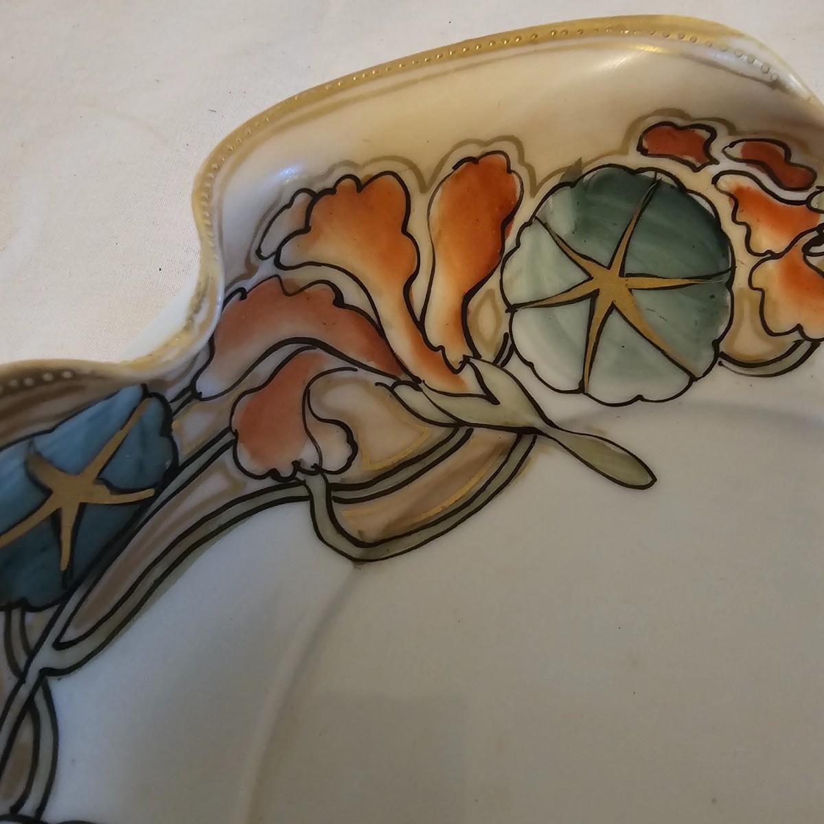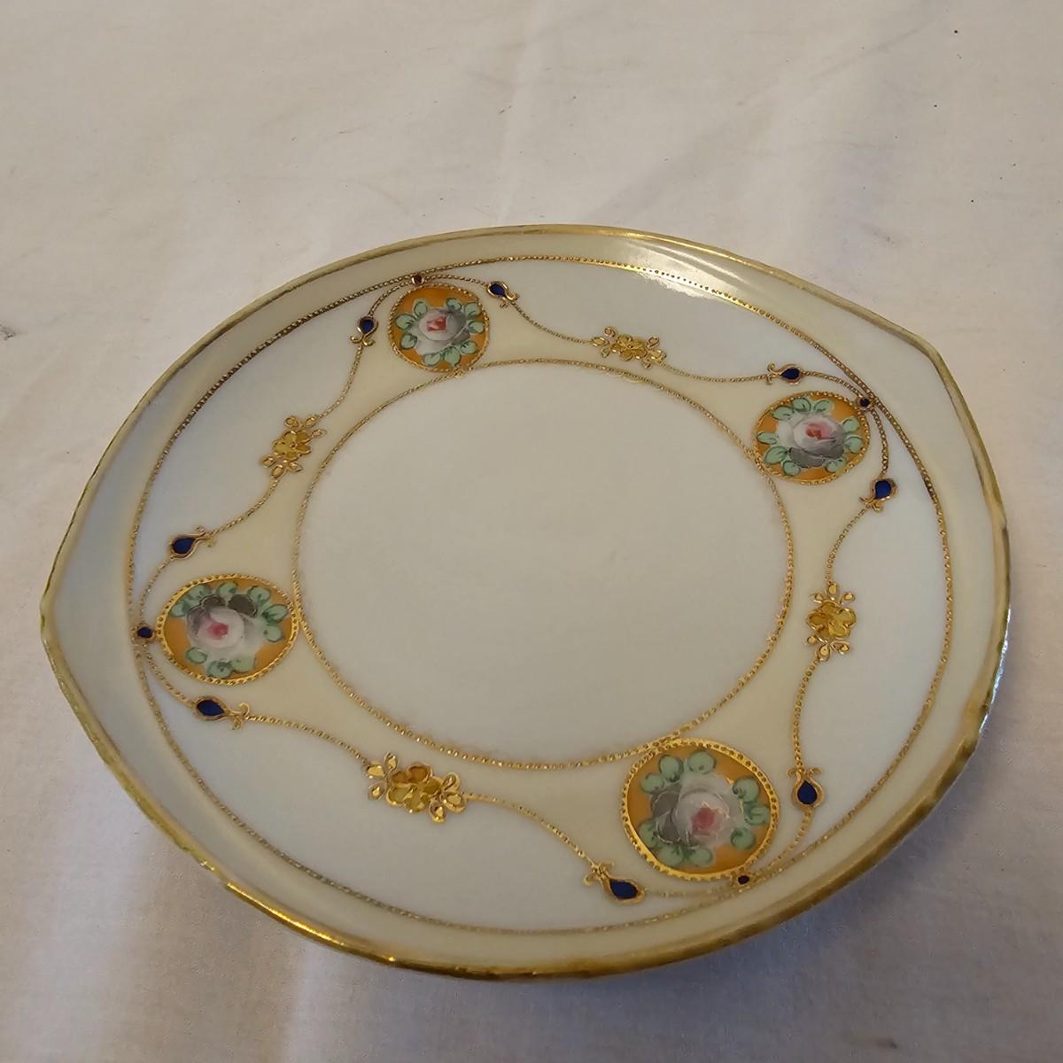 Four unique flower themed bowls that appear to be porcelain. The large round piece with flowers, leaves and pods, is Rosenthal from Bavaria and measures 10.5" D x 2.5"H. The handled squarish bowl has flowers and leaves running across the surface and decorated rim. The gold accents on flowers and leaves are raised as are they on the darker edges. This measures 7" x 7" x 2"H. The flute edged piece wraps around the inside edges of the bowl. The gold rim has tiny raised gold dots inside and out. This measures 7"D x 1"H. The smallest round item has raised gold dots that swirl around the pattern with a 6"D. Three smaller bowls stamped 'Hand painted-Nippon' on the bottoms. See photos for details. Shipping available.