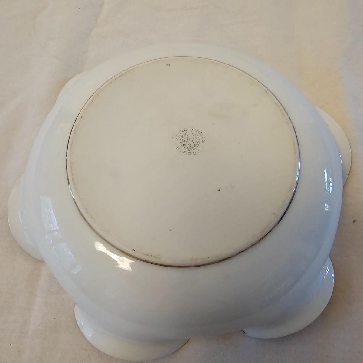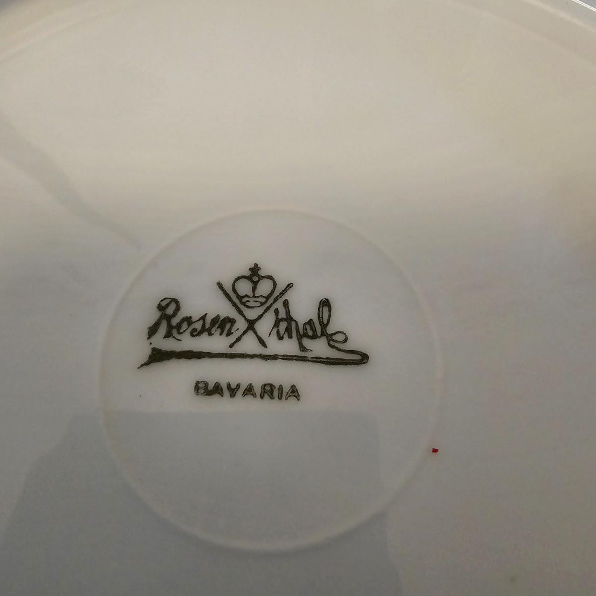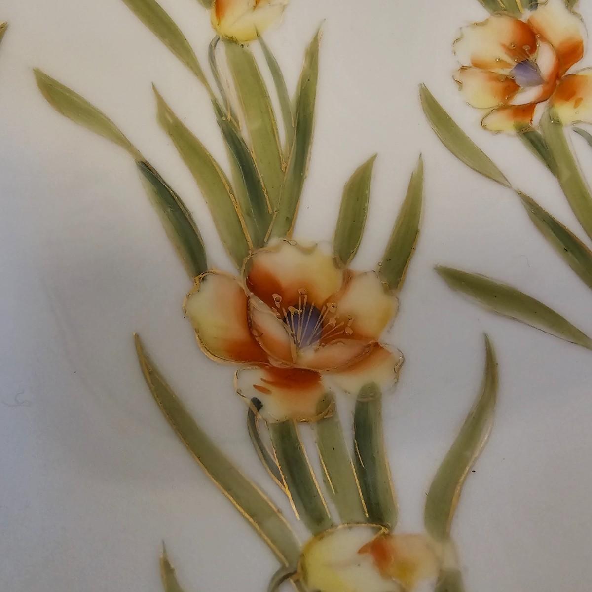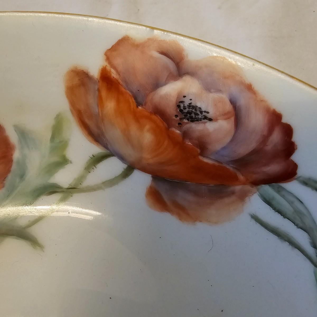 Four unique flower themed bowls that appear to be porcelain. The large round piece with flowers, leaves and pods, is Rosenthal from Bavaria and measures 10.5" D x 2.5"H. The handled squarish bowl has flowers and leaves running across the surface and decorated rim. The gold accents on flowers and leaves are raised as are they on the darker edges. This measures 7" x 7" x 2"H. The flute edged piece wraps around the inside edges of the bowl. The gold rim has tiny raised gold dots inside and out. This measures 7"D x 1"H. The smallest round item has raised gold dots that swirl around the pattern with a 6"D. Three smaller bowls stamped 'Hand painted-Nippon' on the bottoms. See photos for details. Shipping available.