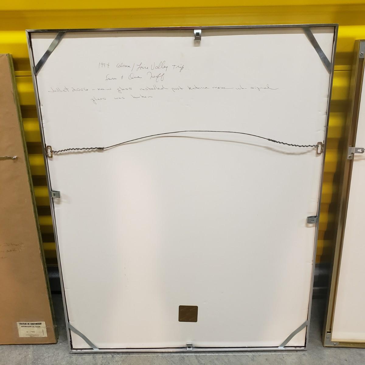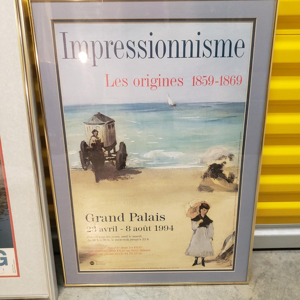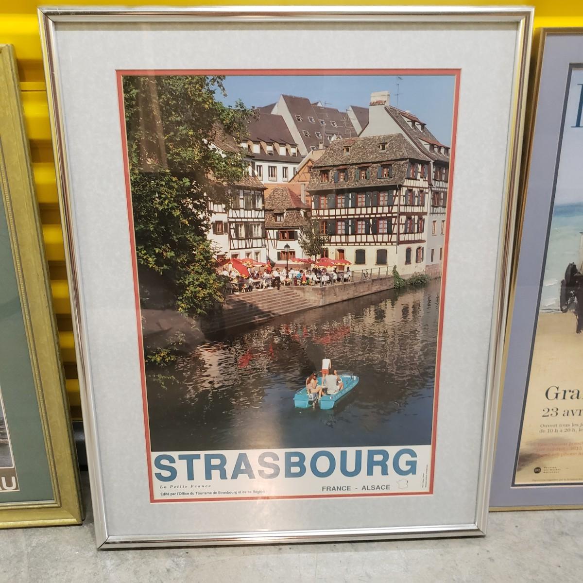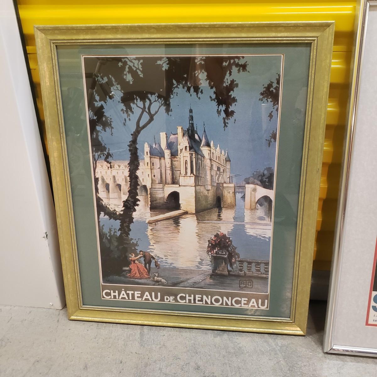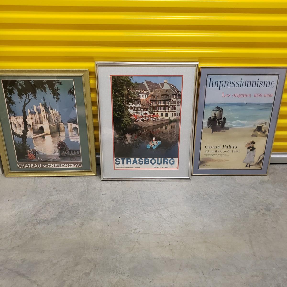 This lot contains 3 framed posters that have a French theme.The Chateau de Chenonceau is framed in a painted wooden frame that measures 22.5"x27". The Strasbourg print is framed in a metal silver frame and measures 22"x29". The final piece is Impressionnisme and framed in a gold metal frame and measures 19"x28". All frames and posters appear to be in good condition.
