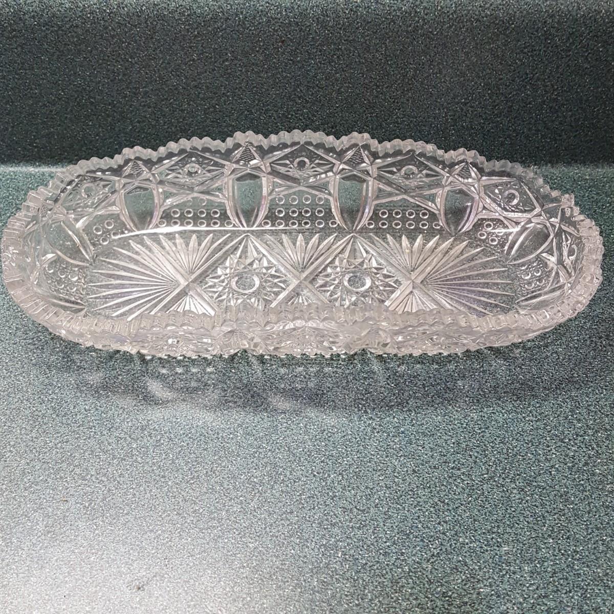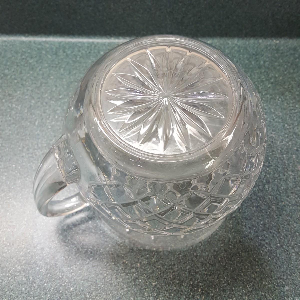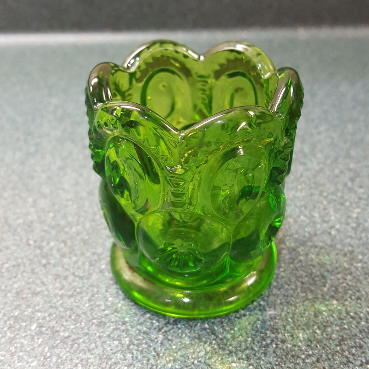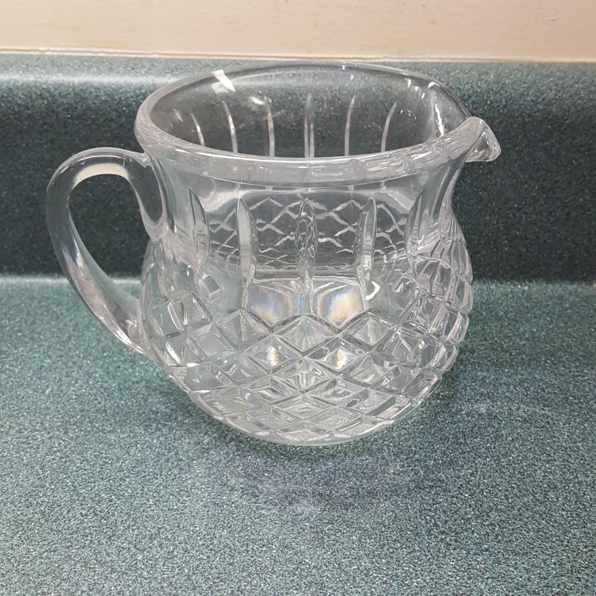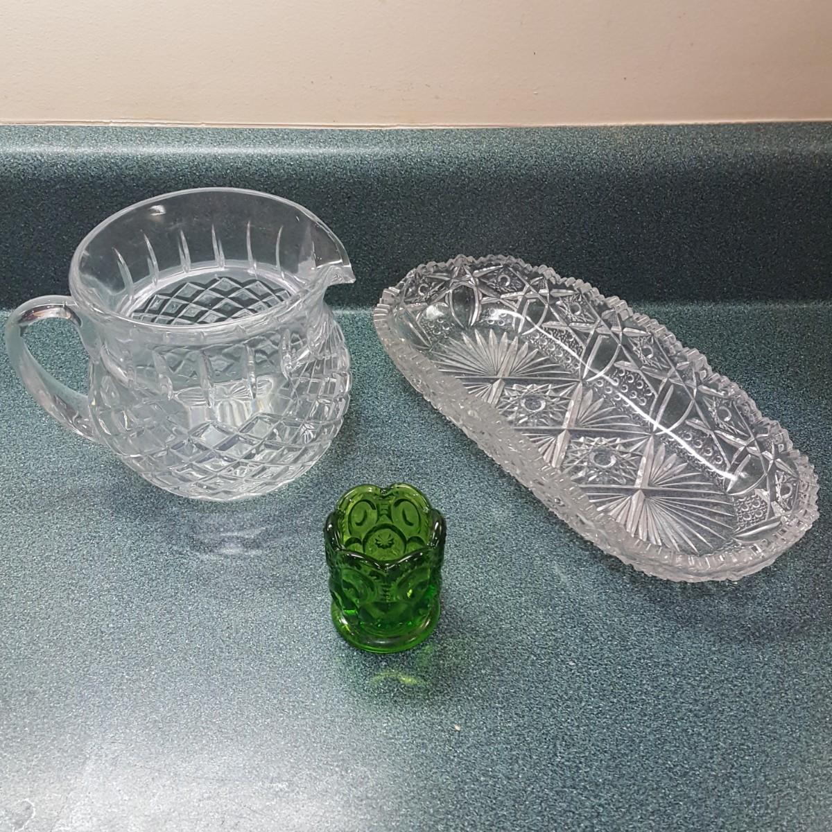 This lot features a heavy formed glass pitcher (6 inches x 5 inches), a long decorative glass bowl (2 inches x 5 inches x 10 inches) and a small green cup (3 inches x 2 inches).