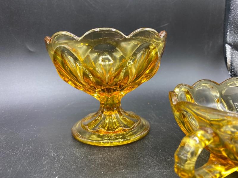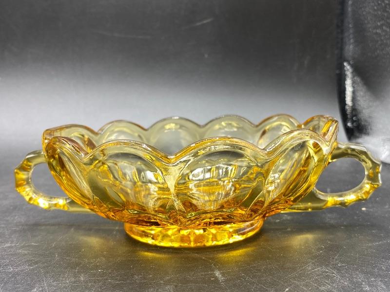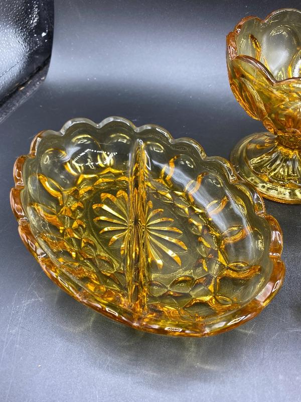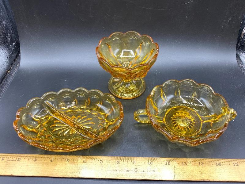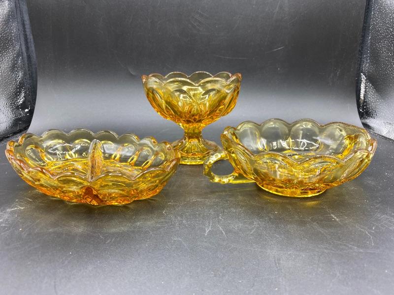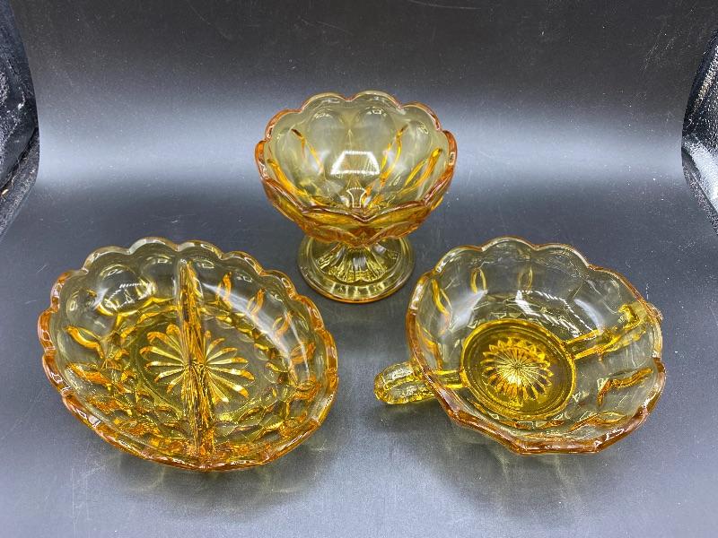 Set of 3 marigold amber depression glass pieces. Smaller size, perfect for relishes, nuts, or candy. Included is a divided oval bowl, a footed bowl, and a double handle bowl. All in good condition, no chips. Great for a pop of color to your dinner party or china cabinet.