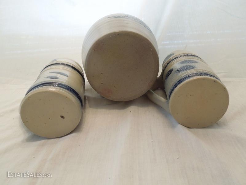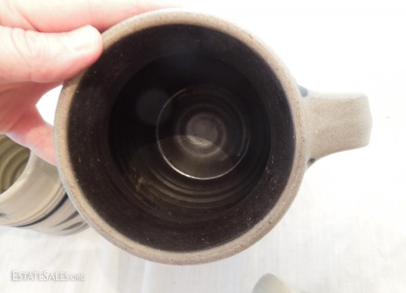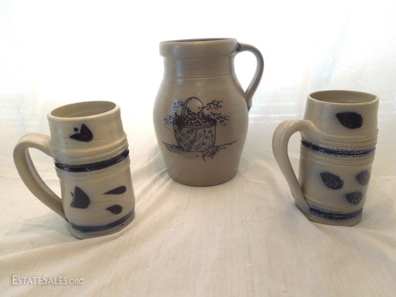 2 6" mugs and 9" pitcher. Grey stoneware painted blue. Pitcher has blue interior. No chips or cracks.