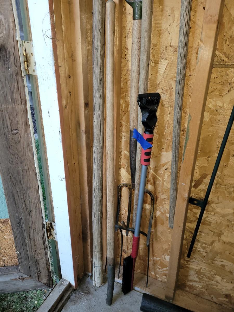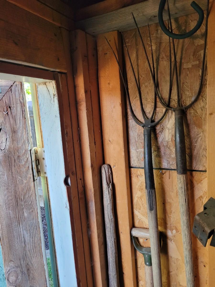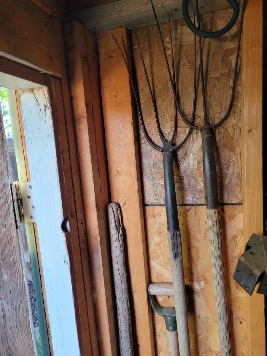 3 pitchforks, 1 pitchfork handle off, walking stick and icescraper