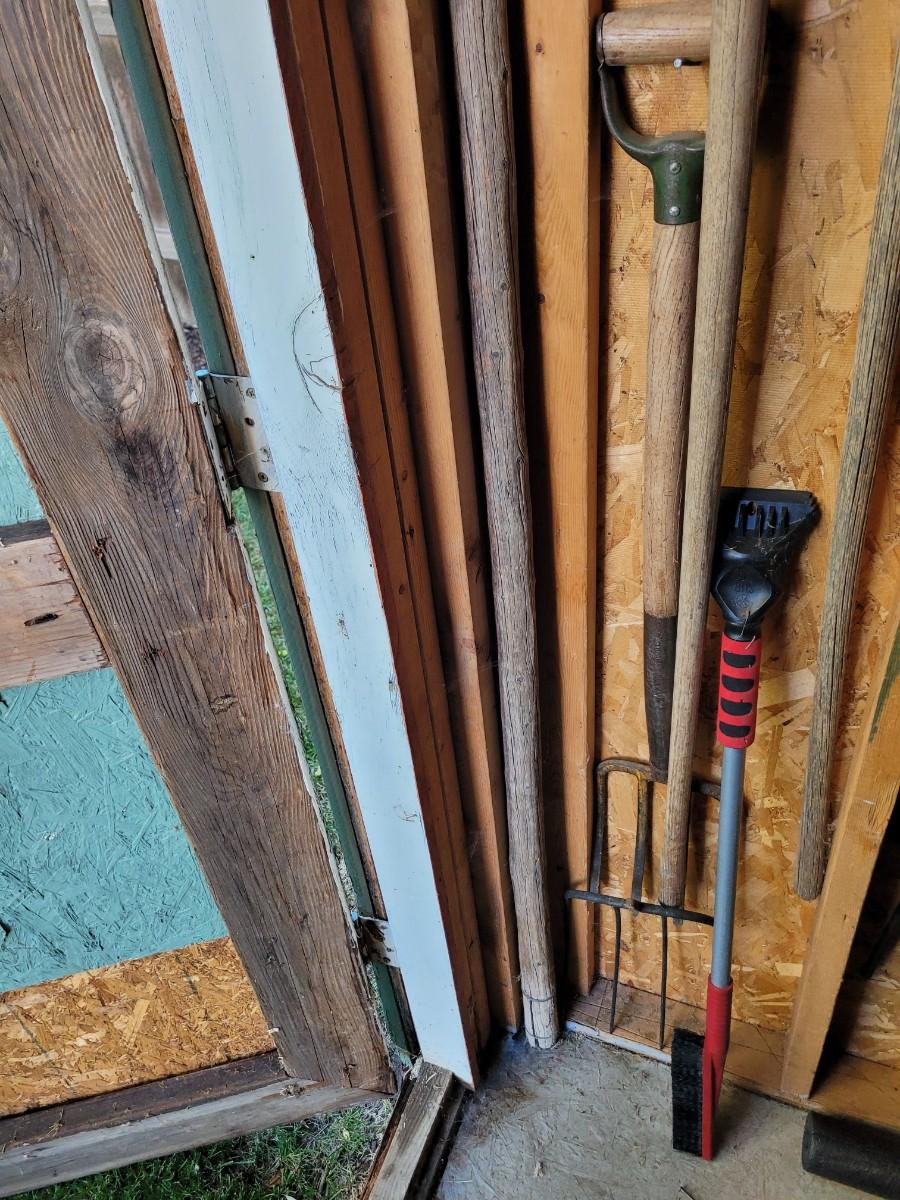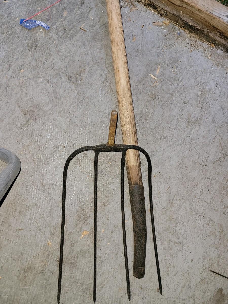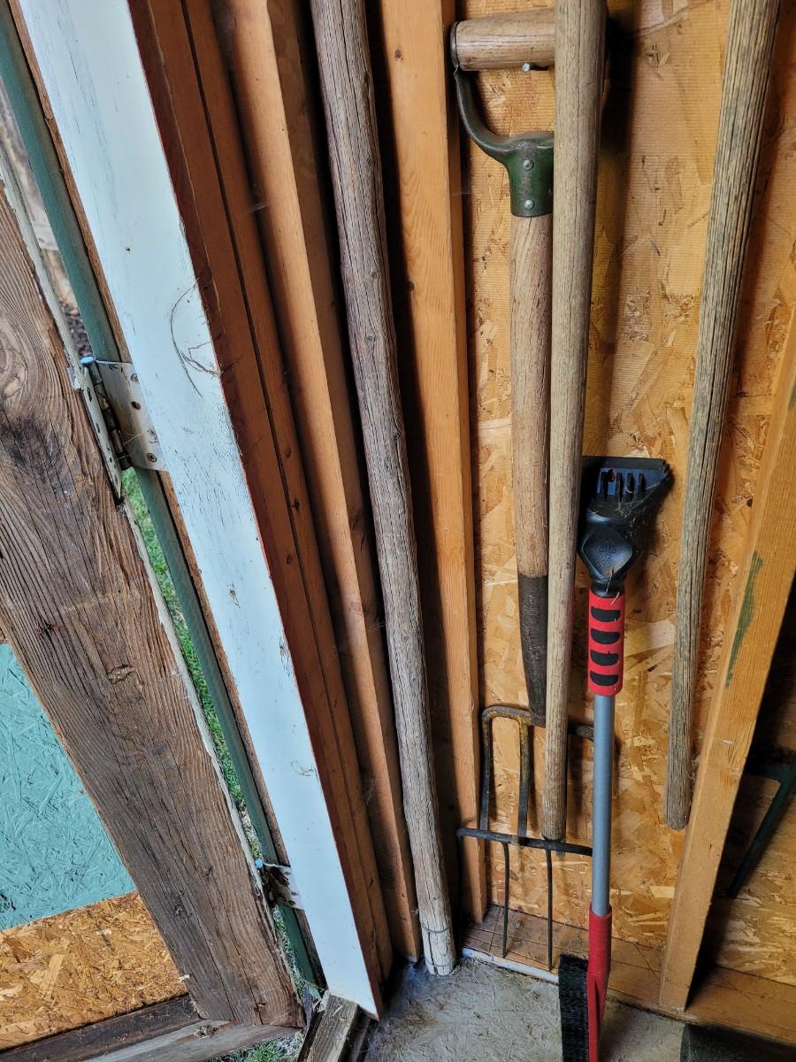 3 pitchforks, 1 pitchfork handle off, walking stick and icescraper