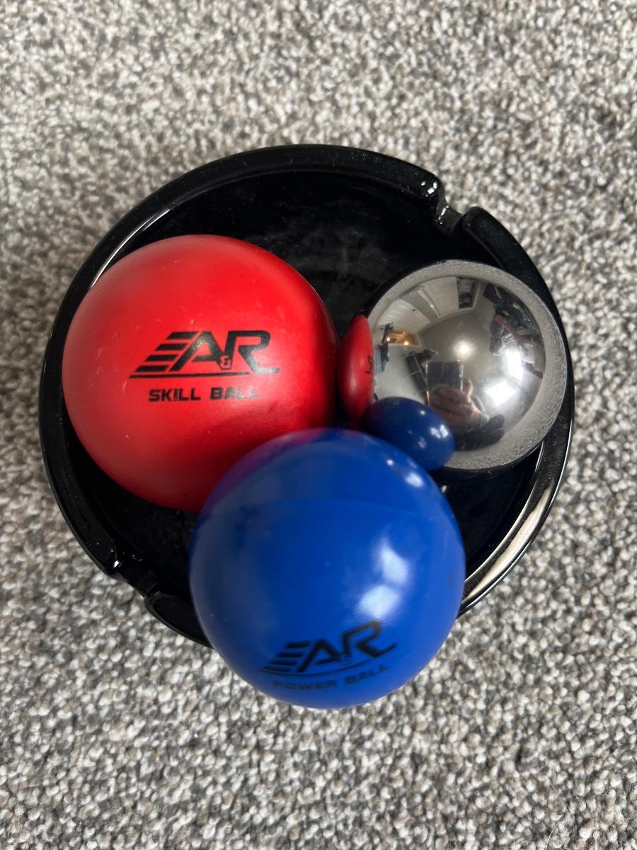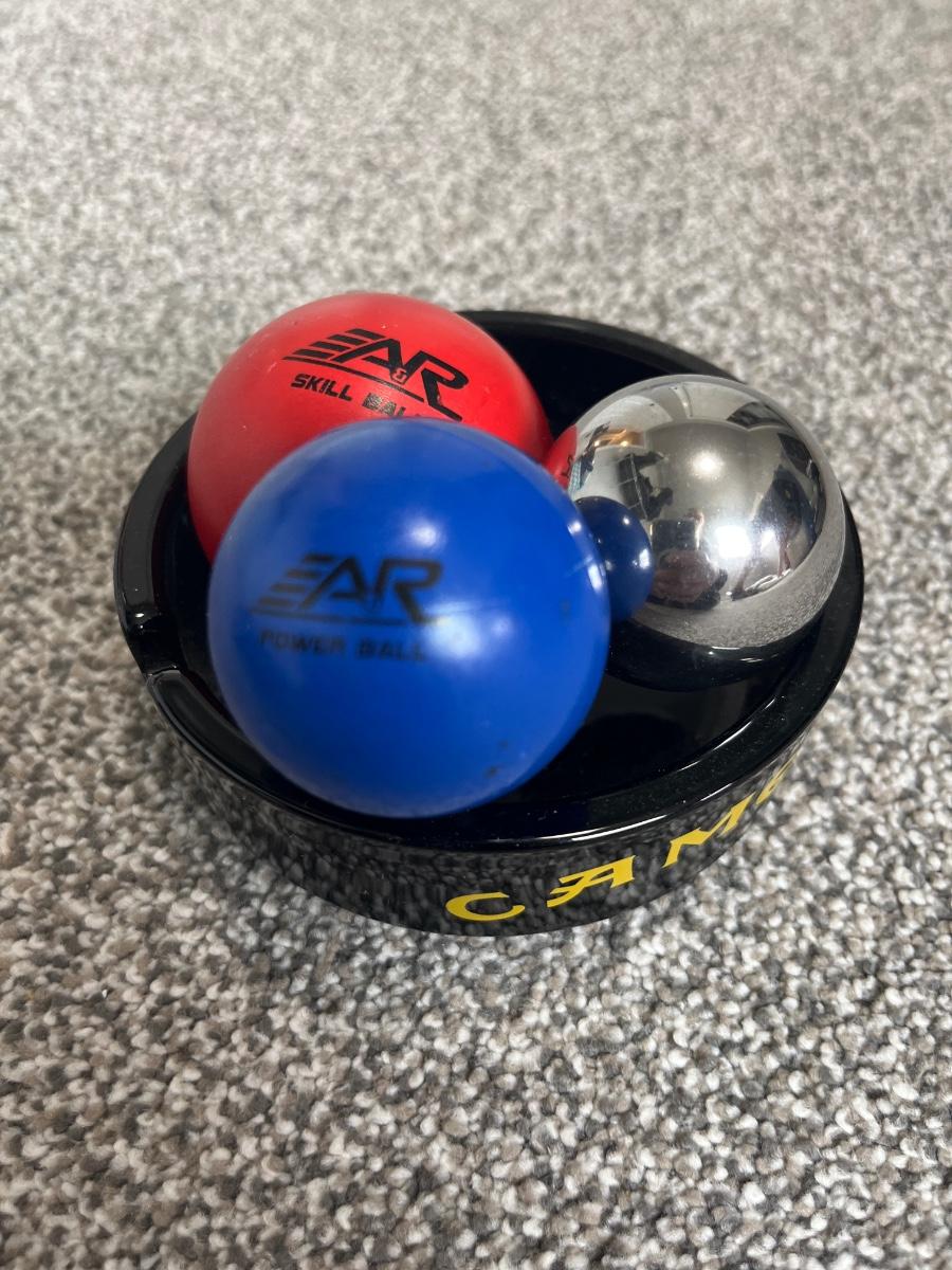 3 pk hockey stick, practice balls, and ashtray