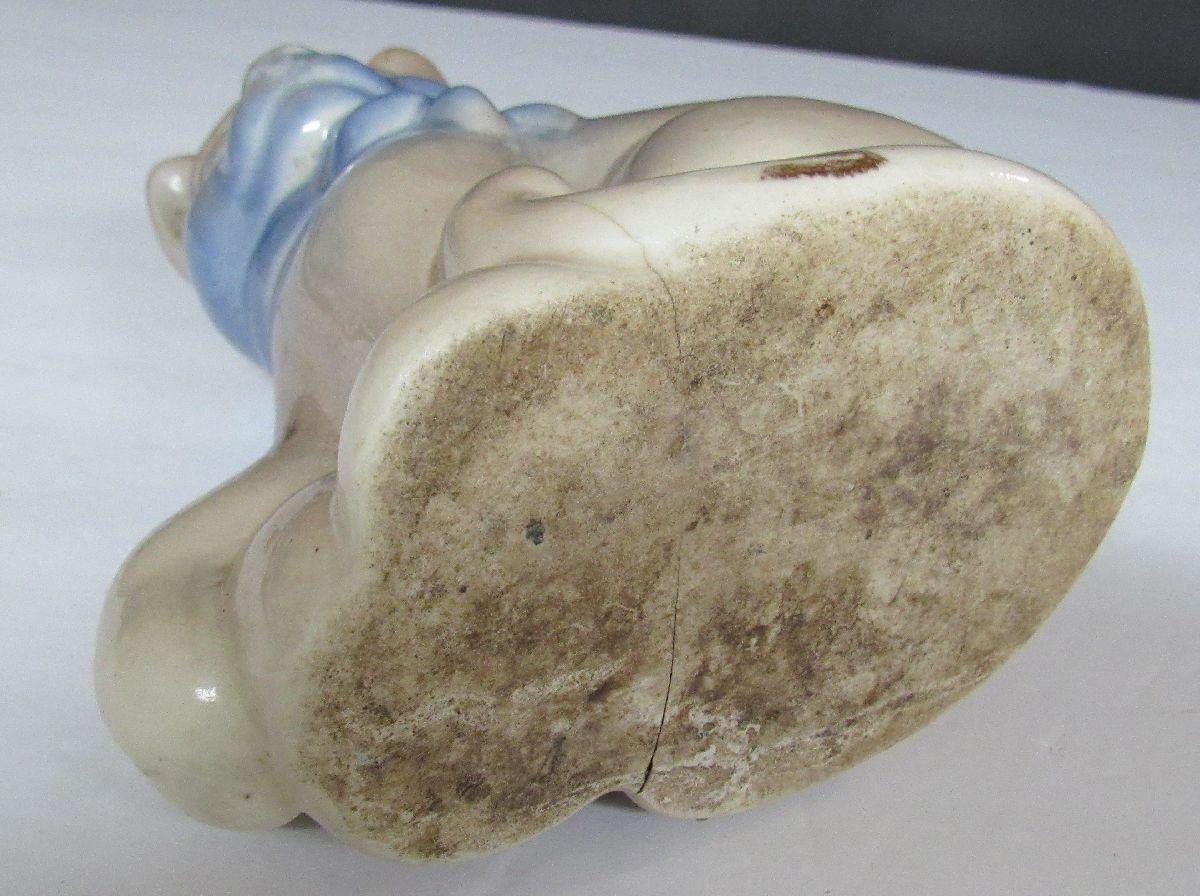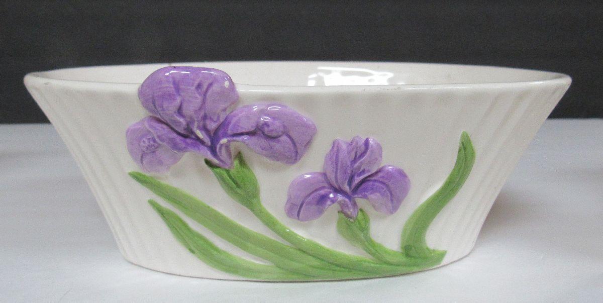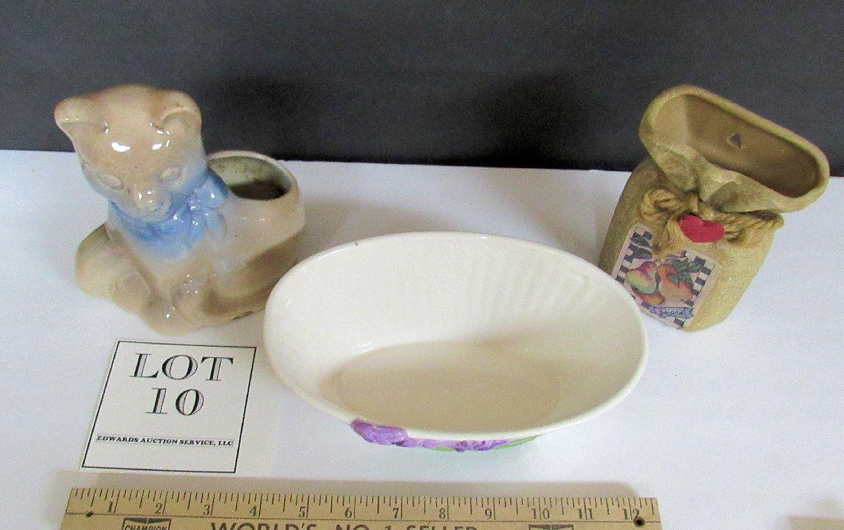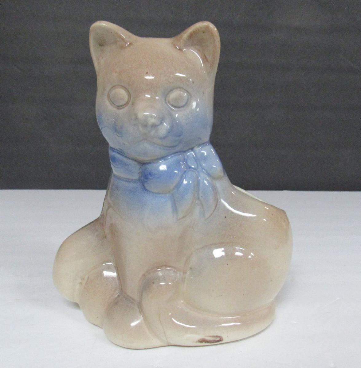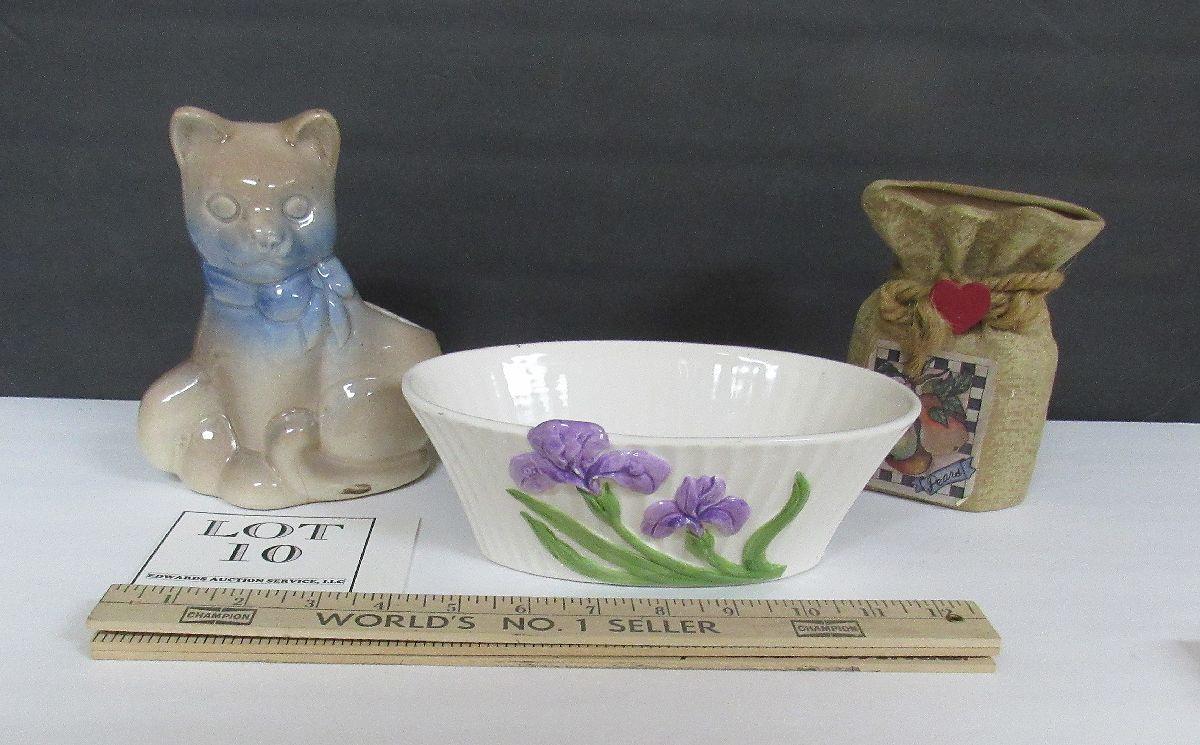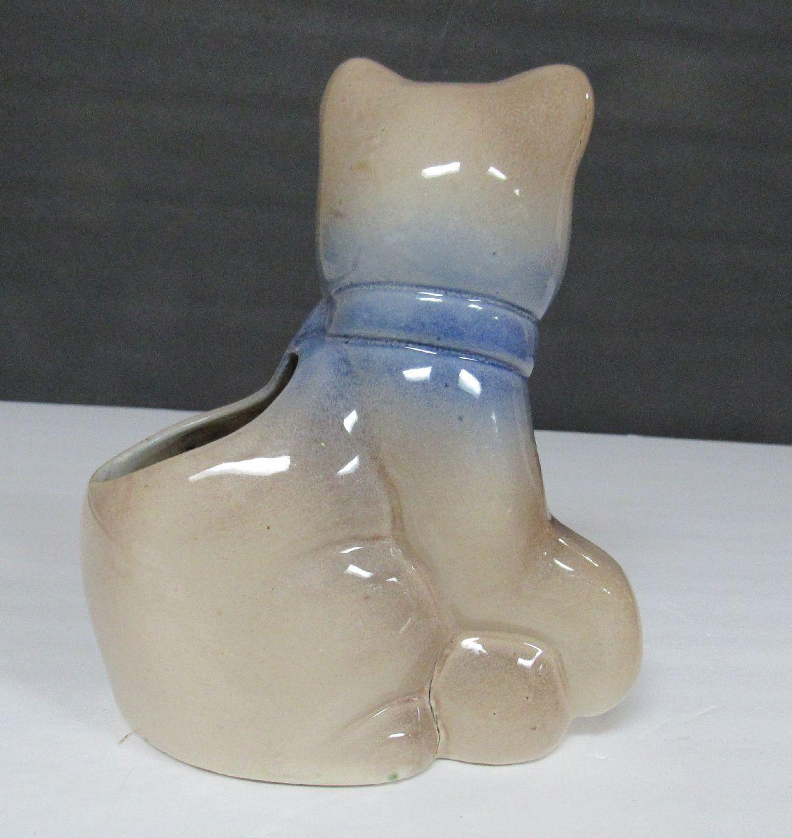 The cat has crack on bottom as seen in photos. The iris planter has a few paint nicks.
