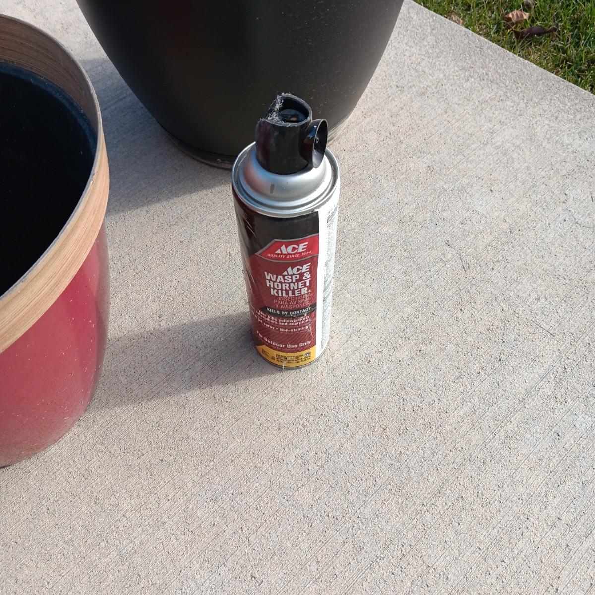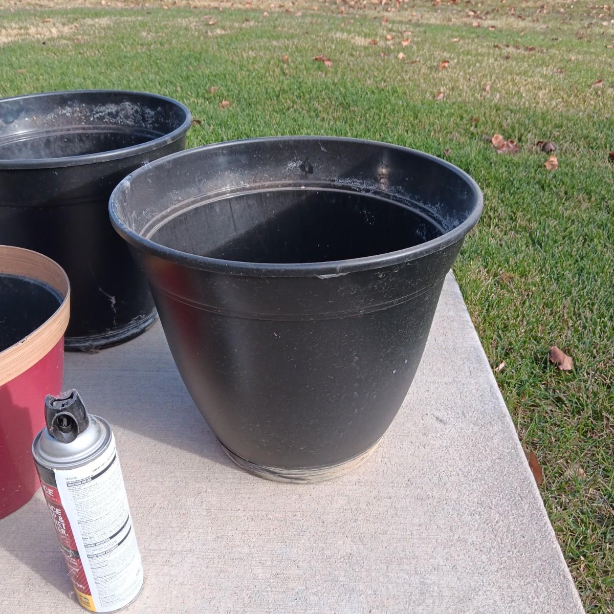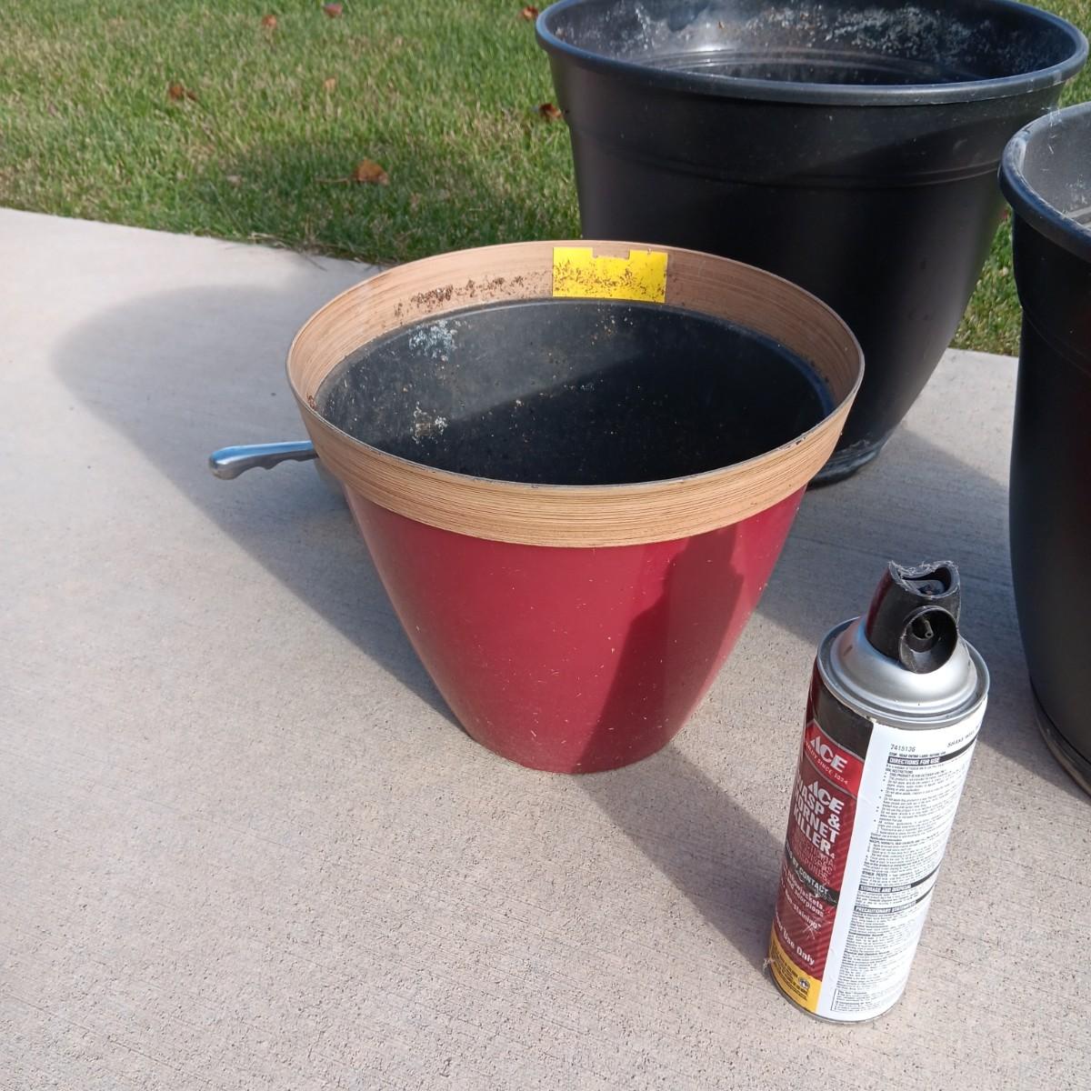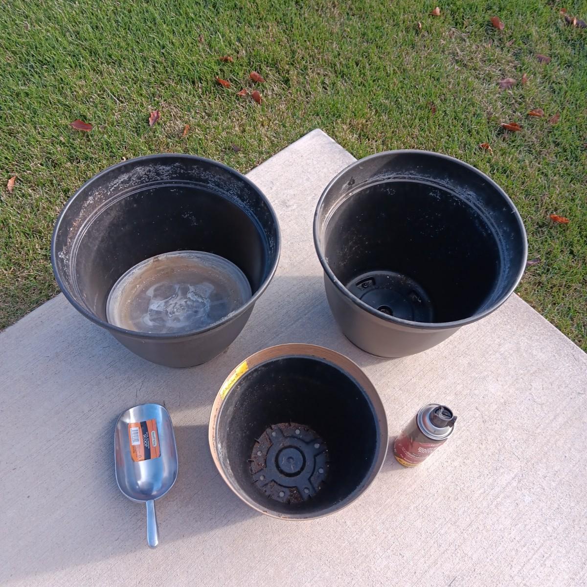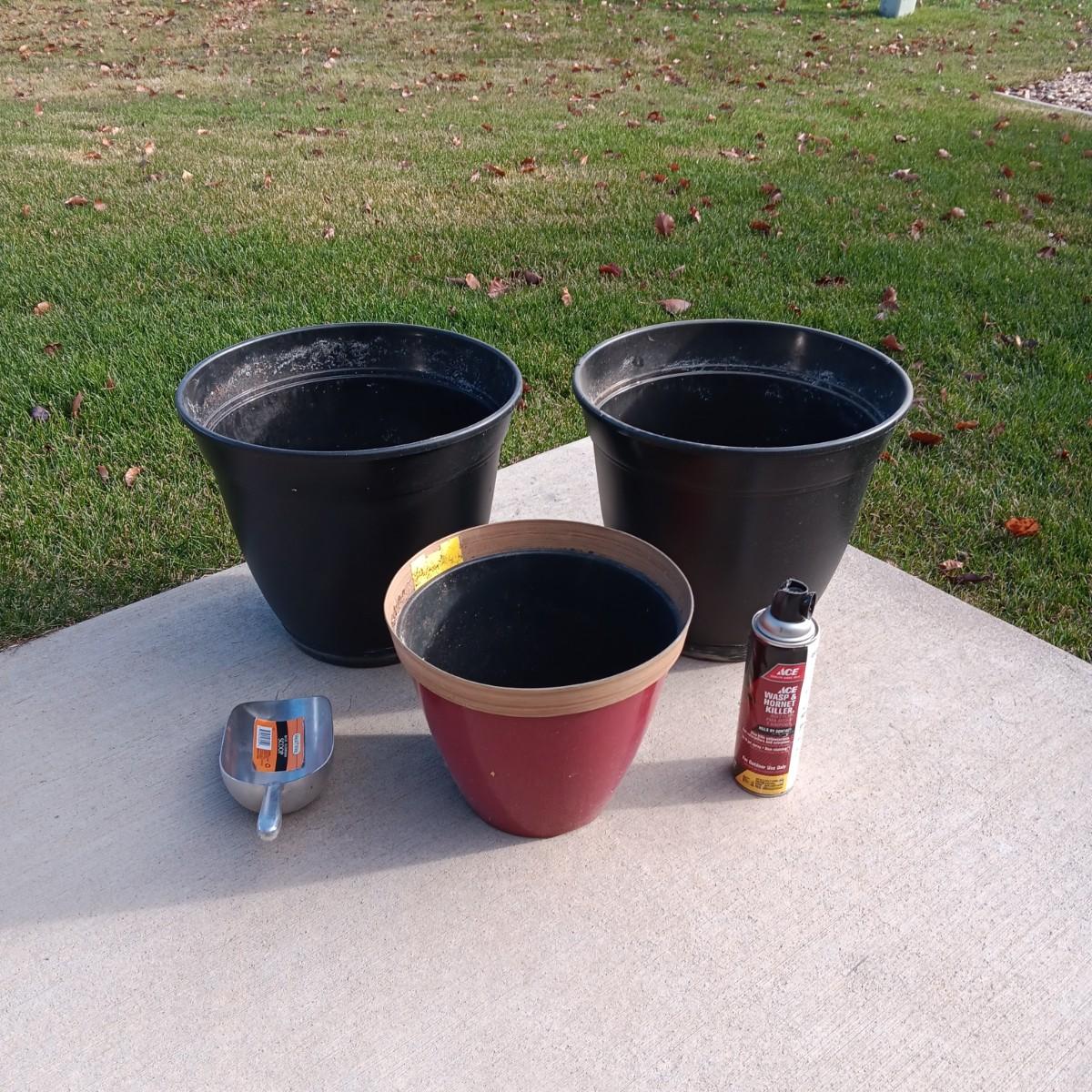 3 PLASTIC FLOWER POTS, NEW ALUMINUM SCOOP AND WASP SPRAY
