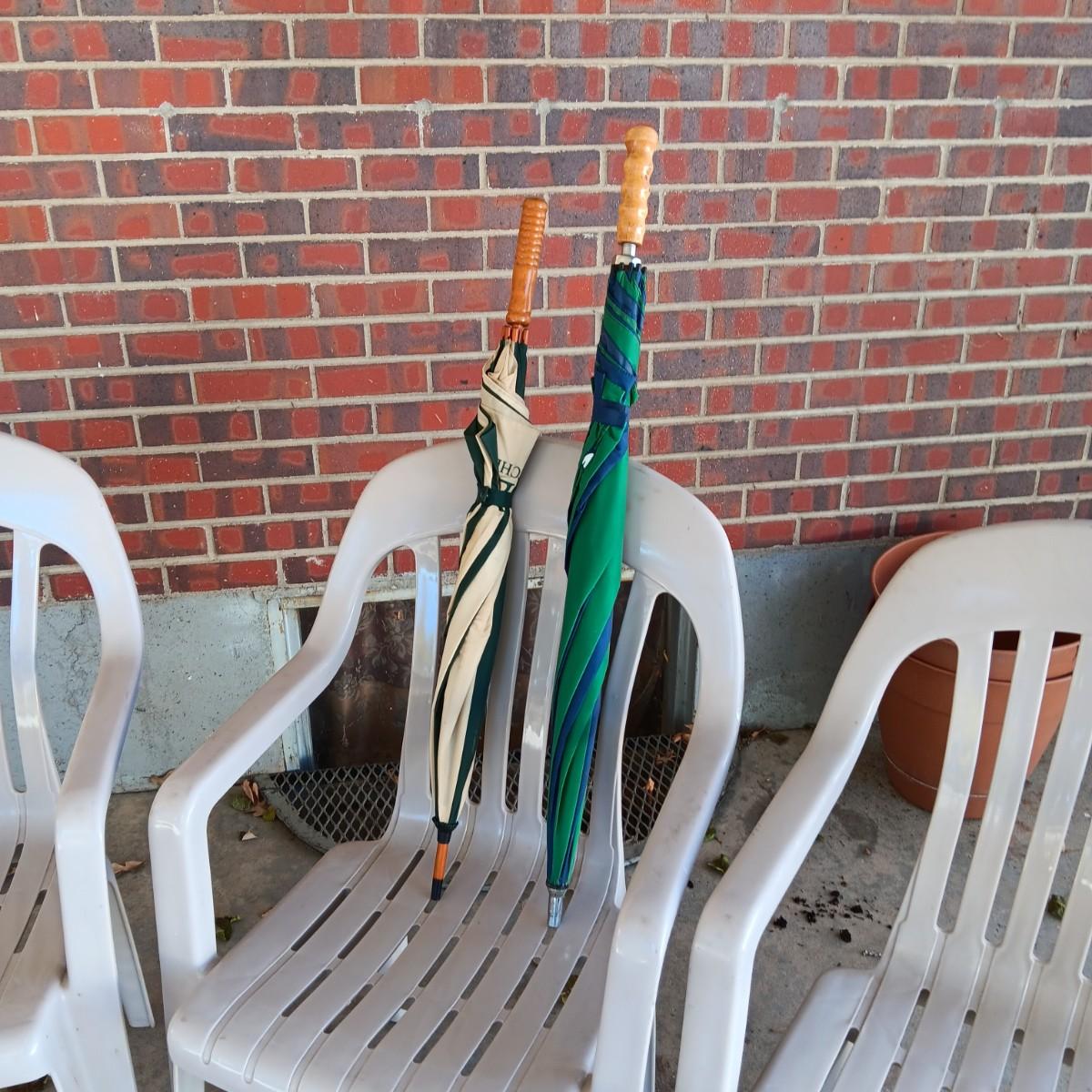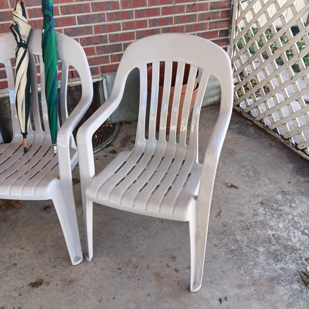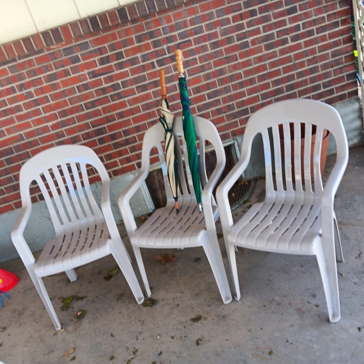 3 PLASTIC STACKING CHAIRS AND 2 UMBRELLAS