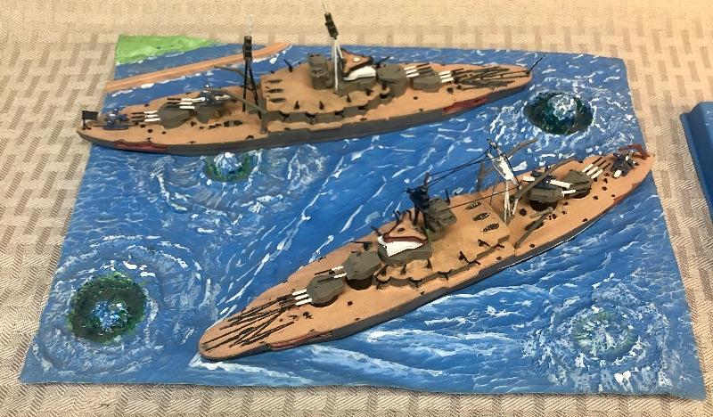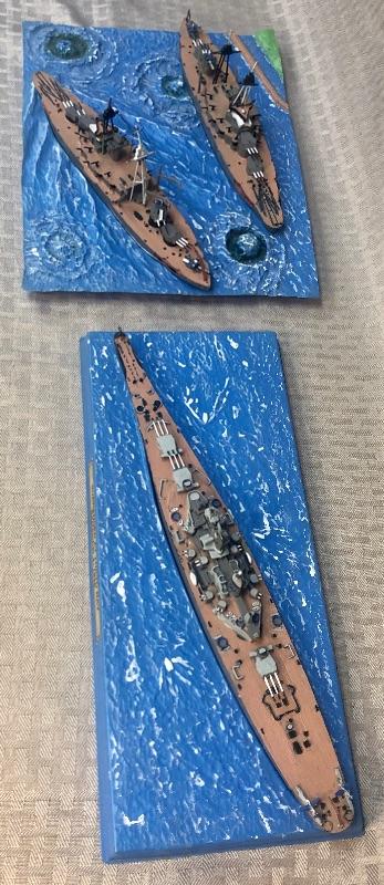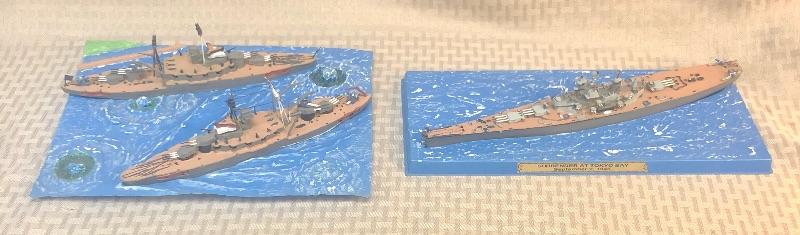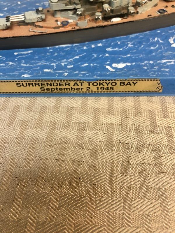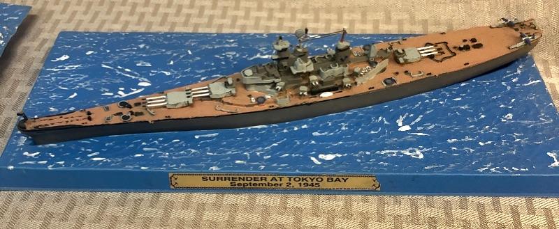 3 ship models in 2 display base dioramas, one is the USS Missouri in Tokyo Bay, 12” long, the other 2 are unknown US WWII battleships. Each approx. 8” long.