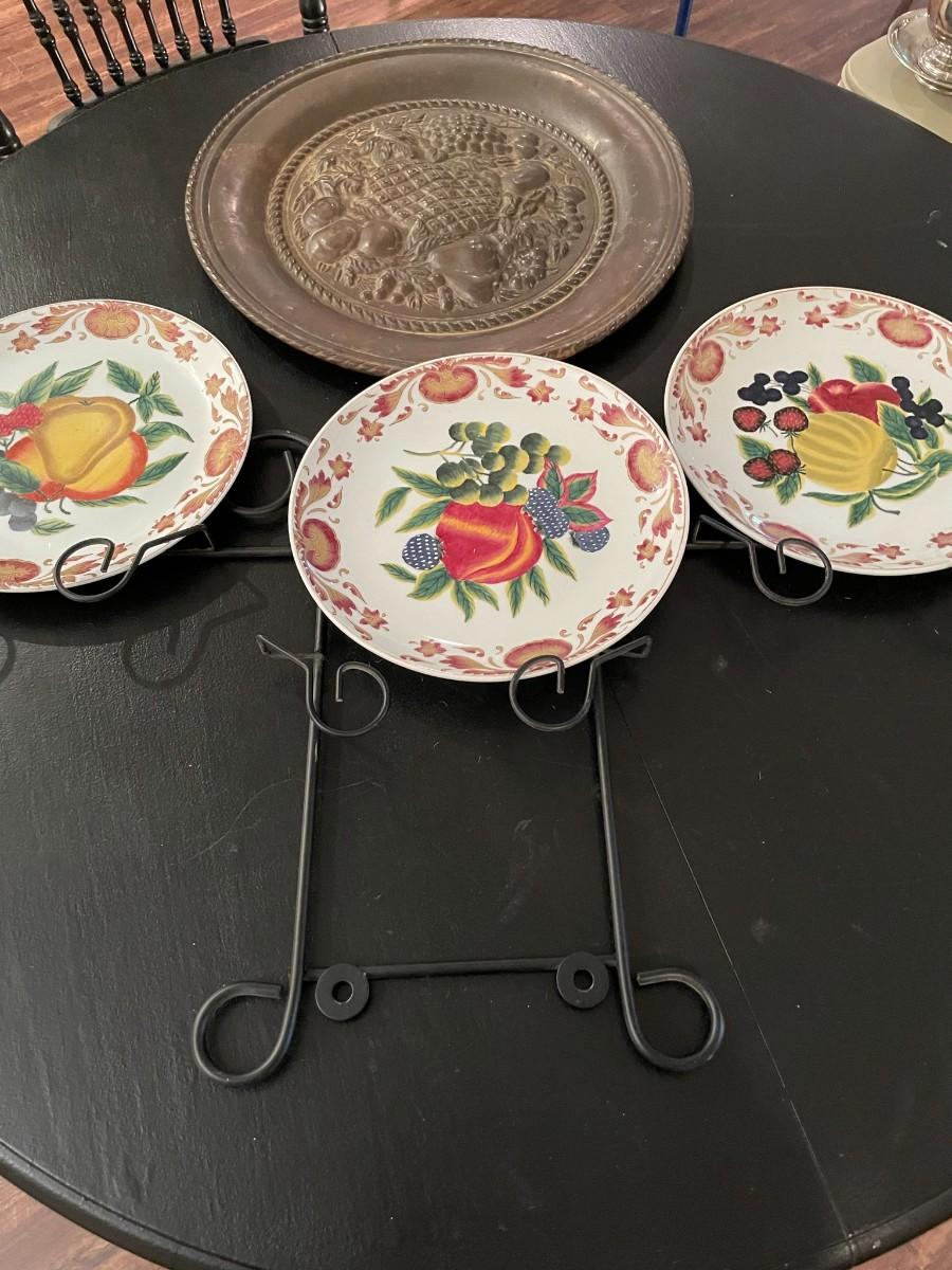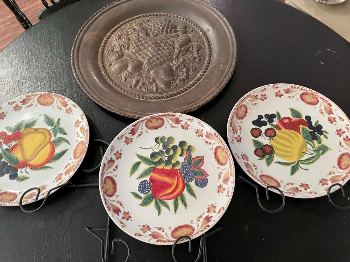 5 items: 3 Plates with Fruit Design, 1 wall plate holder and 1 Round Metal Decor Wall Art