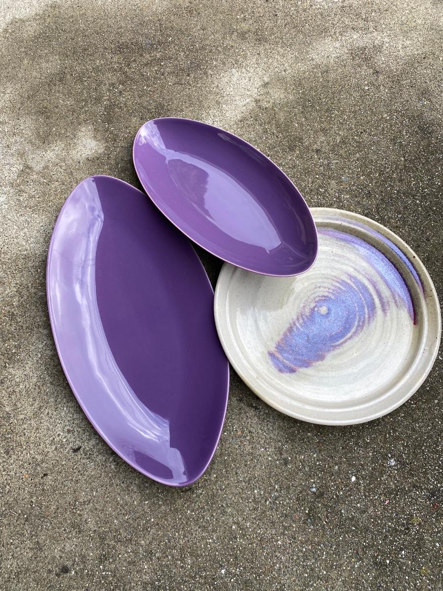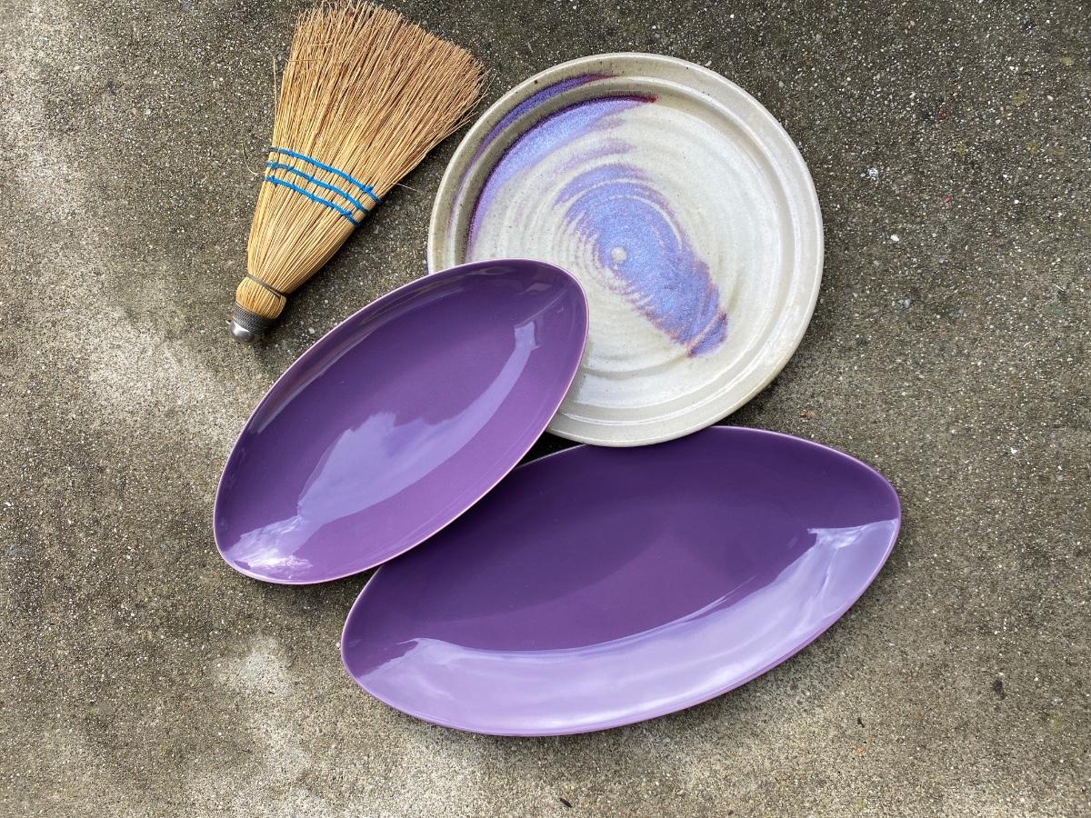 Two unique oblong purple platters.