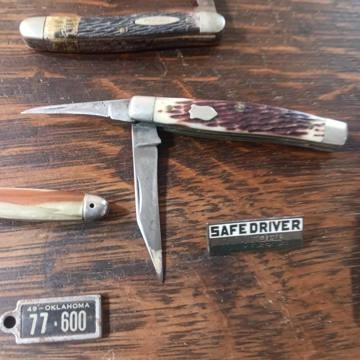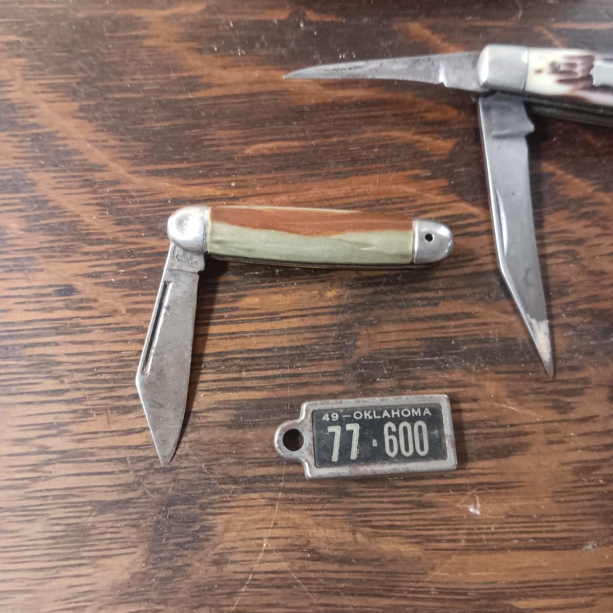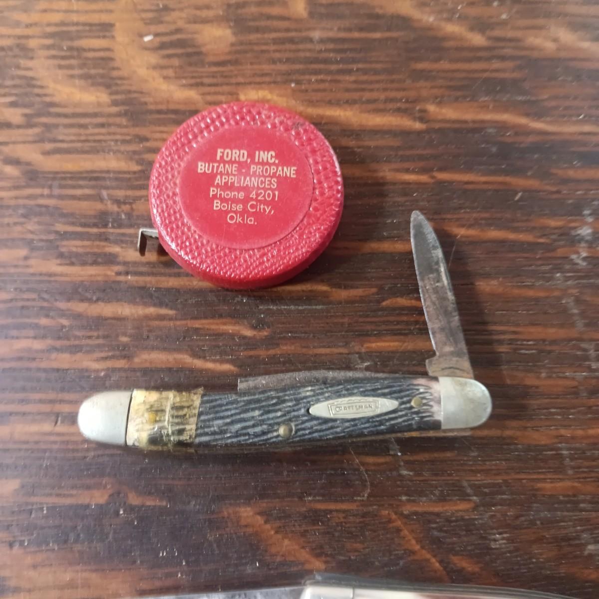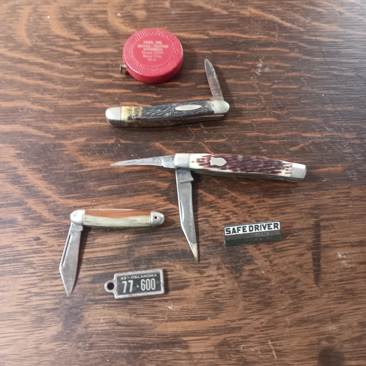 3 POCKET KNIVES, DAV PLATE, TAPE MEASURE AND METAL PIN