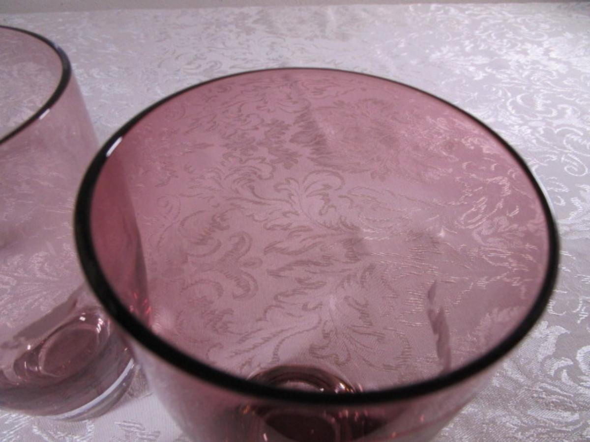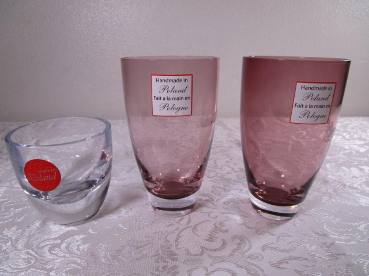 2 are rose colored and 6" tall & 3-1/4" diameter, 1 is clear and 3-1/2" tall & 3-1/2" in diameter. Made in Poland.