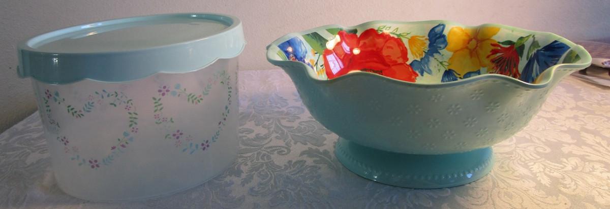 3 qt decorative plastic container with lid, Pioneer Woman Melmac bowl