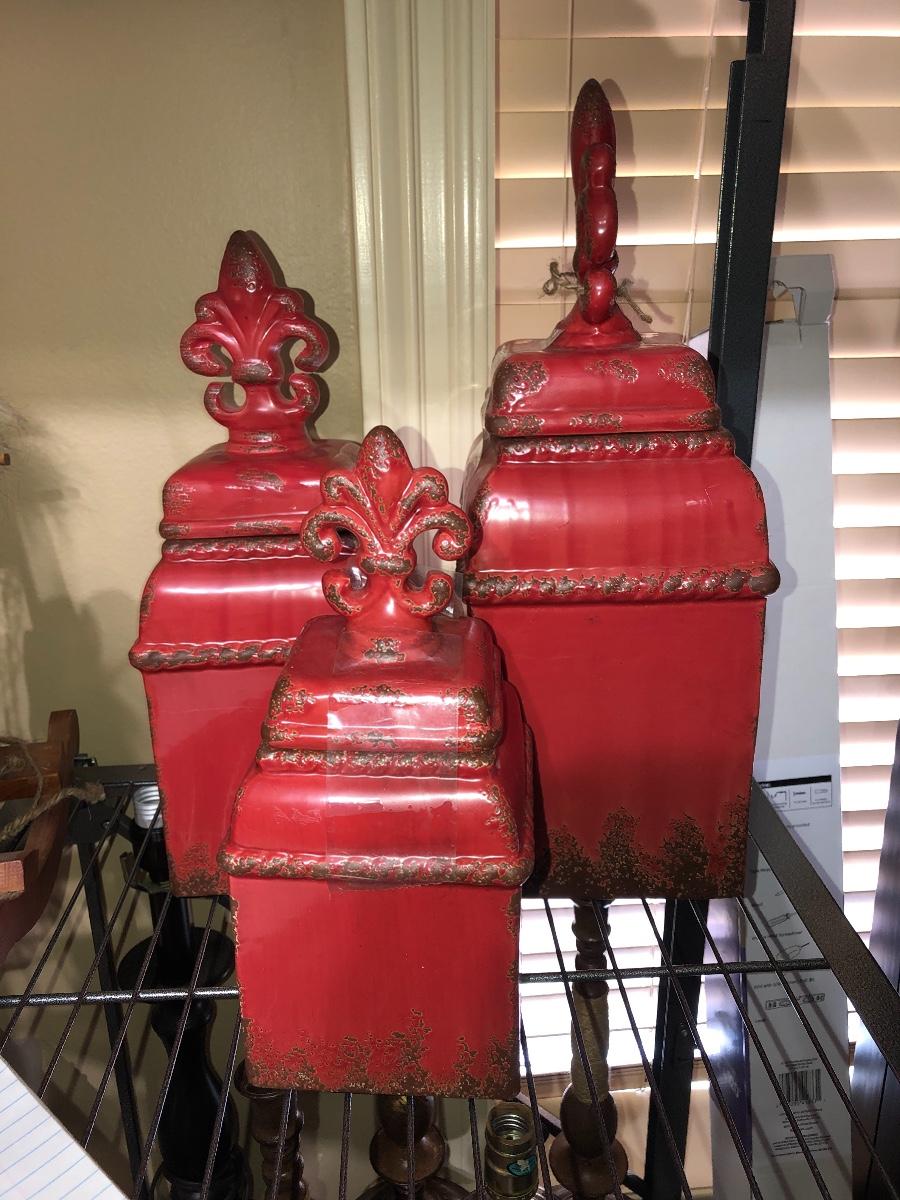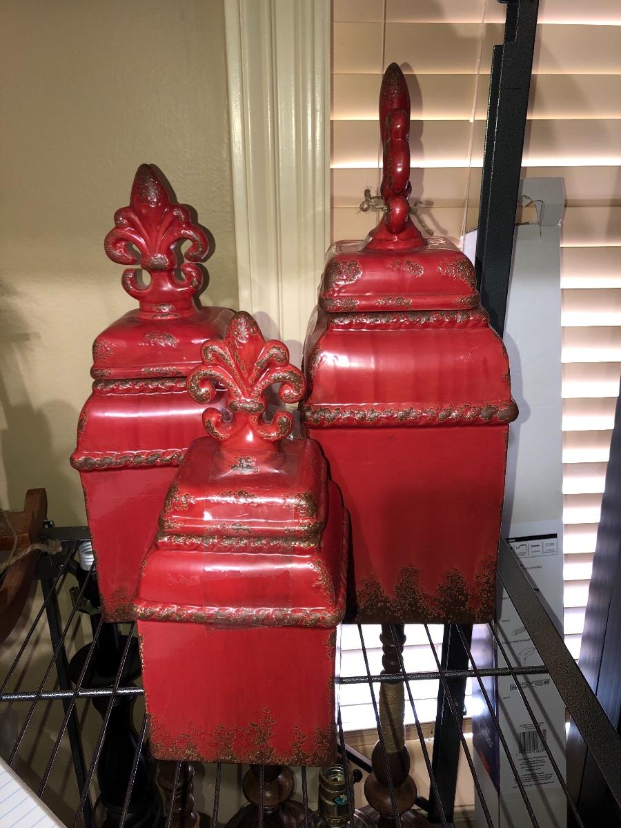 3 red storage canisters ranging from 11” to 16”. Great color and great for storage. They also have the fleur de lis design at top.