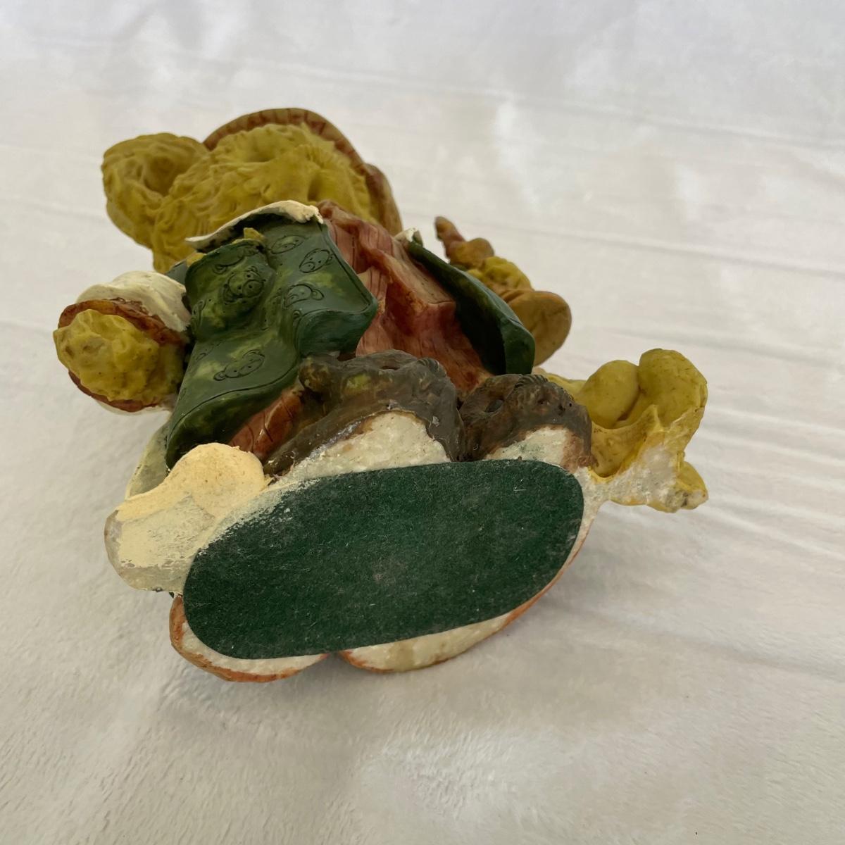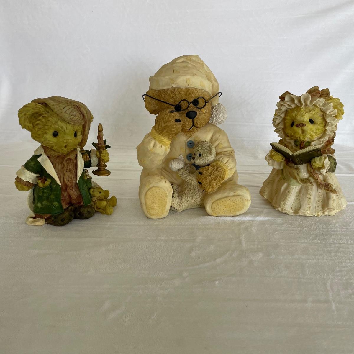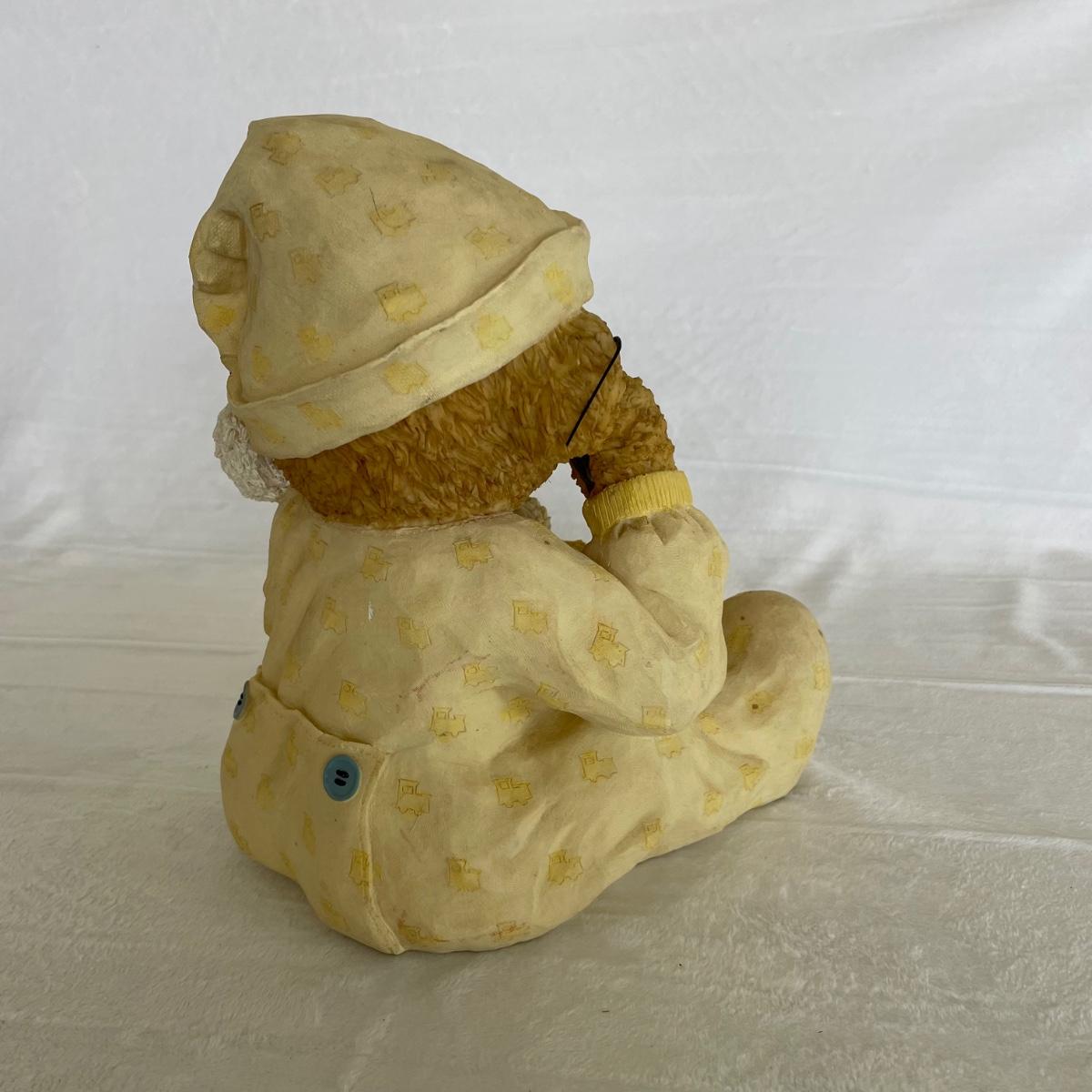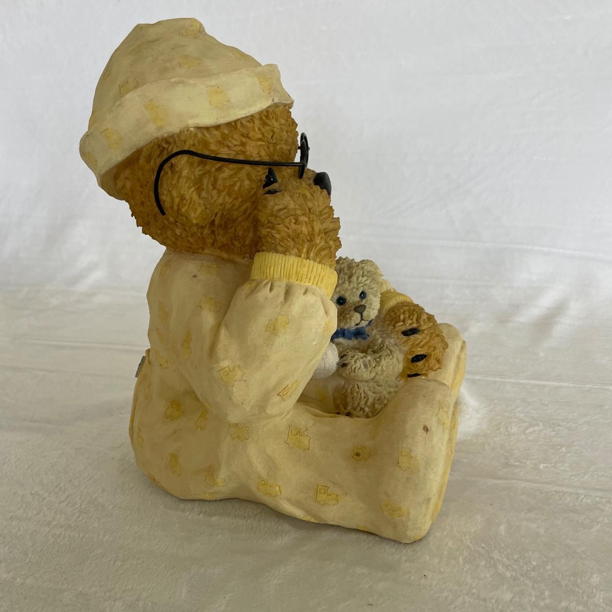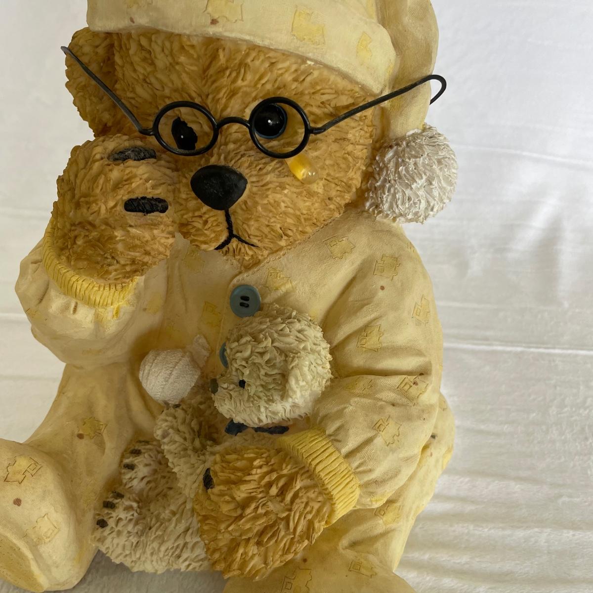 Resin Bear in train PJ’s holding baby bear with bandaged paw 11”H x 8”W x 7.5” L.