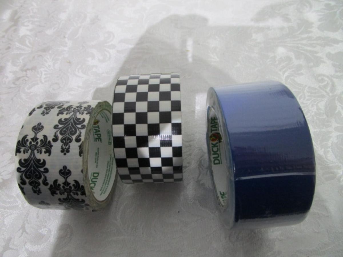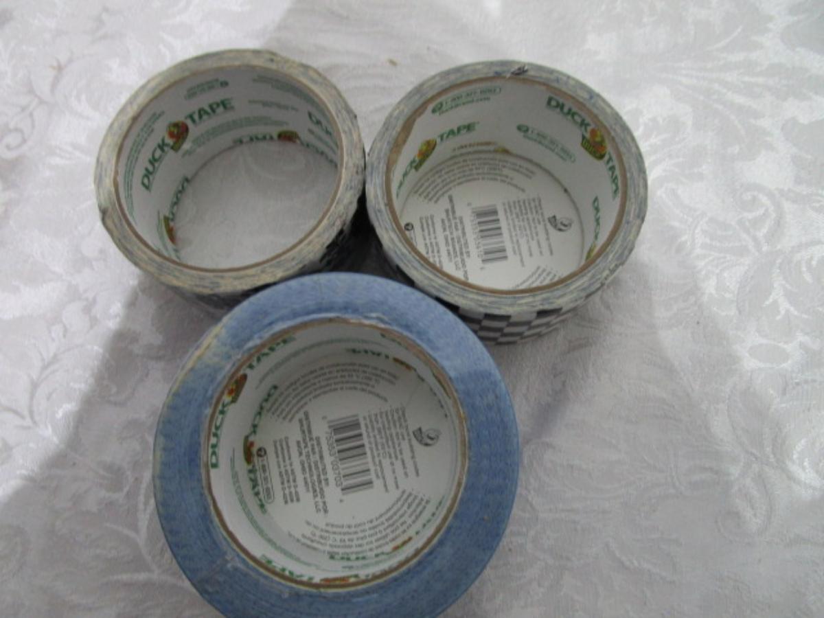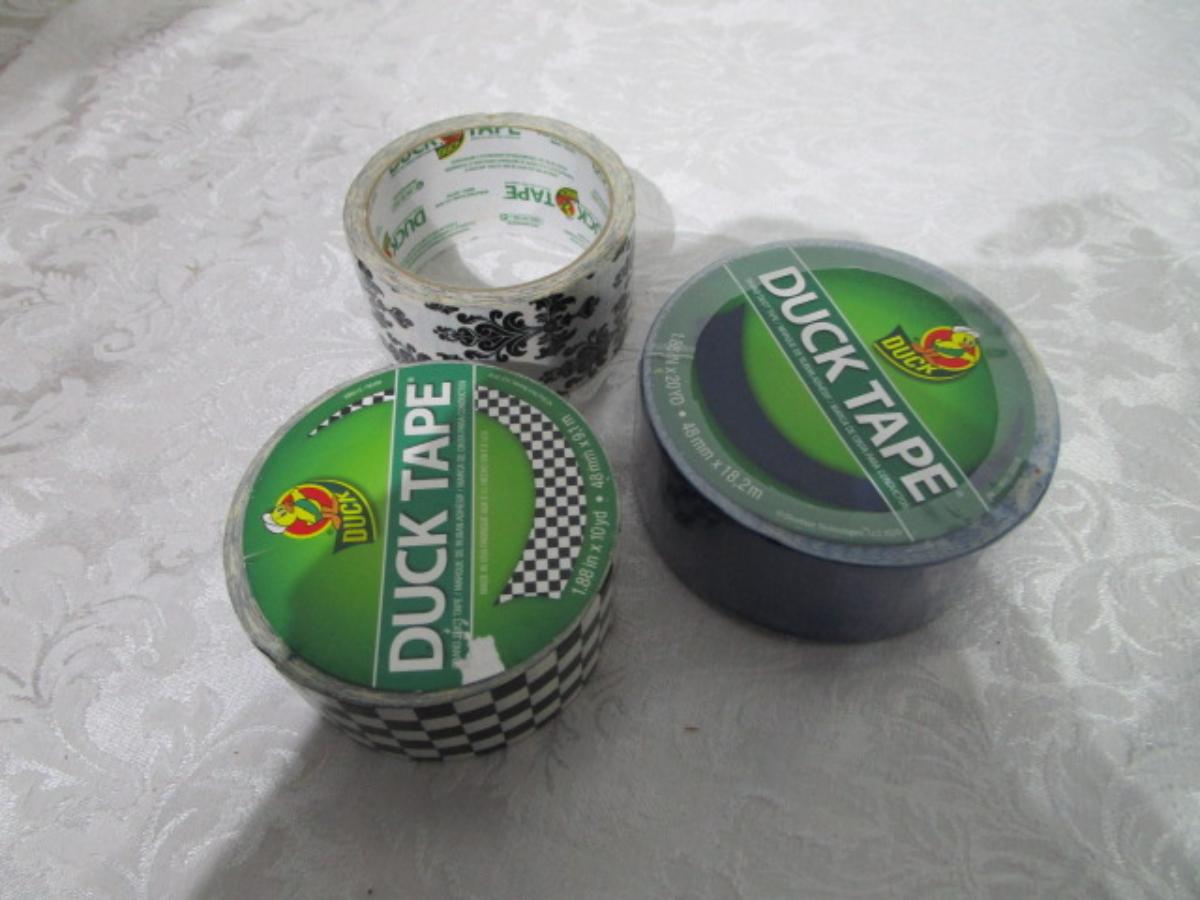 3 rolls of Duck Tape (1 Blue, 1 Black & White Checked, 1 Black & White print )