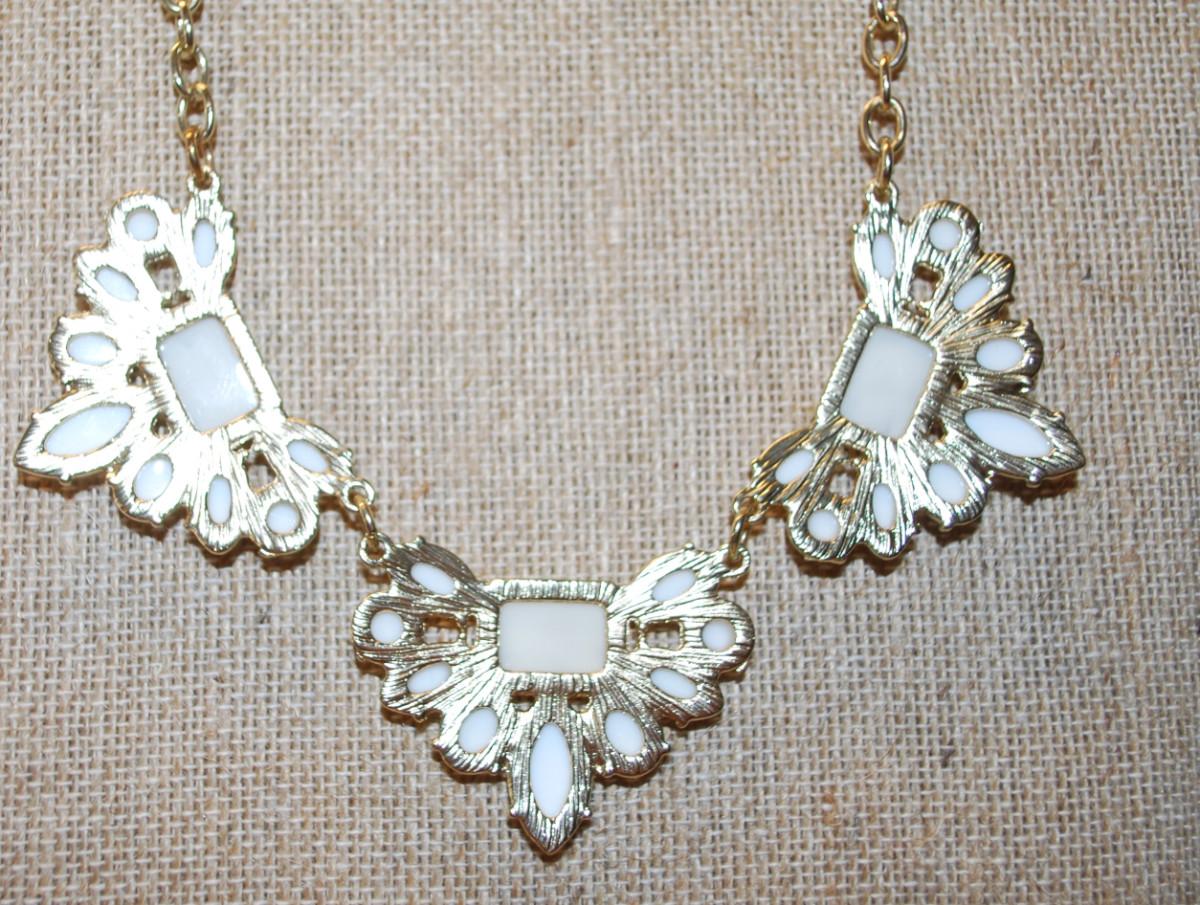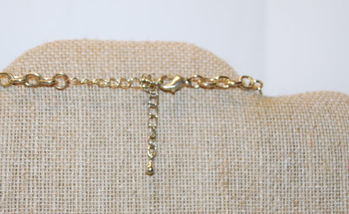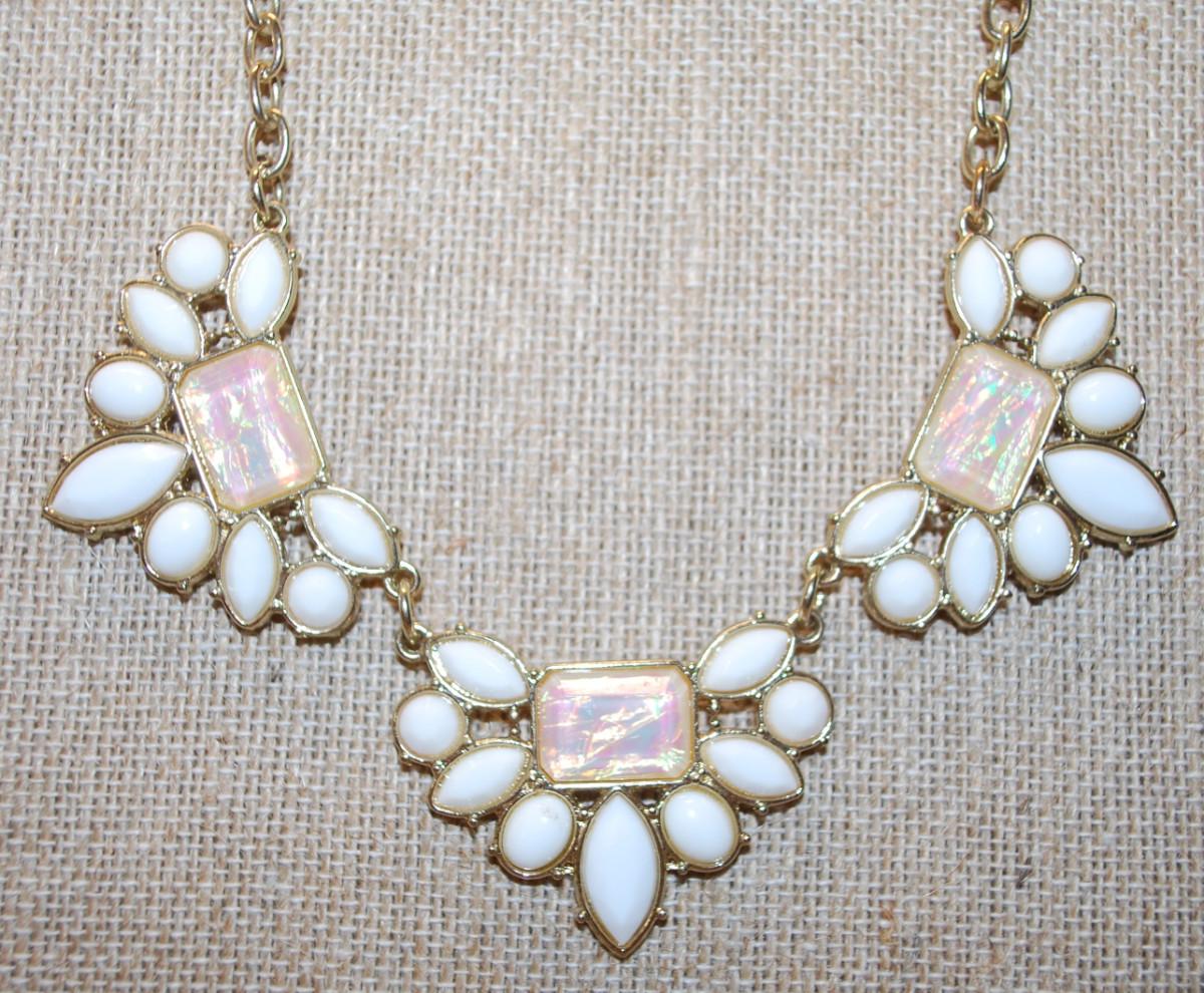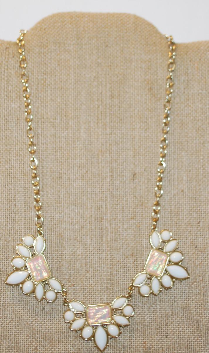 3 Section Necklace with White Opaque & Green/Pink Iridescent Rectangular Accent Stones on Gold Tone Chain 14" L