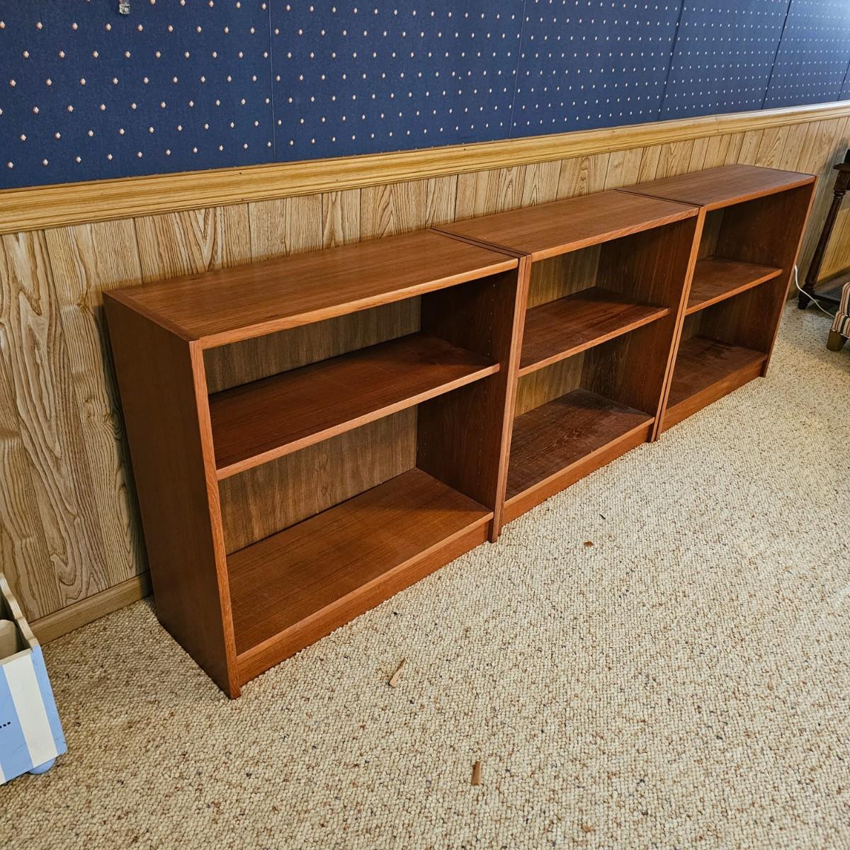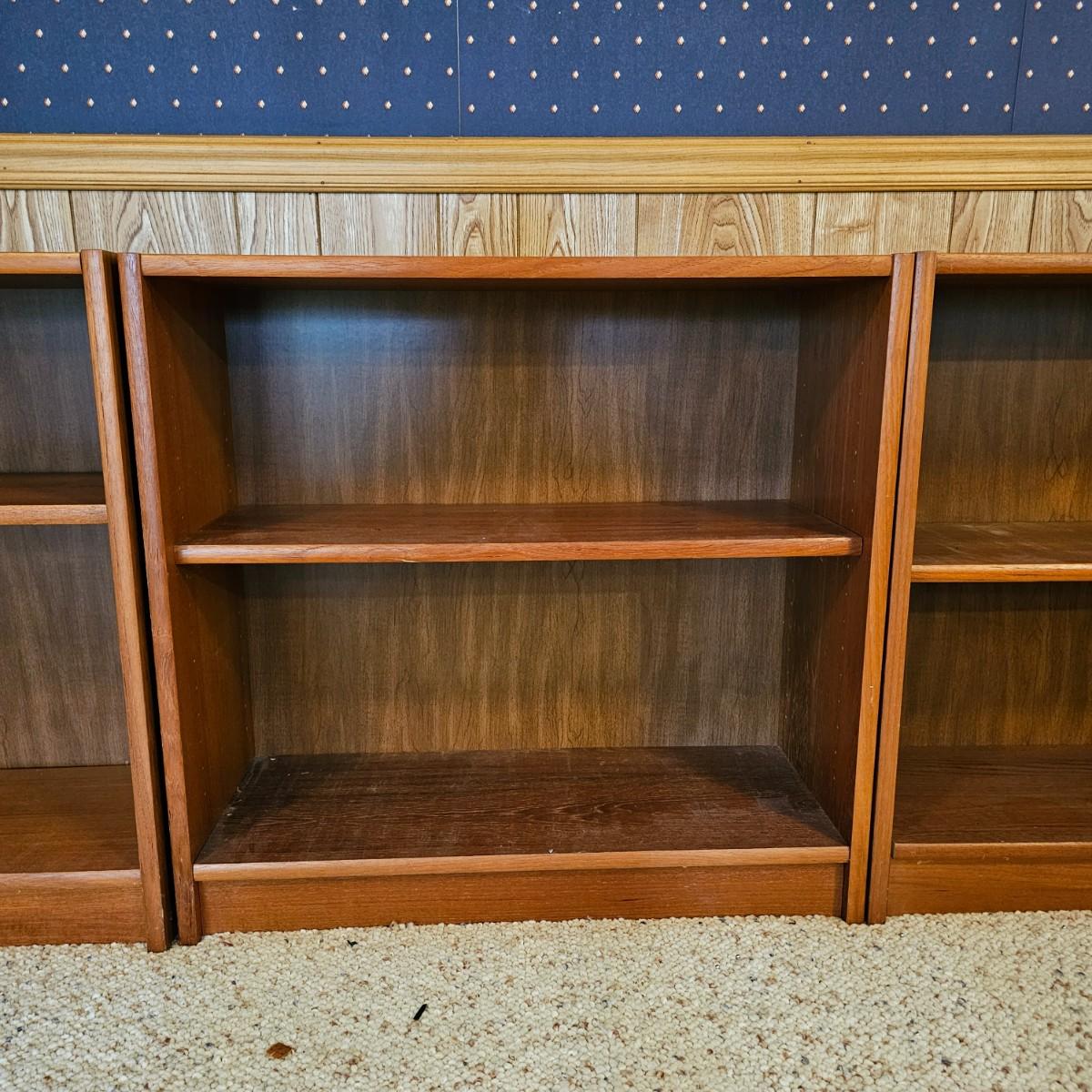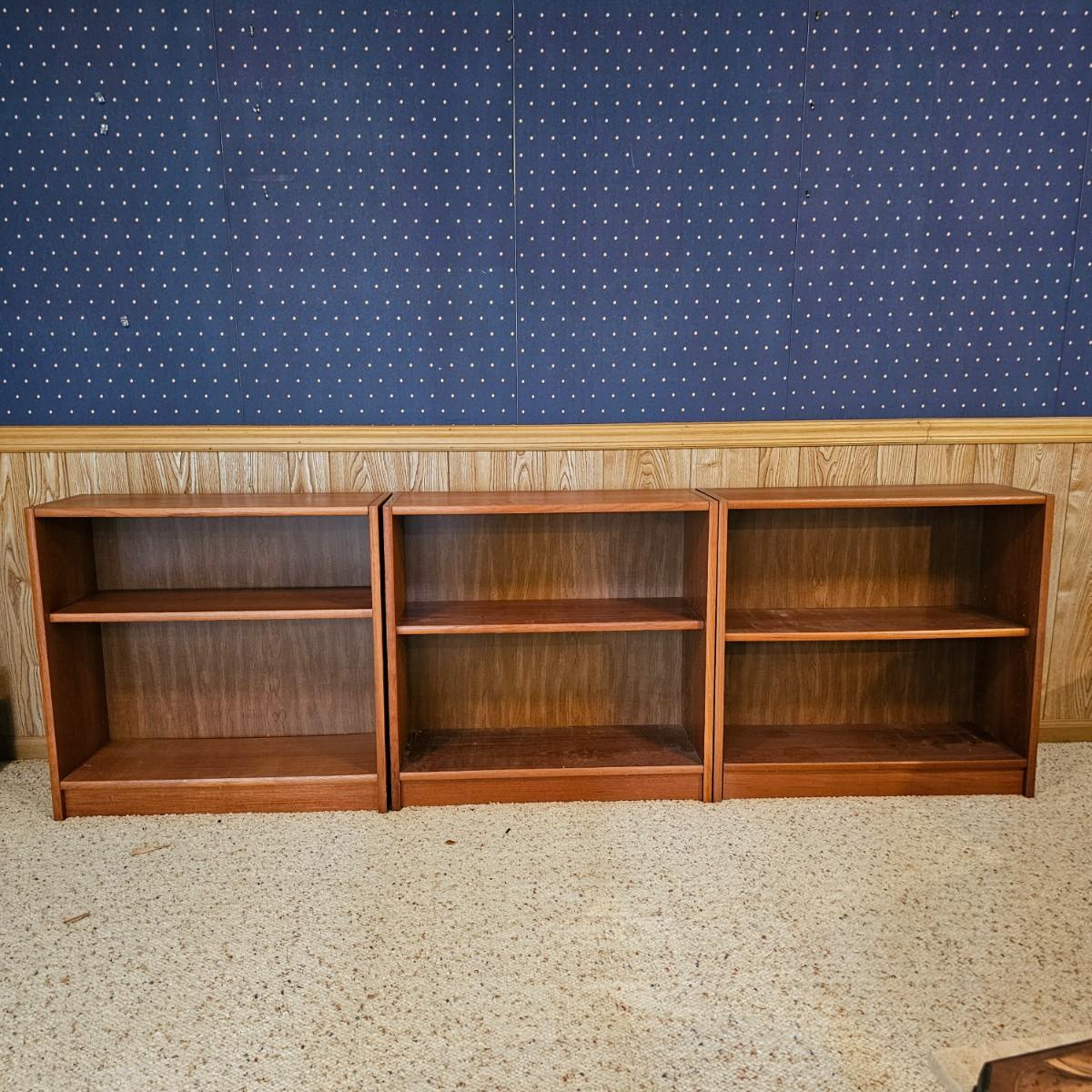 Three matching shelf units with adjustable shelves. Units are particle board with masonite backs. Each piece measures 30" x 11.5" x 29:H. See photos for details. Local pickup only.