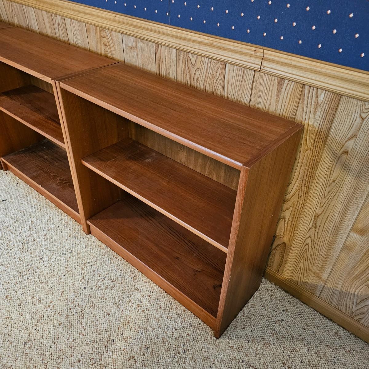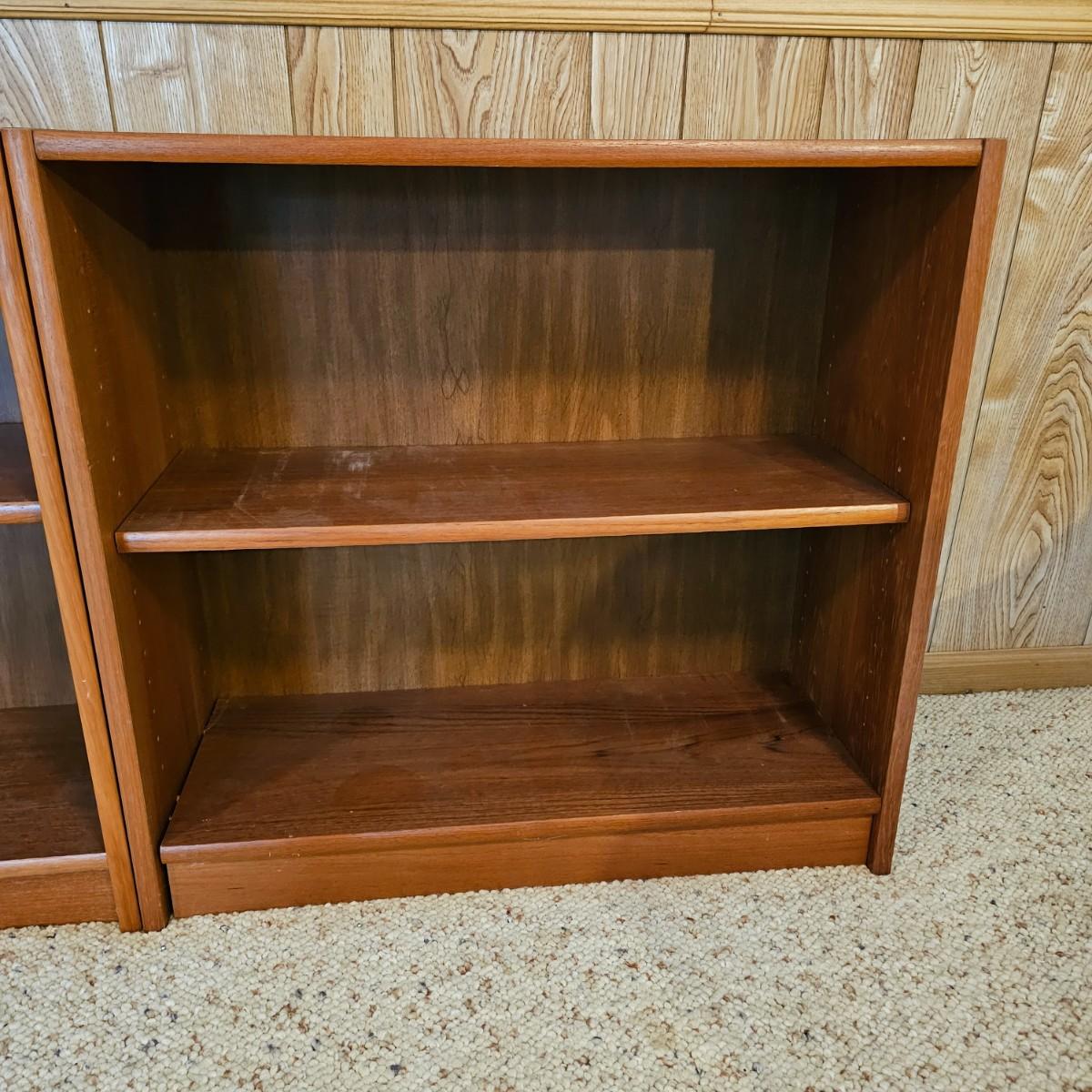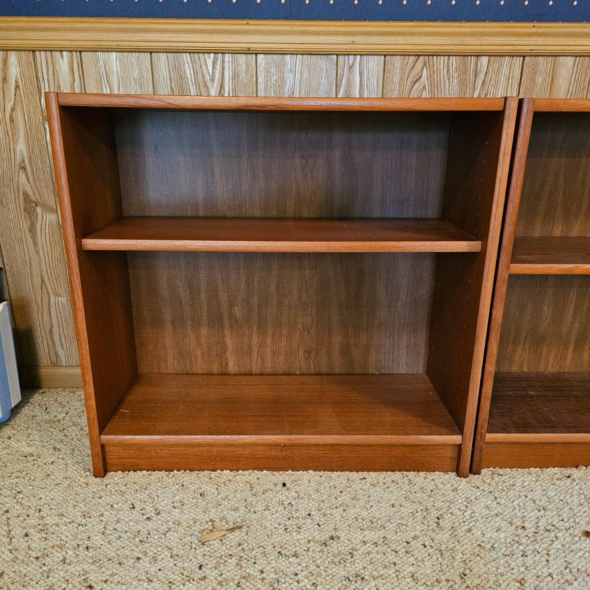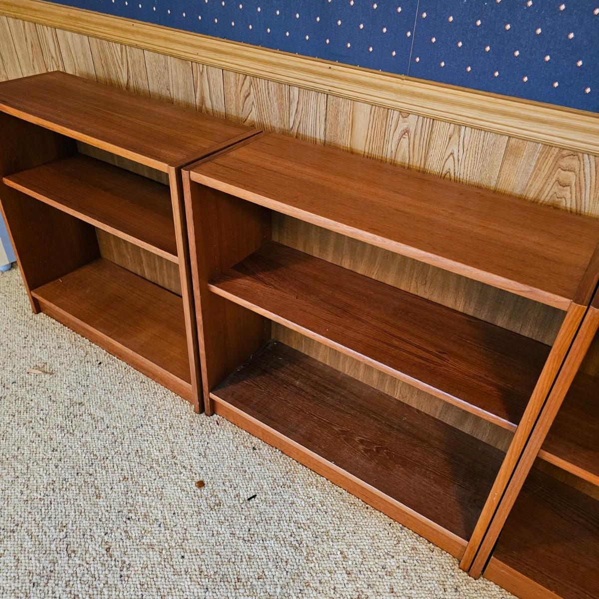Three matching shelf units with adjustable shelves. Units are particle board with masonite backs. Each piece measures 30" x 11.5" x 29:H. See photos for details. Local pickup only.