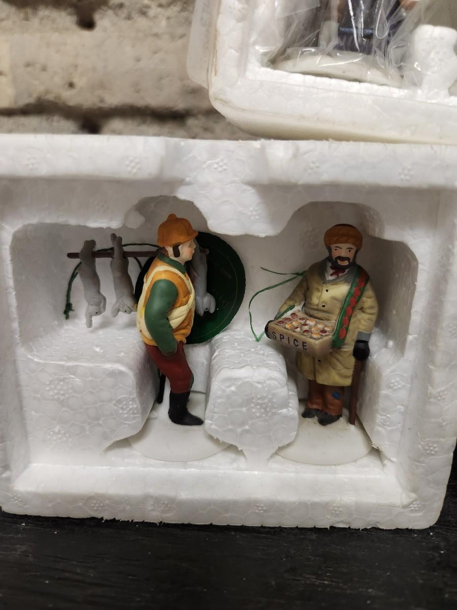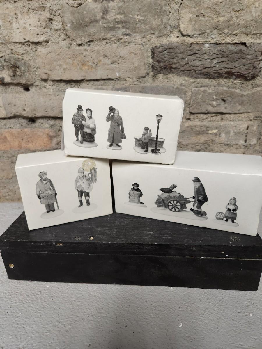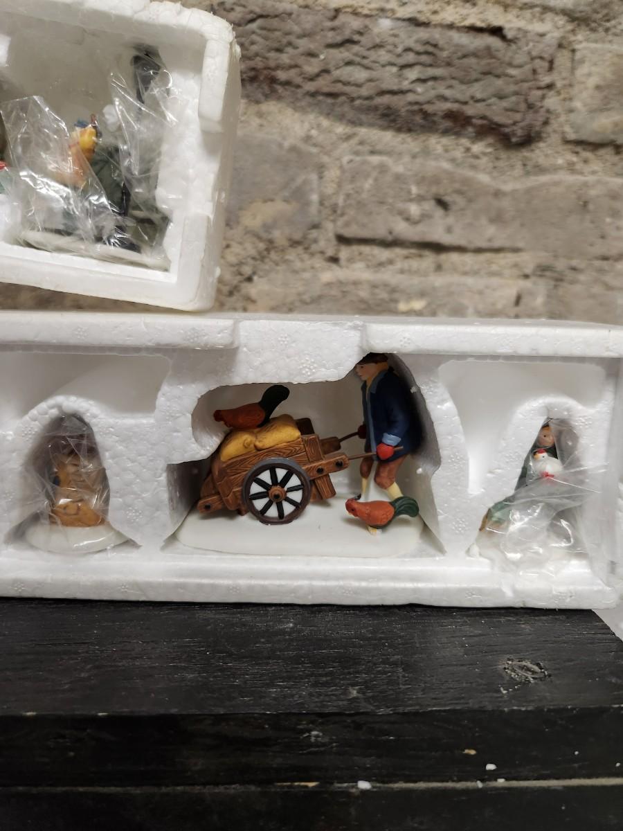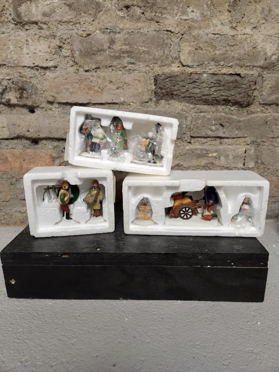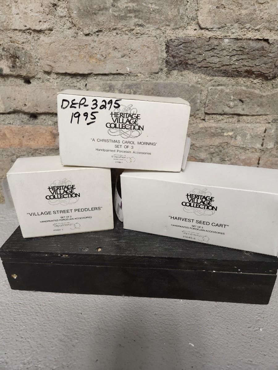 3 Sets in boxes of Dept 56 accessories. Village street pedlerst, a Christmas Carol morning and Harvest Seed Cart