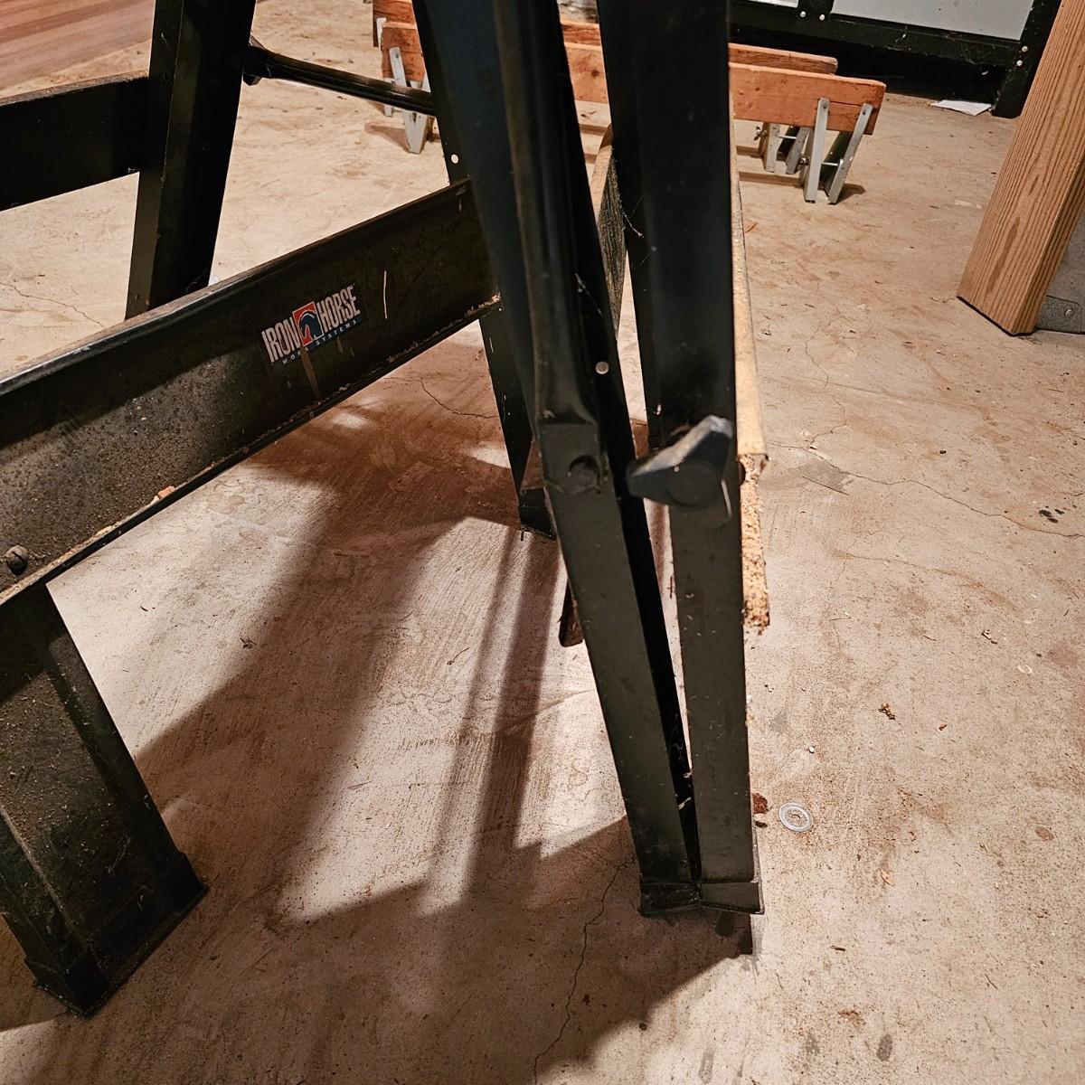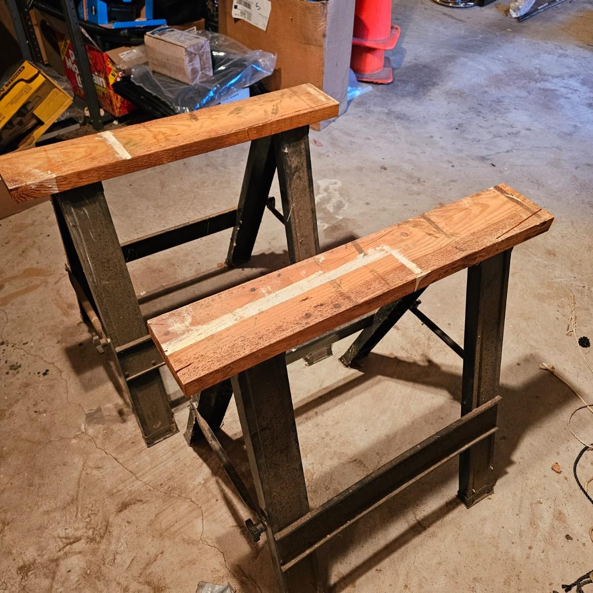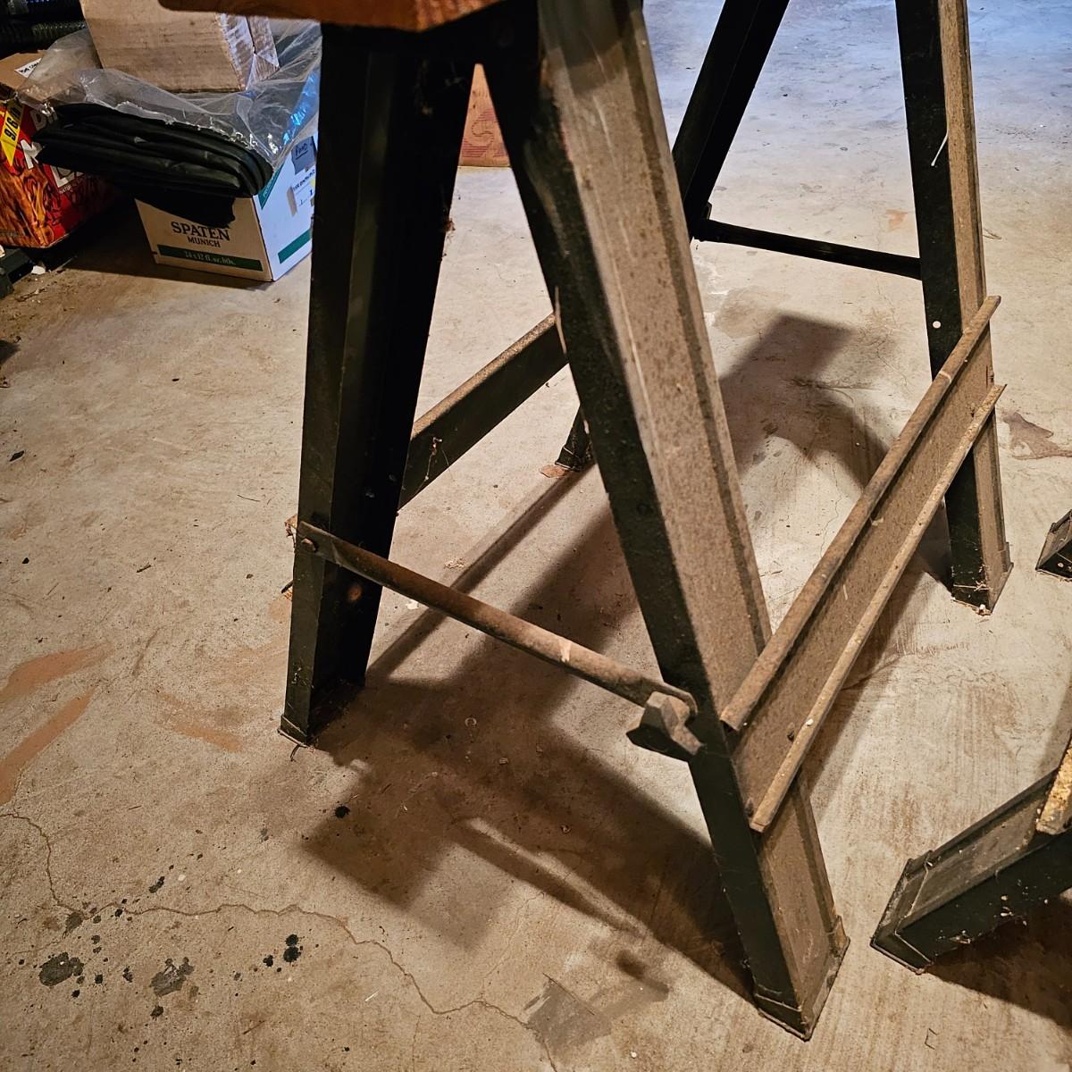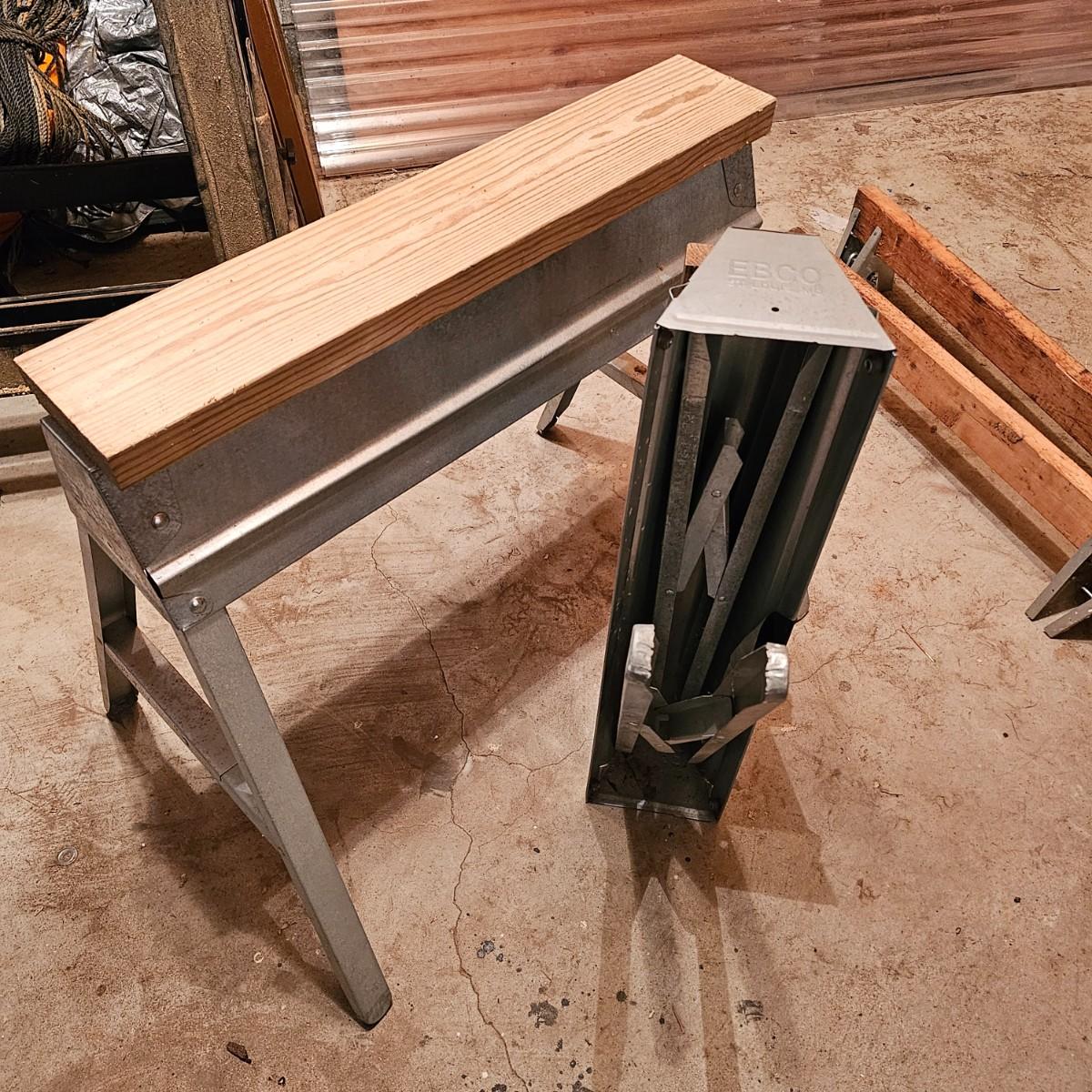 Three pairs of portable sawhorses. One set is just tops and brackets and will need legs added. It measures 36" x 6" x 8"H. Black Iron Horse units fold flat for storage. They measure 32" x 20" x 30"H when open and fold to 6" thick. The aluminum pair are by Ebco and fold up completely with the legs inside the top. When open these measure 36" x 24" x 30"H and folded they are 31" x 7" x 8"H. Wood tops on all. See photos for details. Local pickup only.